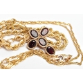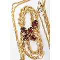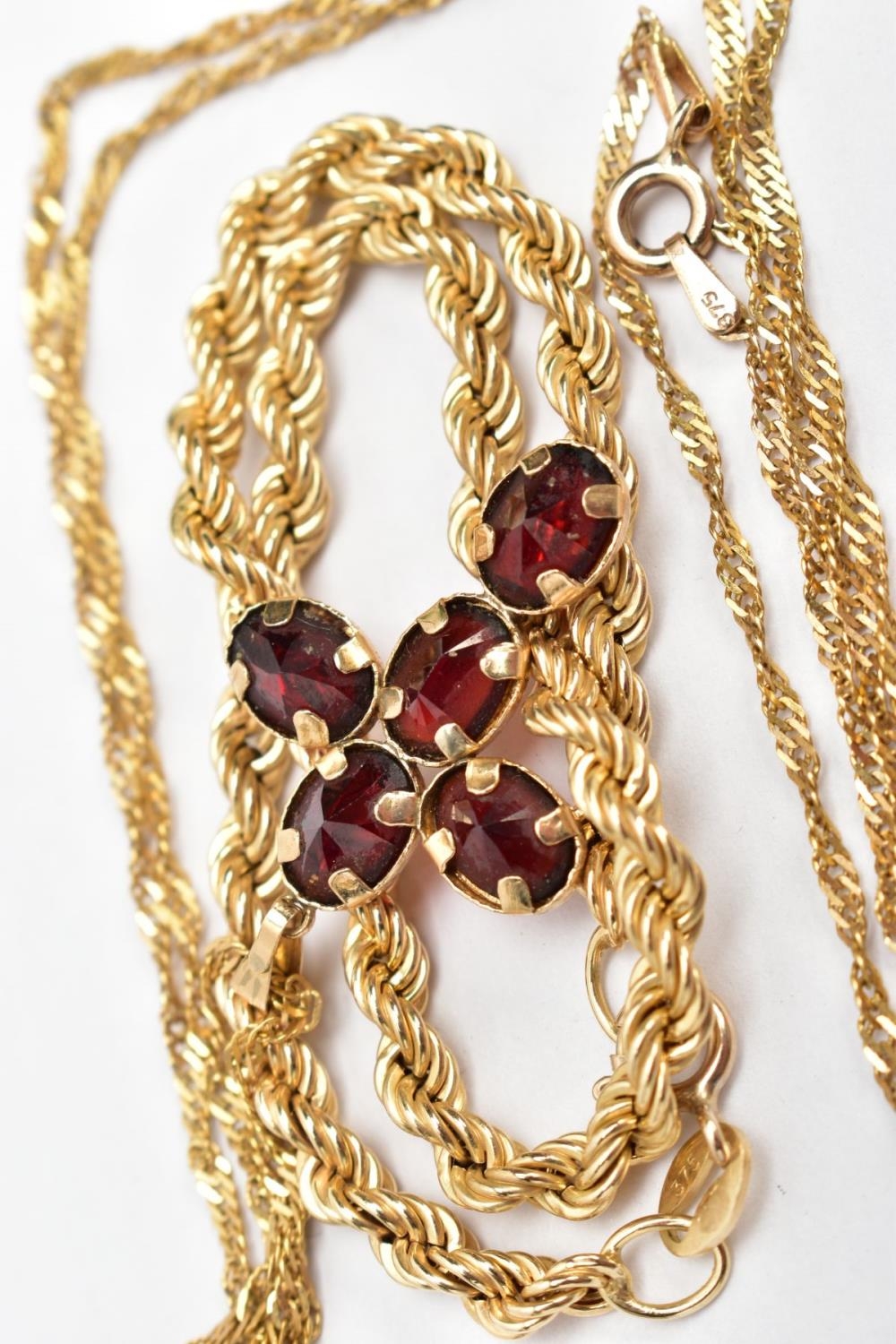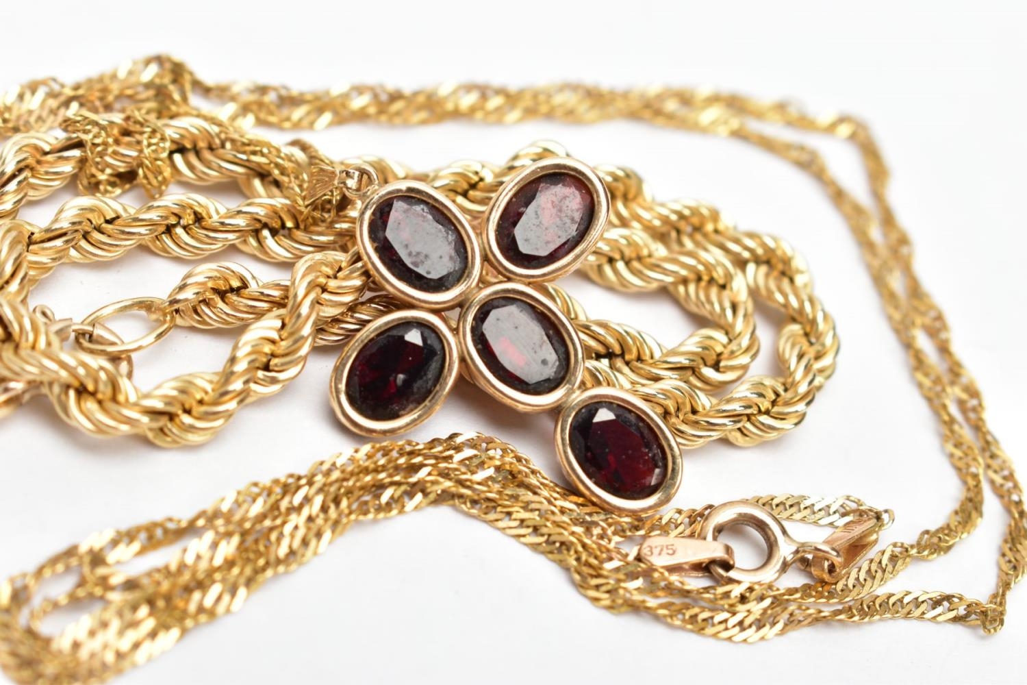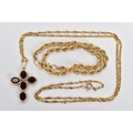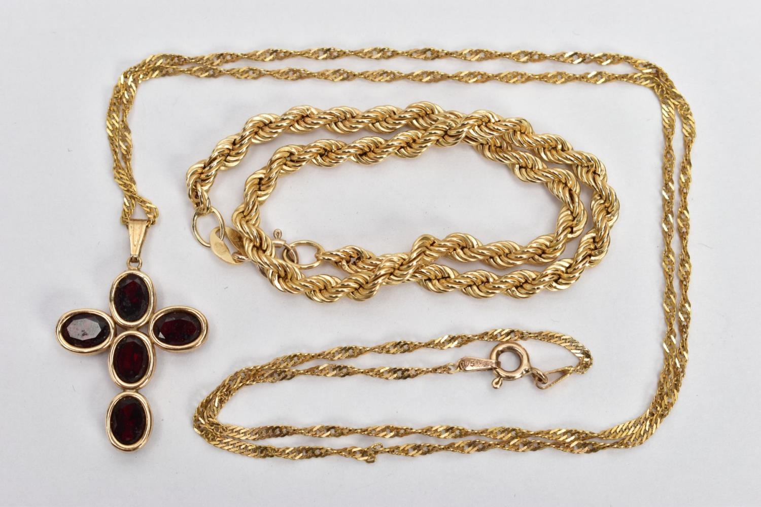 A 9CT GOLD ROPE TWIST BRACELET AND A GARNET CROSS PENDANT NECKLACE, hollow rope twist bracelet fitted with a spring clasp, hallmarked 9ct gold Sheffield import, length 230mm, together with a cross pendant set with five oval cut garnets, each collet mounted in yellow metal, fitted with a yellow metal tapered bail, suspended from a fine twist chain fitted with a spring clasp hallmarked 9ct gold Sheffield, length 500mm, approximate gross weight 5.8 grams