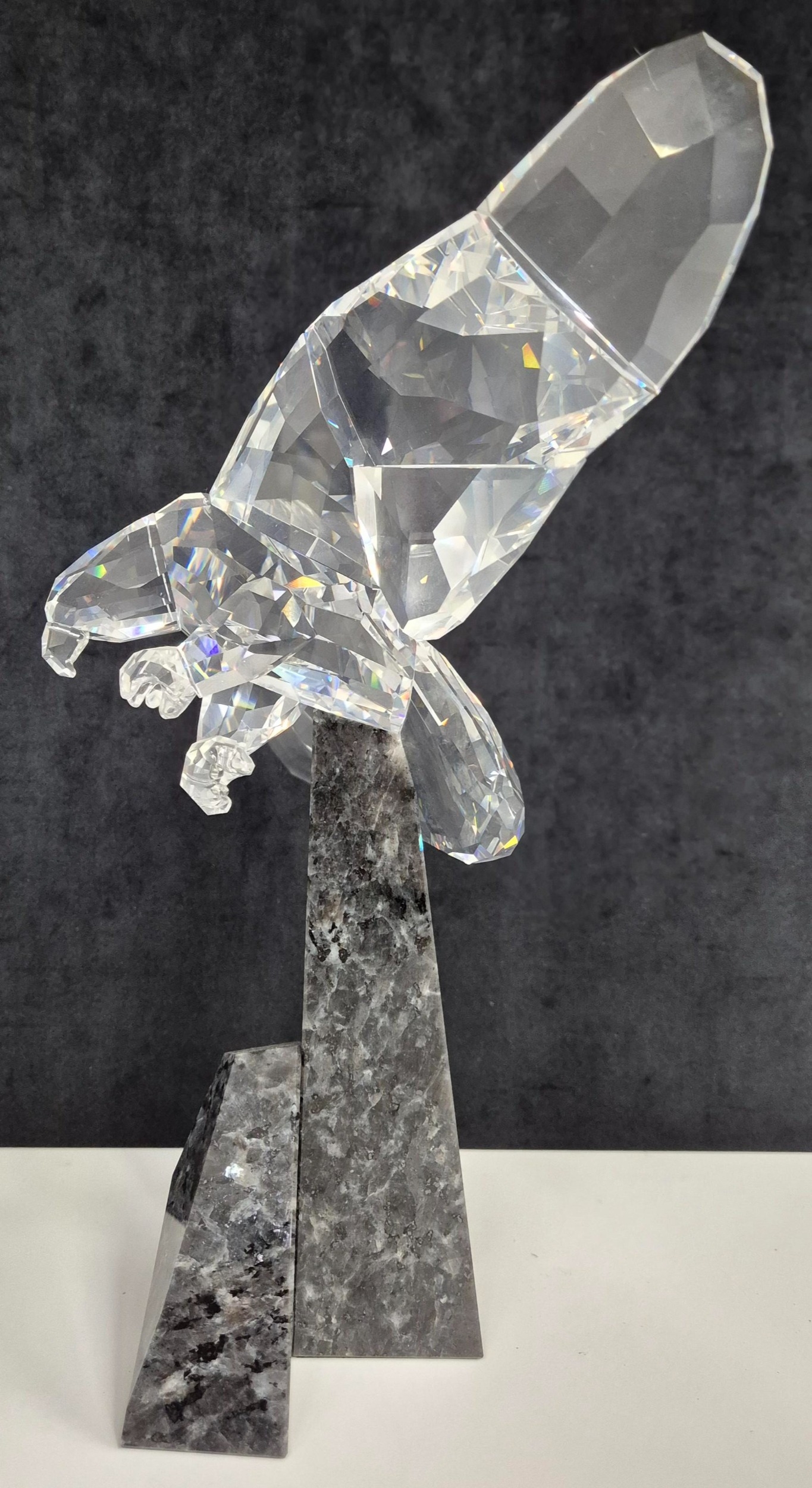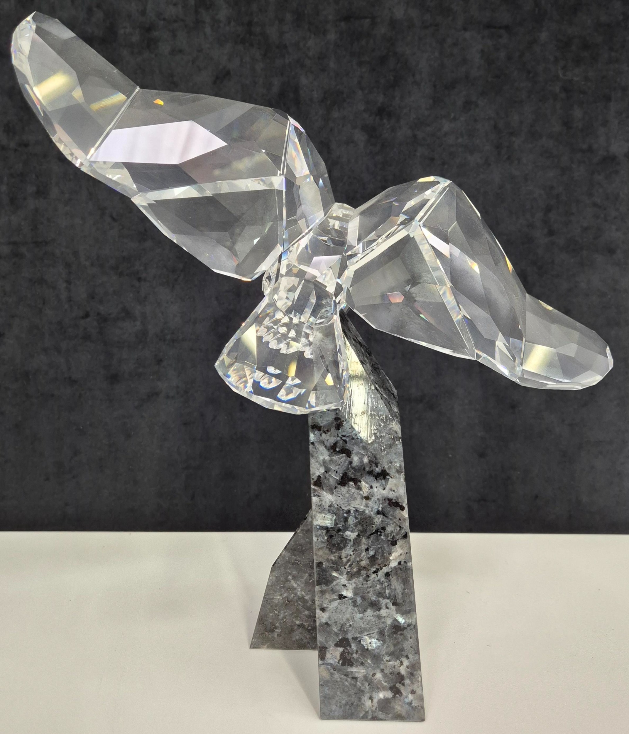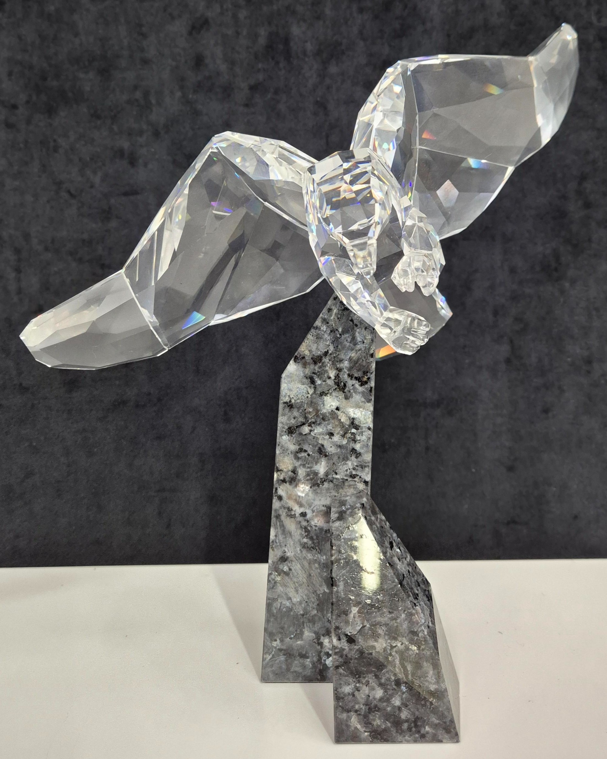 This retired Swarovski crystal Soulmate Eagle was part of the Soulmates range. Freedom is represented by this fully faceted clear crystal eagle with open wing-span as if soaring through the air. Majestically perched on a cut blue pearl granite base.
