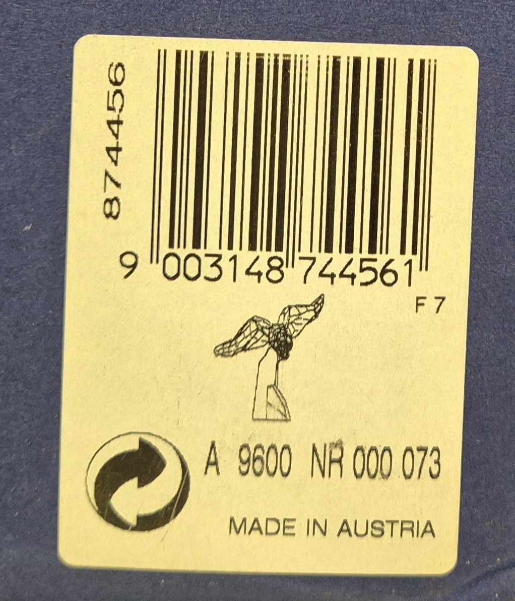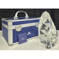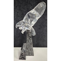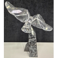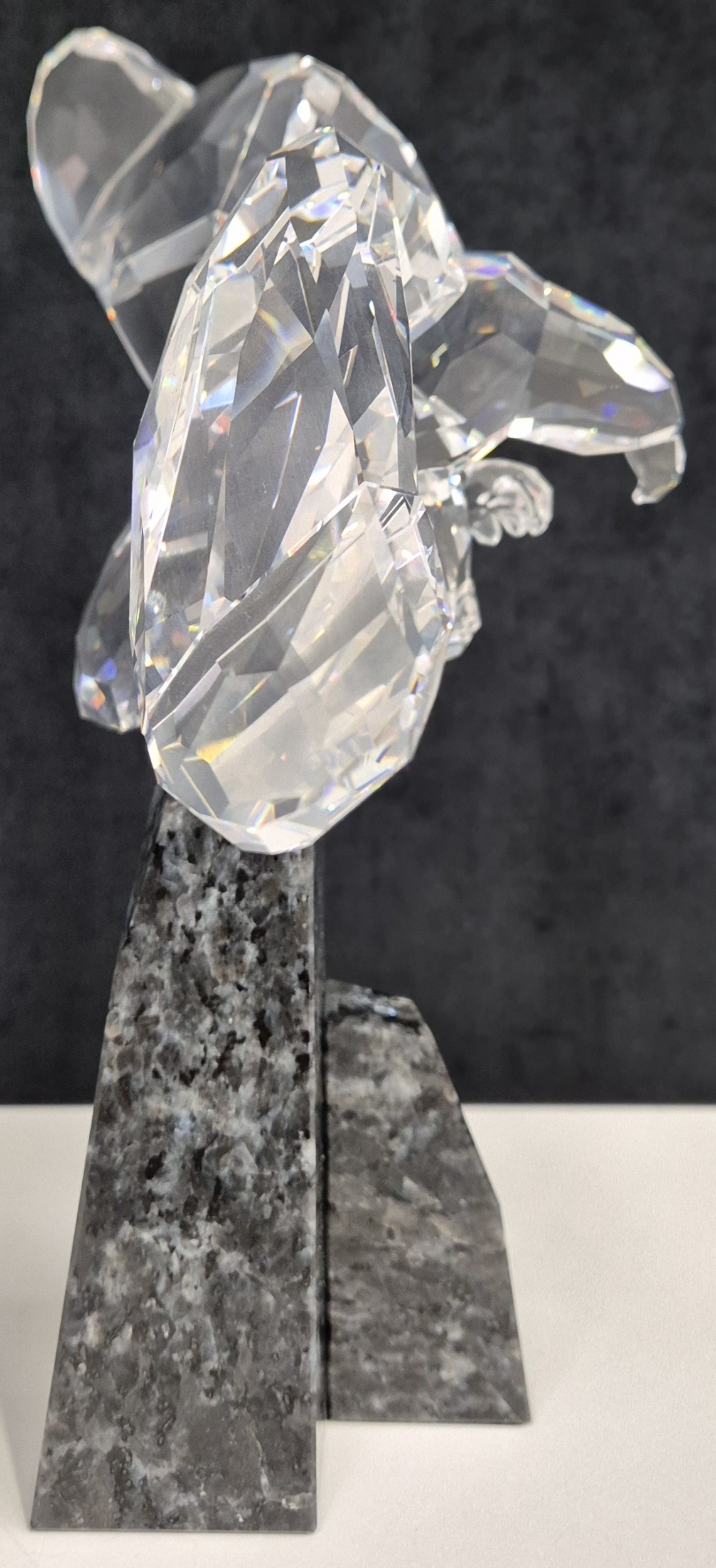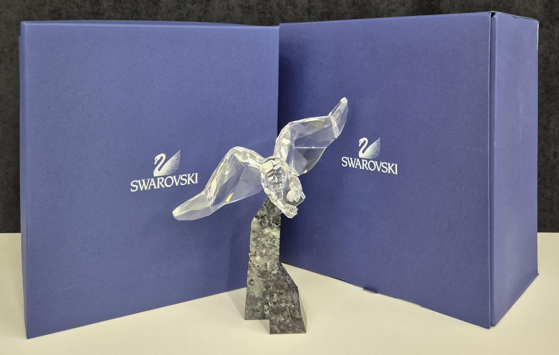 This retired Swarovski crystal Soulmate Eagle was part of the Soulmates range. Freedom is represented by this fully faceted clear crystal eagle with open wing-span as if soaring through the air. Majestically perched on a cut blue pearl granite base.