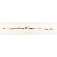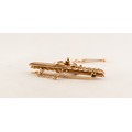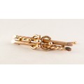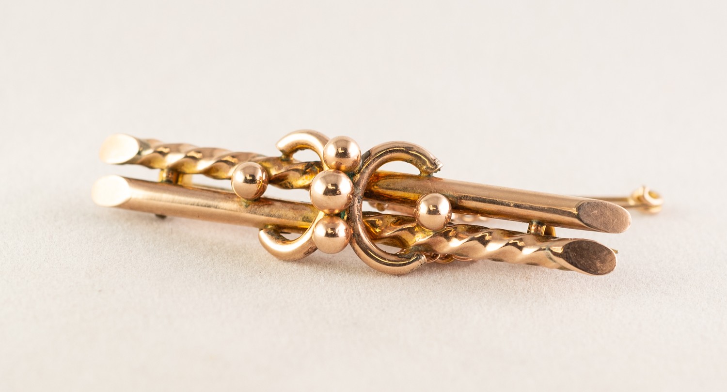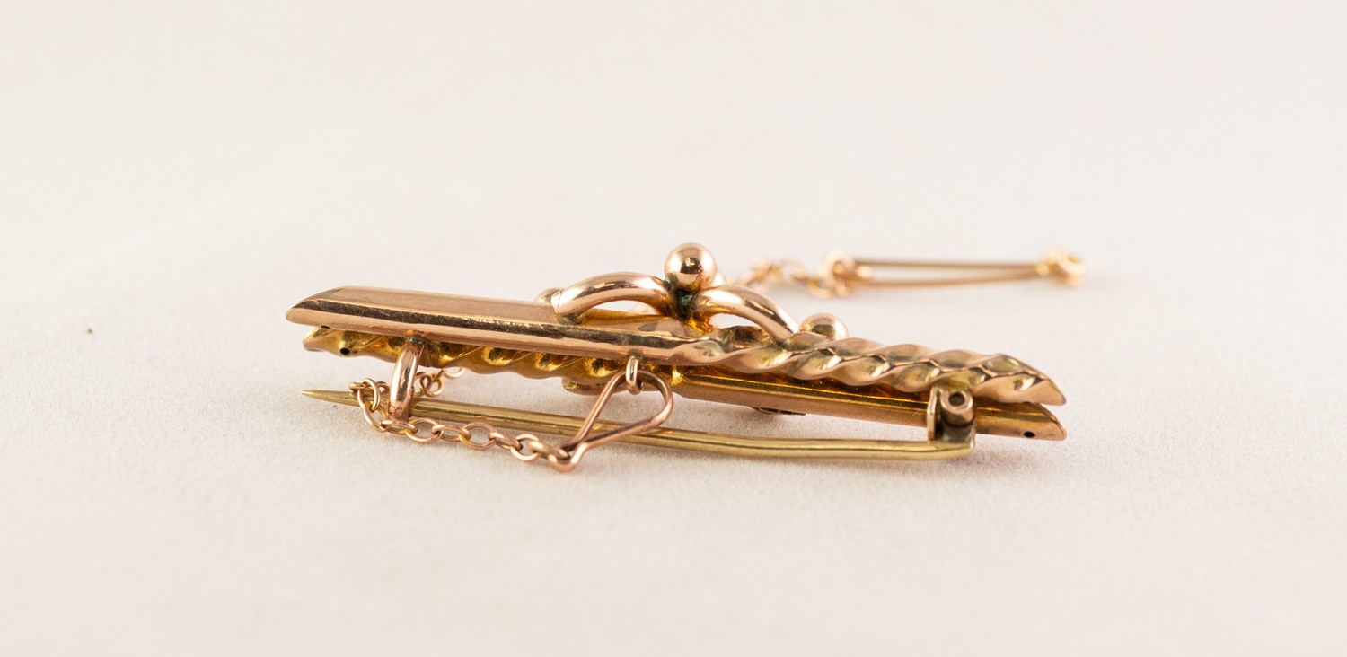 9ct GOLD TWO STRAND BAR BROOCH, with double 'C' scroll centre having beaded decoration, safety chain, 3.1gms