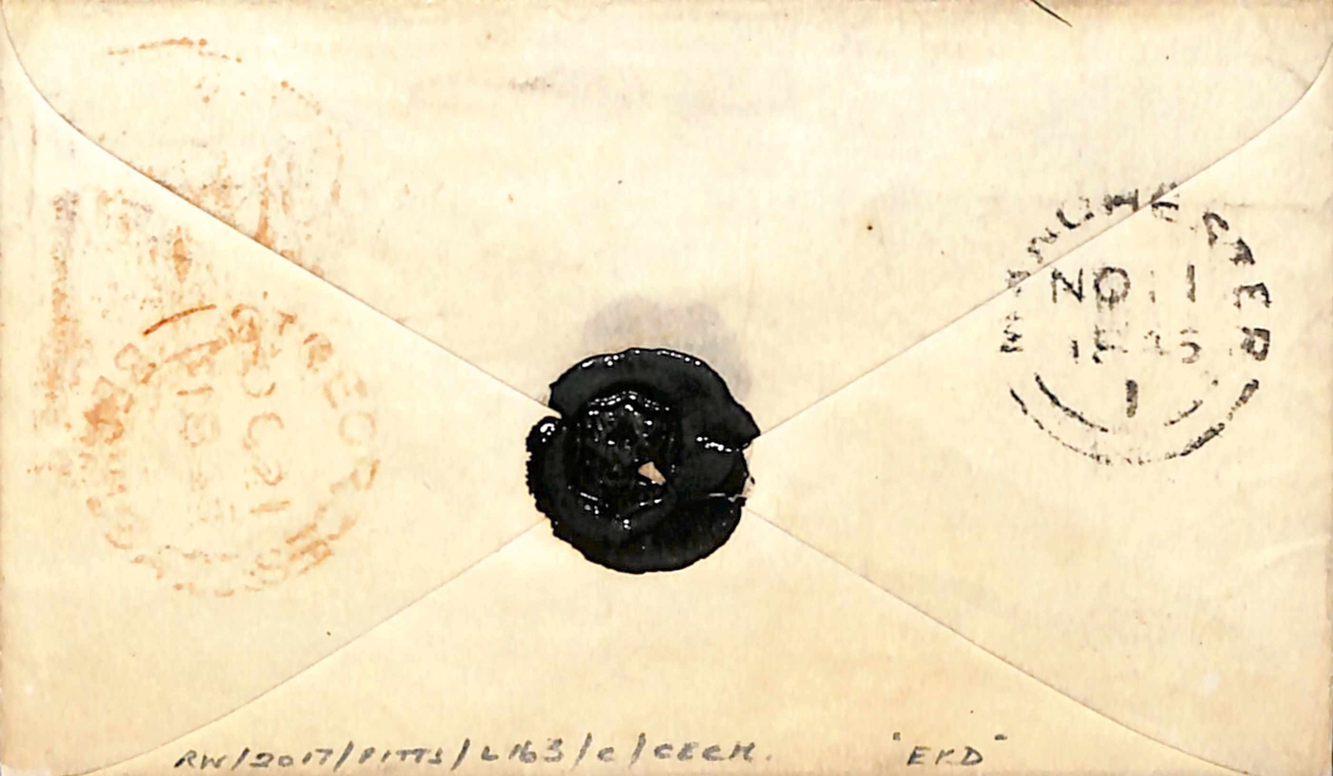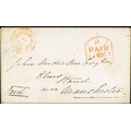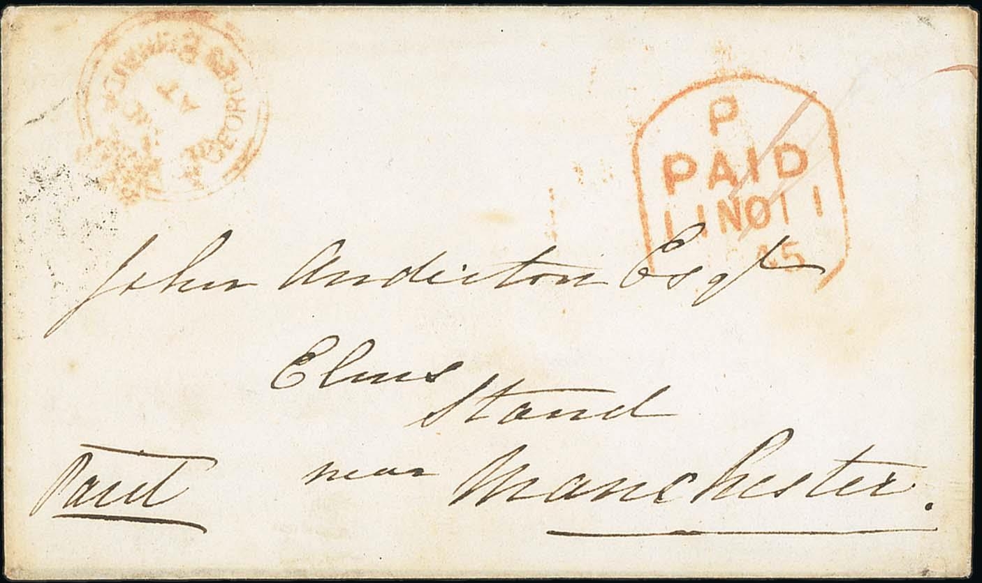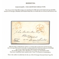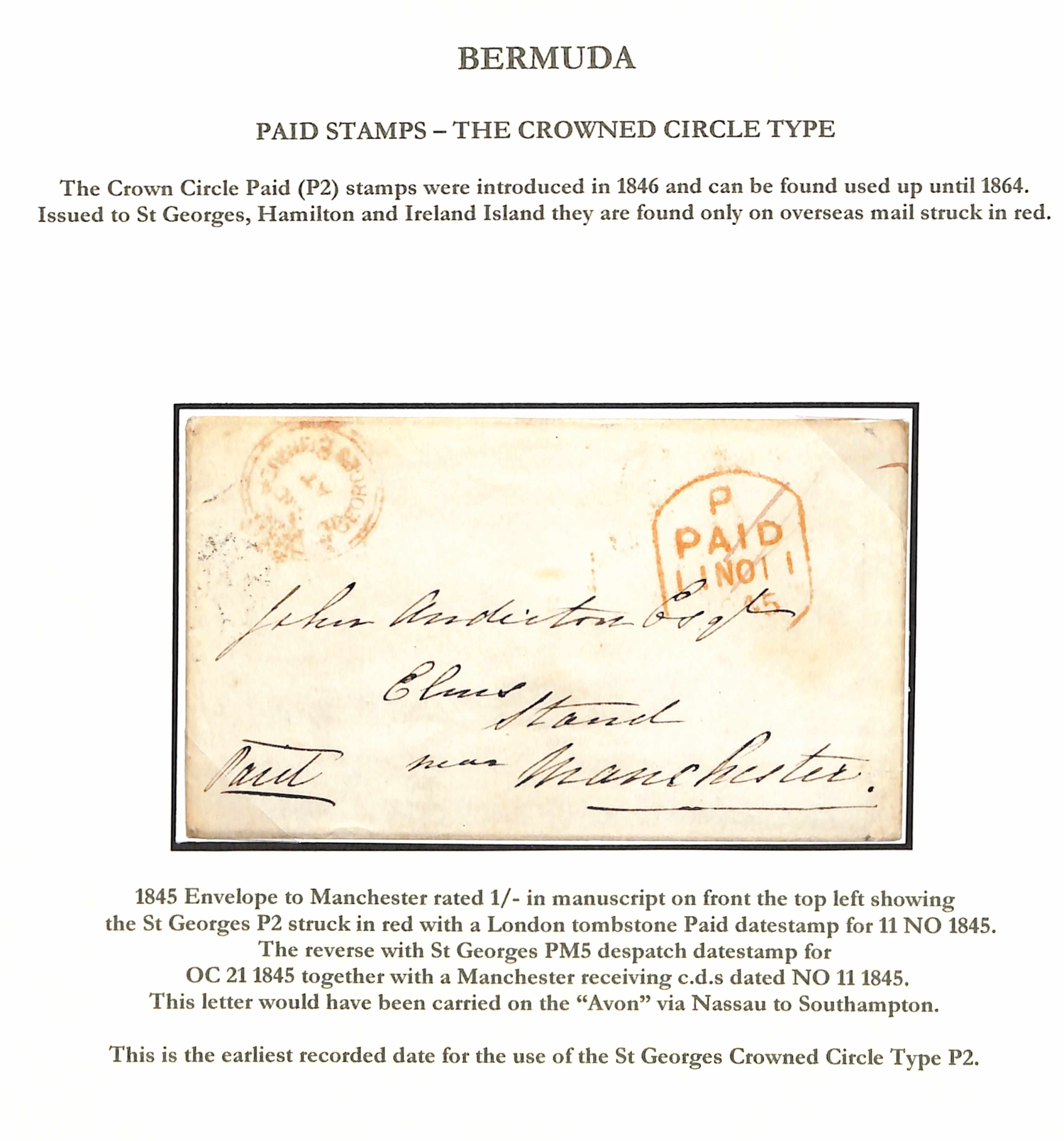 St. Georges. 1845 (Oct 21) Cover prepaid 1/- to England with red St. Georges crowned circle and London Paid arrival datestamp on the front, red St. Georges backstamp, carried on the "Avon" via Nassau to Southampton. The earliest recorded crowned circle handstamp of Bermuda. S.G. £8,500. Photo on Inside Front Cover.