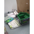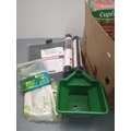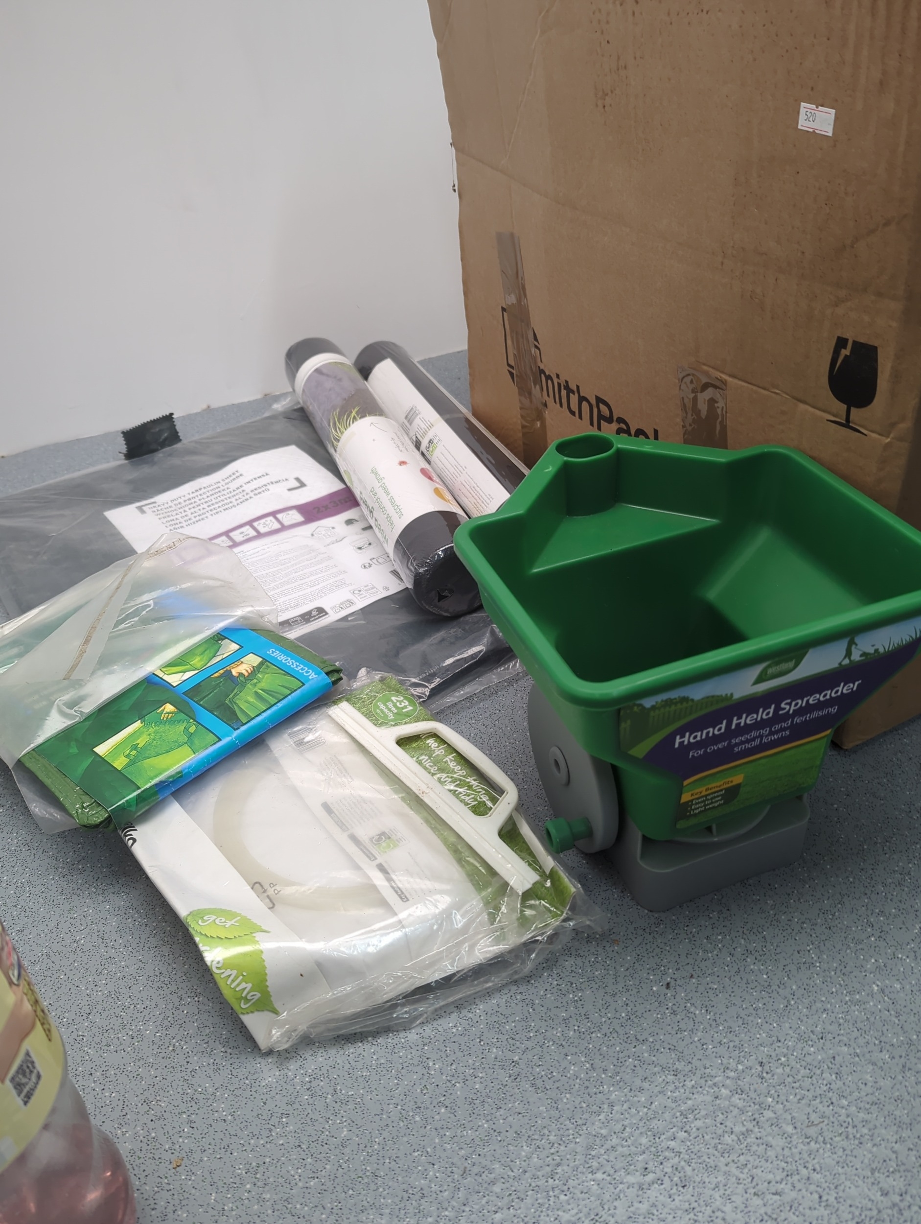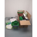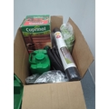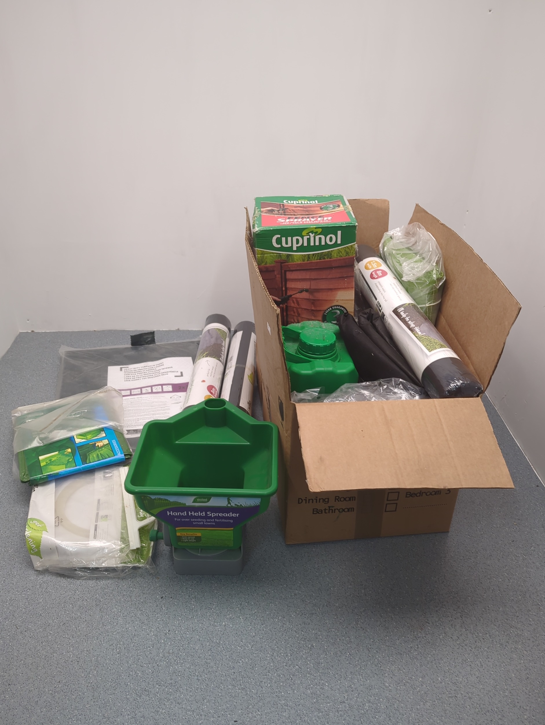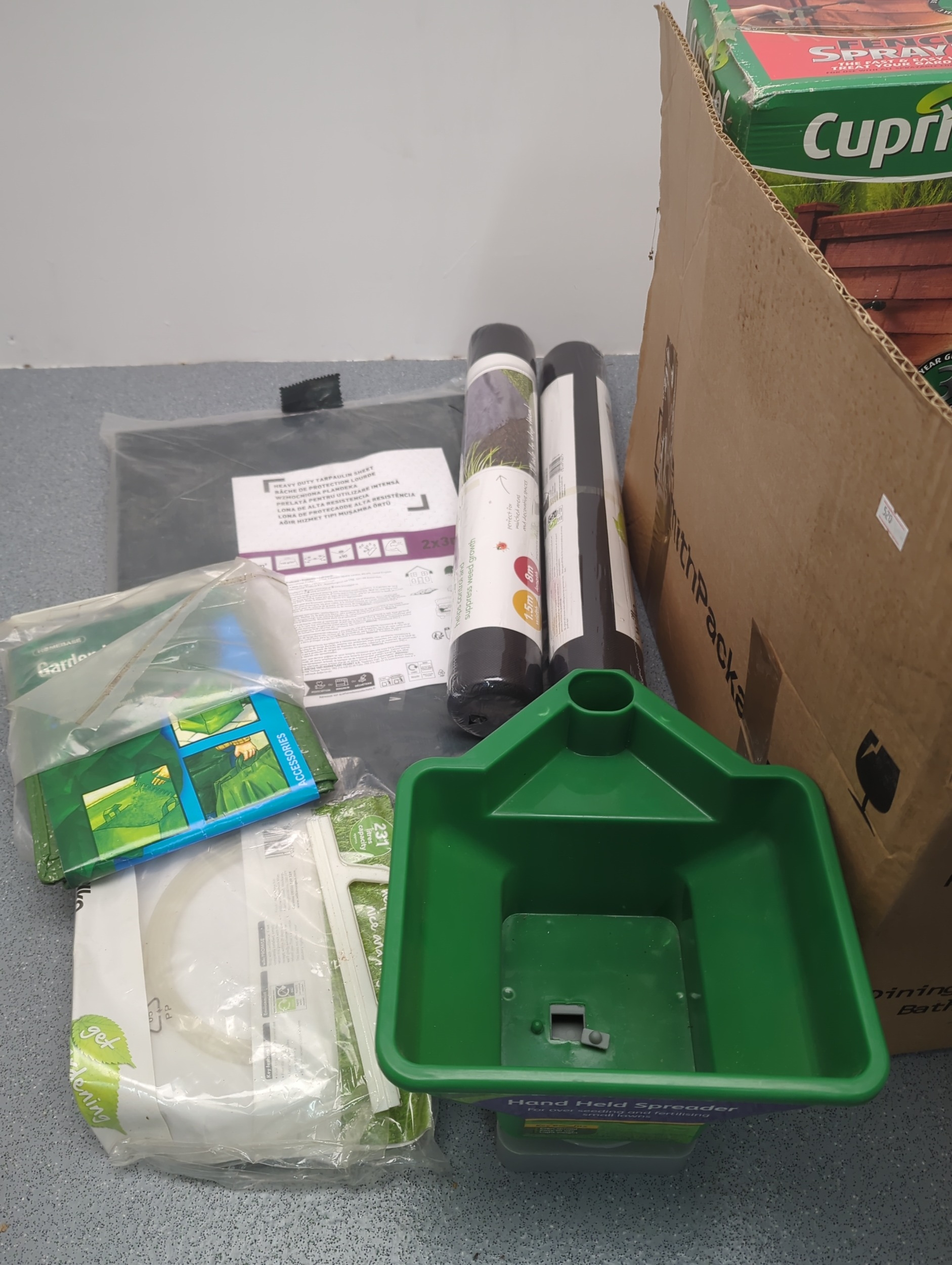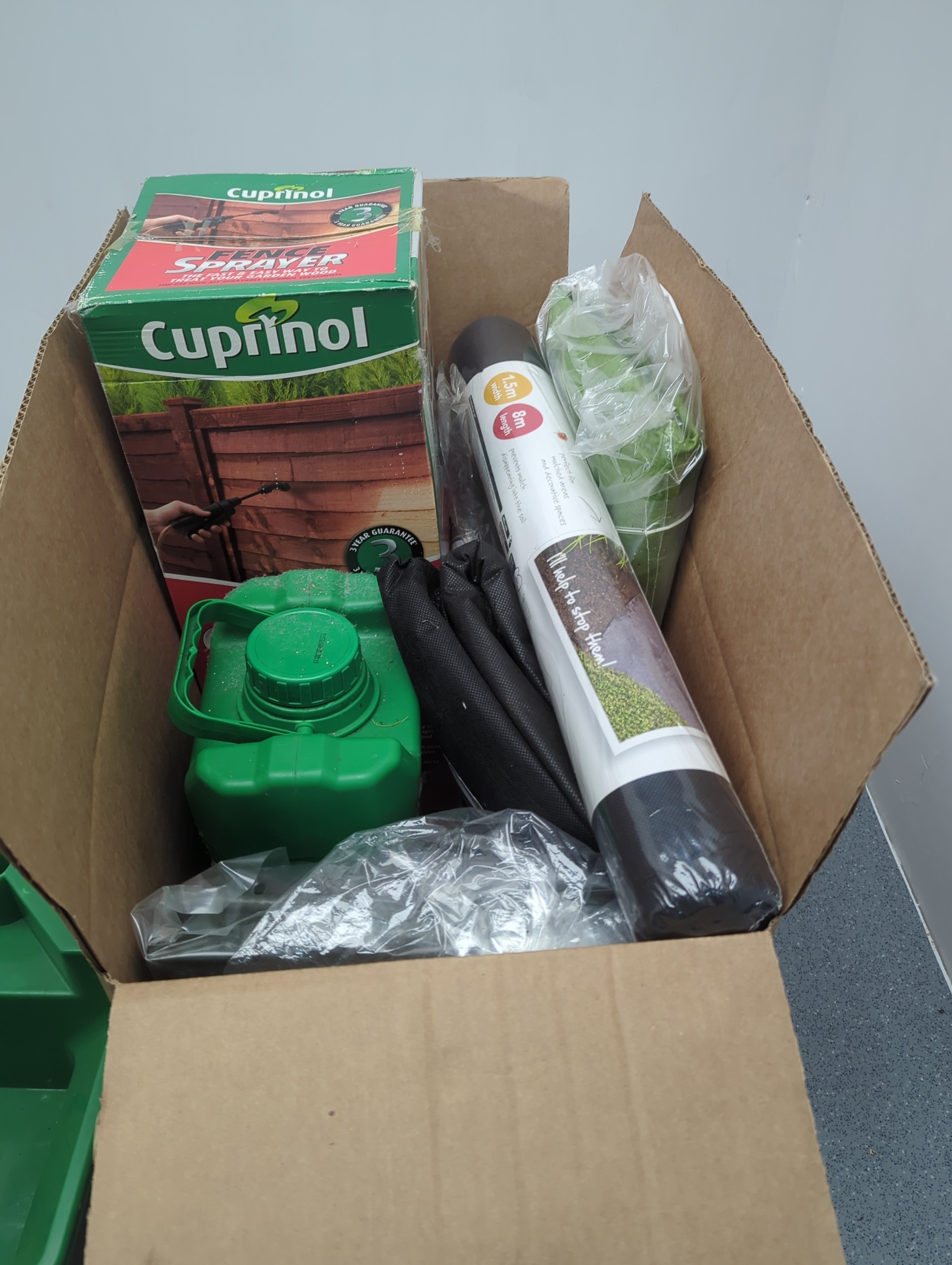 This lot includes a variety of garden supplies, notably featuring a Cuprinol Fence Sprayer. Also visible are rolls of garden mesh and a handheld spreader. The items are contained within an open cardboard box, suitable for various outdoor gardening needs.