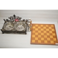 Hardwood chess board 45cm, Victorian style cast iron dog bowl with two aluminium lift out bowls W45cm D25cm H27cm, 2 cocktail shakers (4)