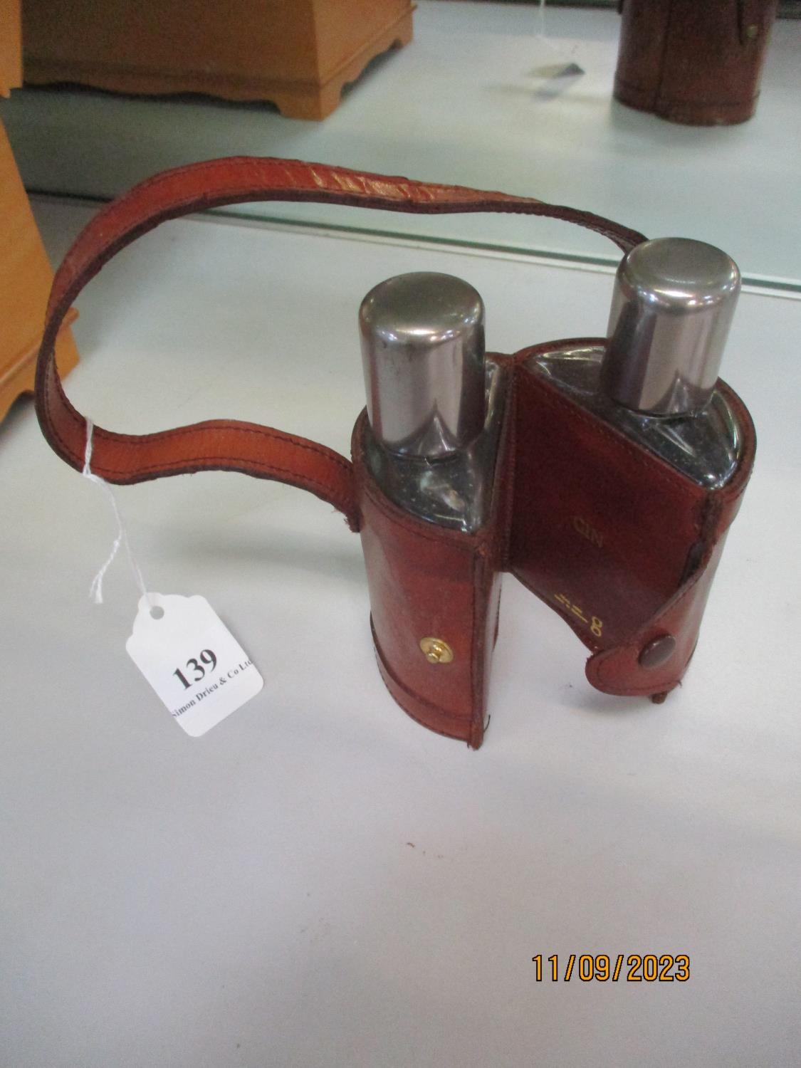 A pair of spirit flasks contained within a leather case