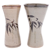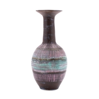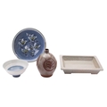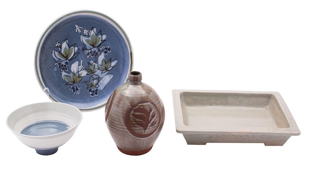 *Marianne de Trey [1913-2016] a group of ceramics, comprising a footed porcelain bowl with blue, white and blush decoration, 17cm diameter, a stoneware plate painted with flowers and foliage on a blue ground, 26cm diameter, a stoneware shallow rectangular planter under pale celadon, 29cm long and a terracotta lamp base with wax resist decoration, 19.5cm high, impressed personal seals to all. [4]