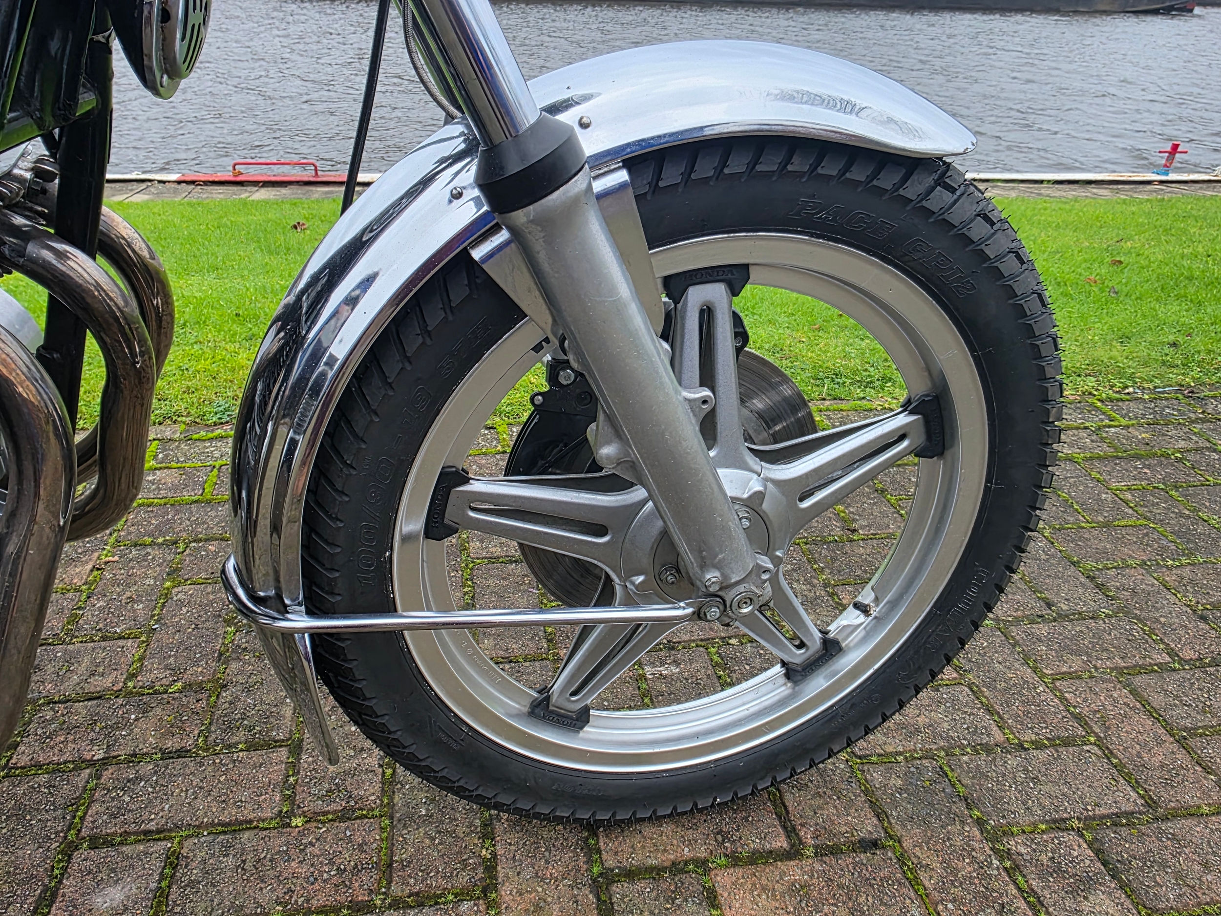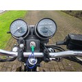 While the torque converter replaced the clutch, shifting between the two gears is undertaken manually with a conventional foot pedal. There are some more differences to a "normal" CB750, for the engine to start it must be in neutral, if you forget to shift into neutral before parking, deploying the side stand would do it for you. Similarly, a push-button parking brake acts on the rear wheel prevented the bike from rolling away if parked on a slope, there being no direct gear linkage between engine and wheels. Even after the brake button is released, the brake remains on and the bike will not roll until the rider dabs the brake pedal.