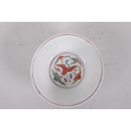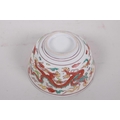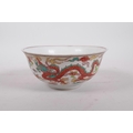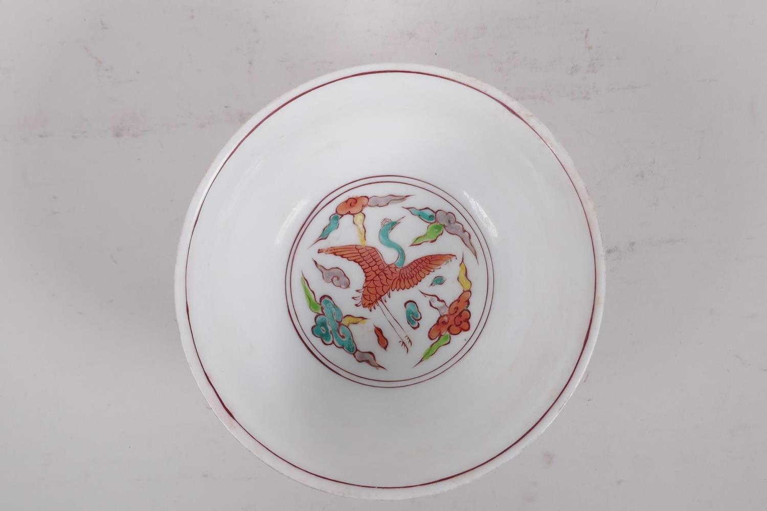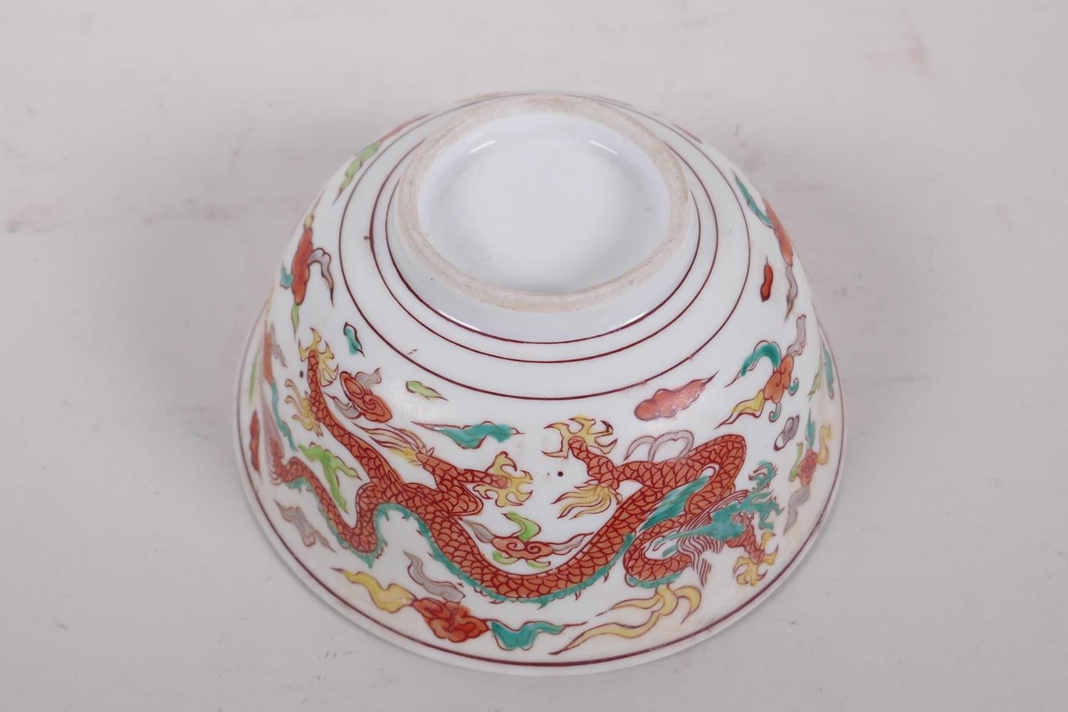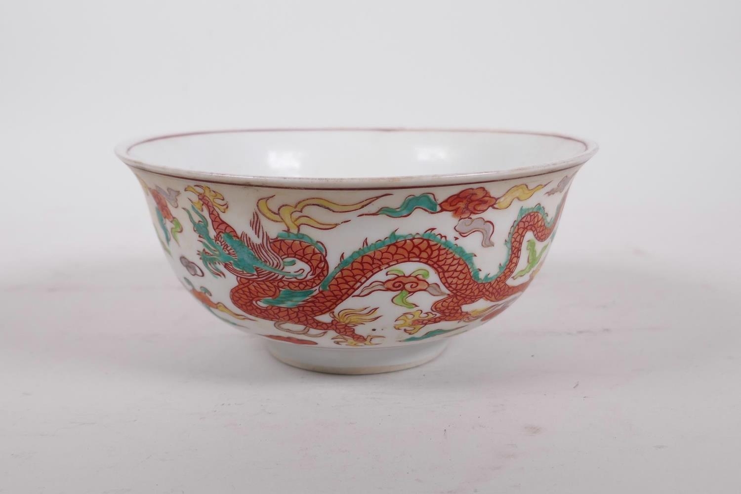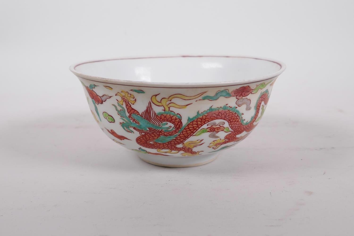 A Chinese polychrome porcelain rice bowl decorated with dragons to exterior and a phoenix to the bowl, 6" diameter