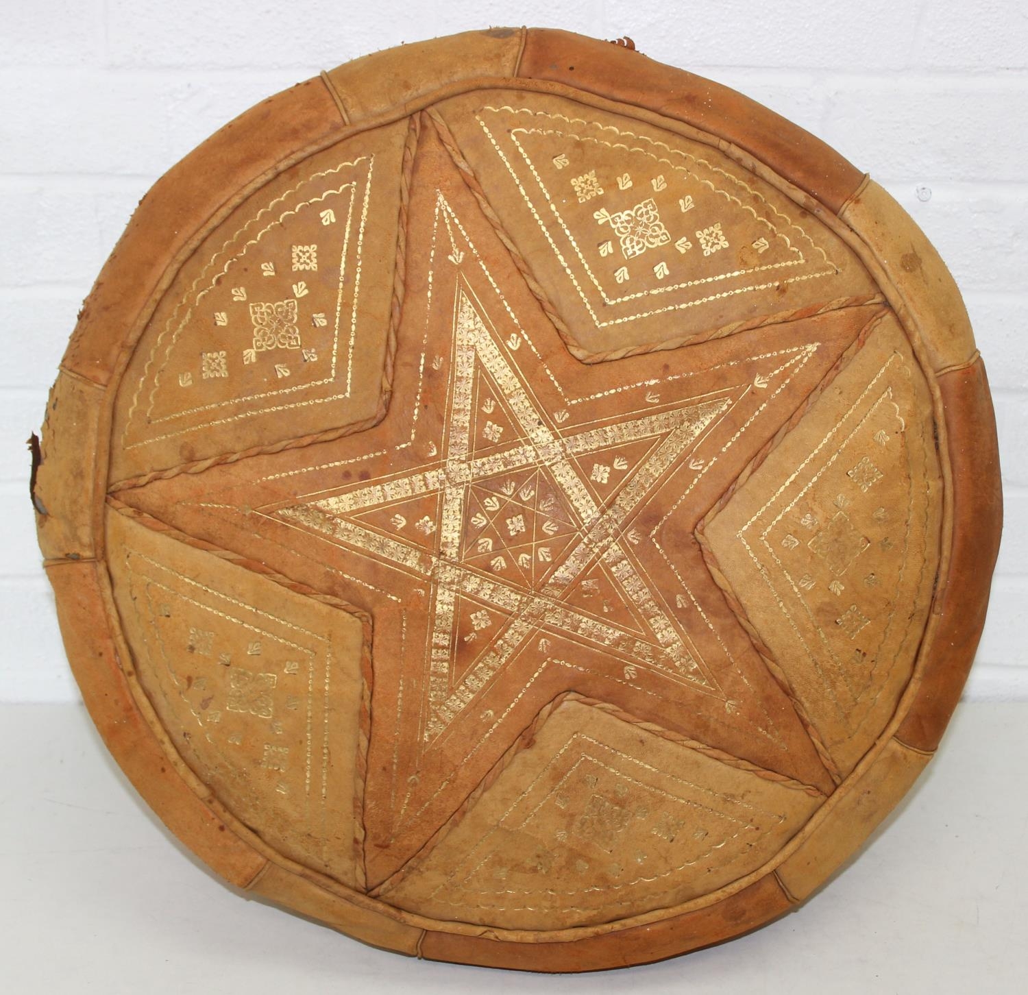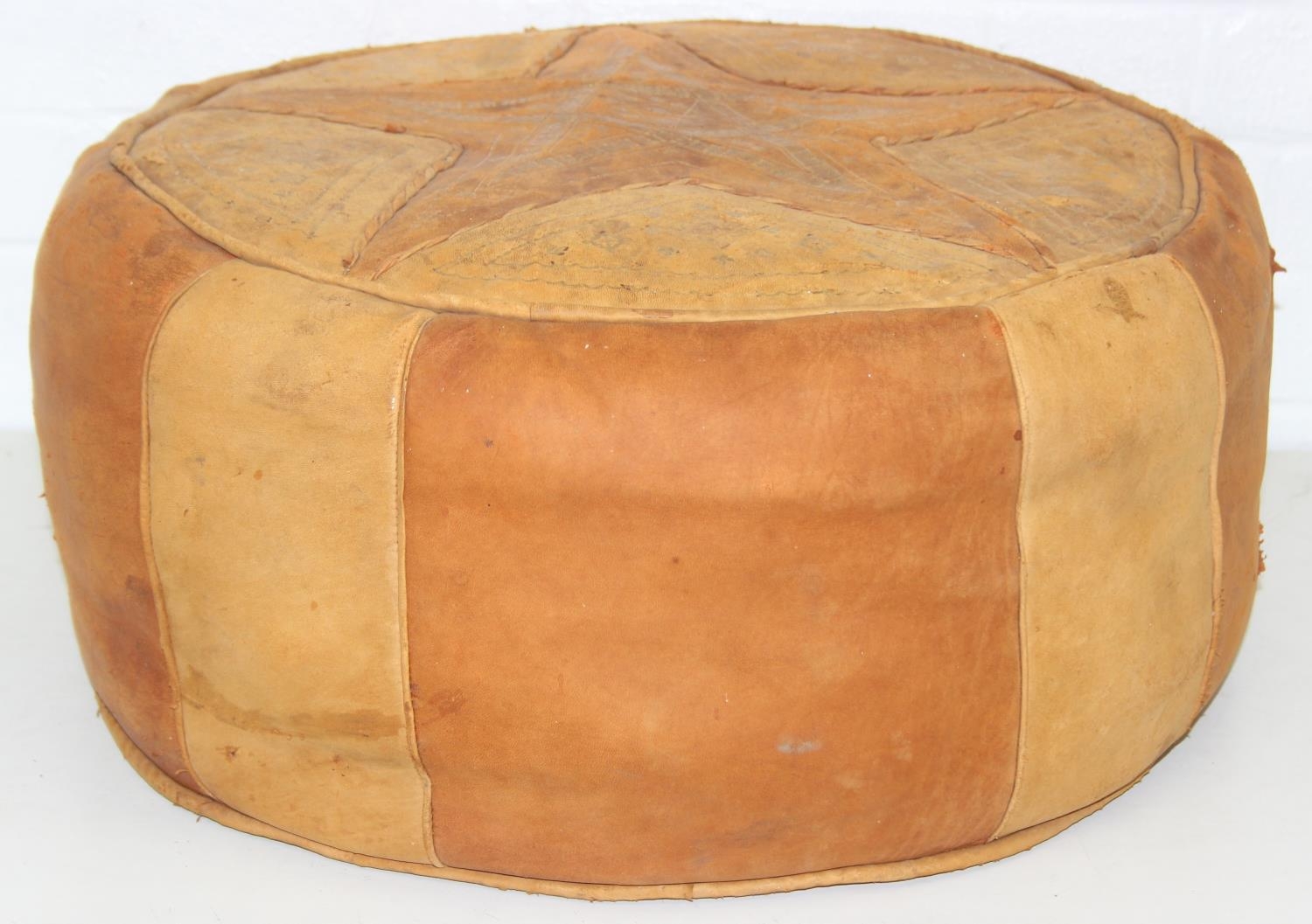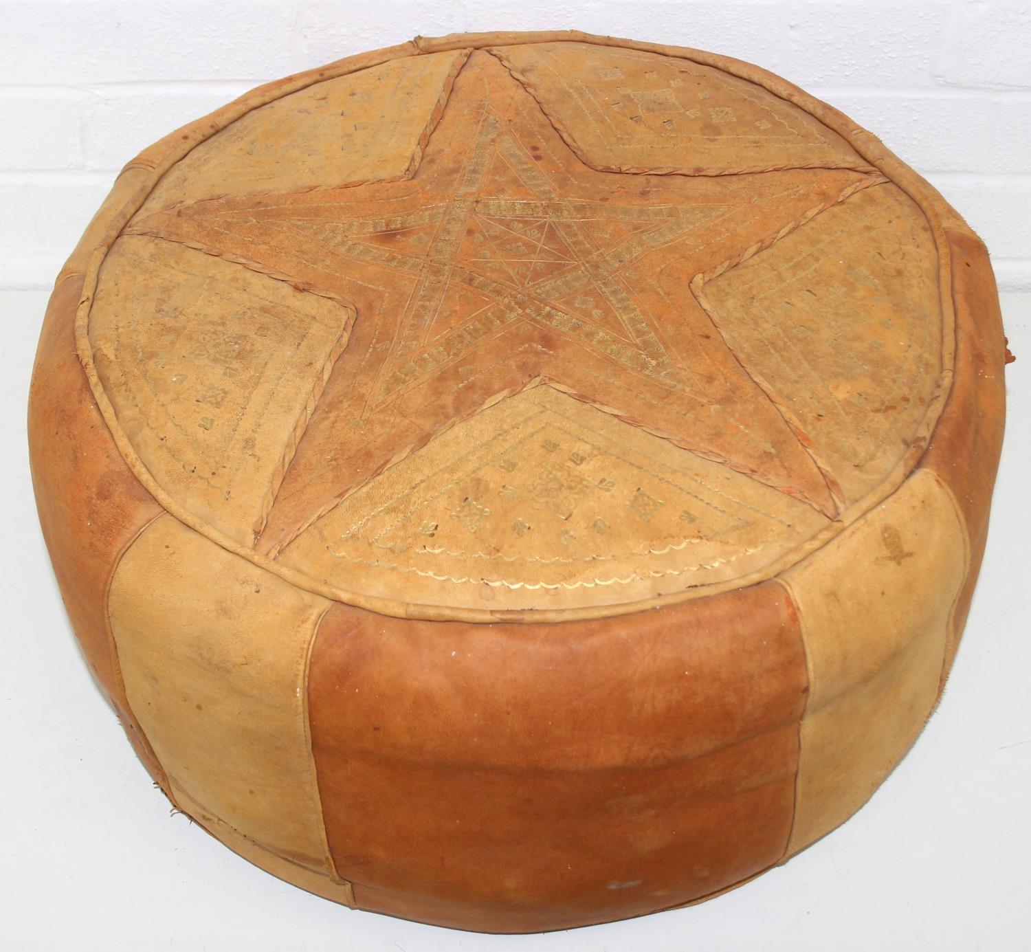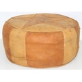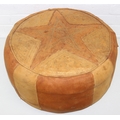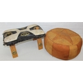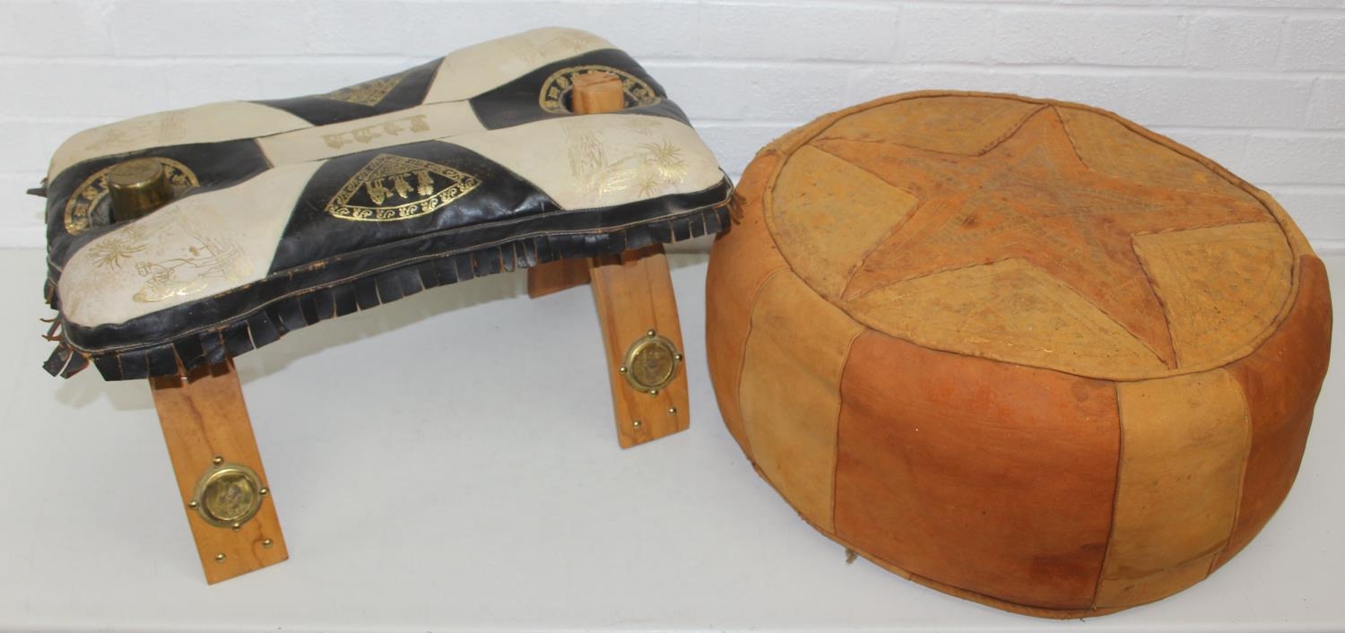 A vintage tan leather pouffe or footstool and a leather topped camel stool, the pouffe 56cm in diameter [2]