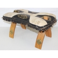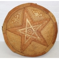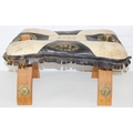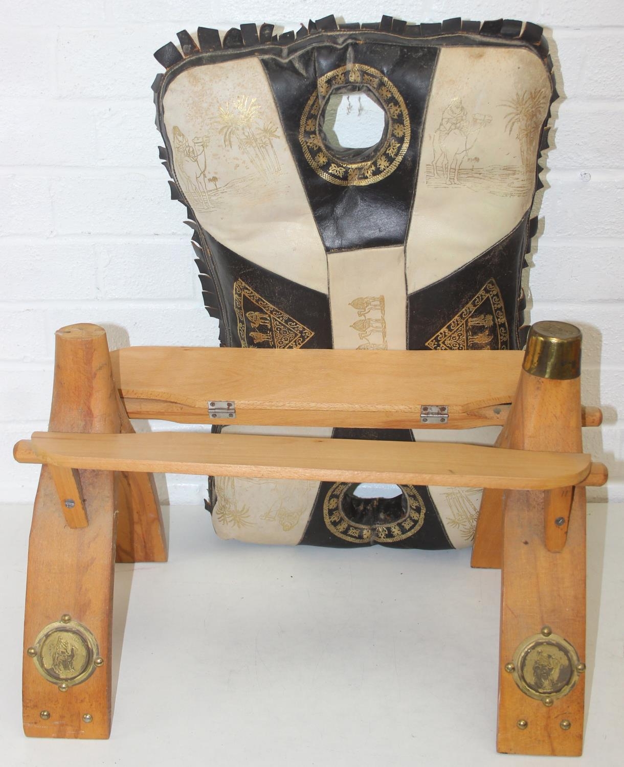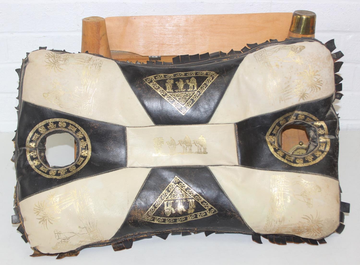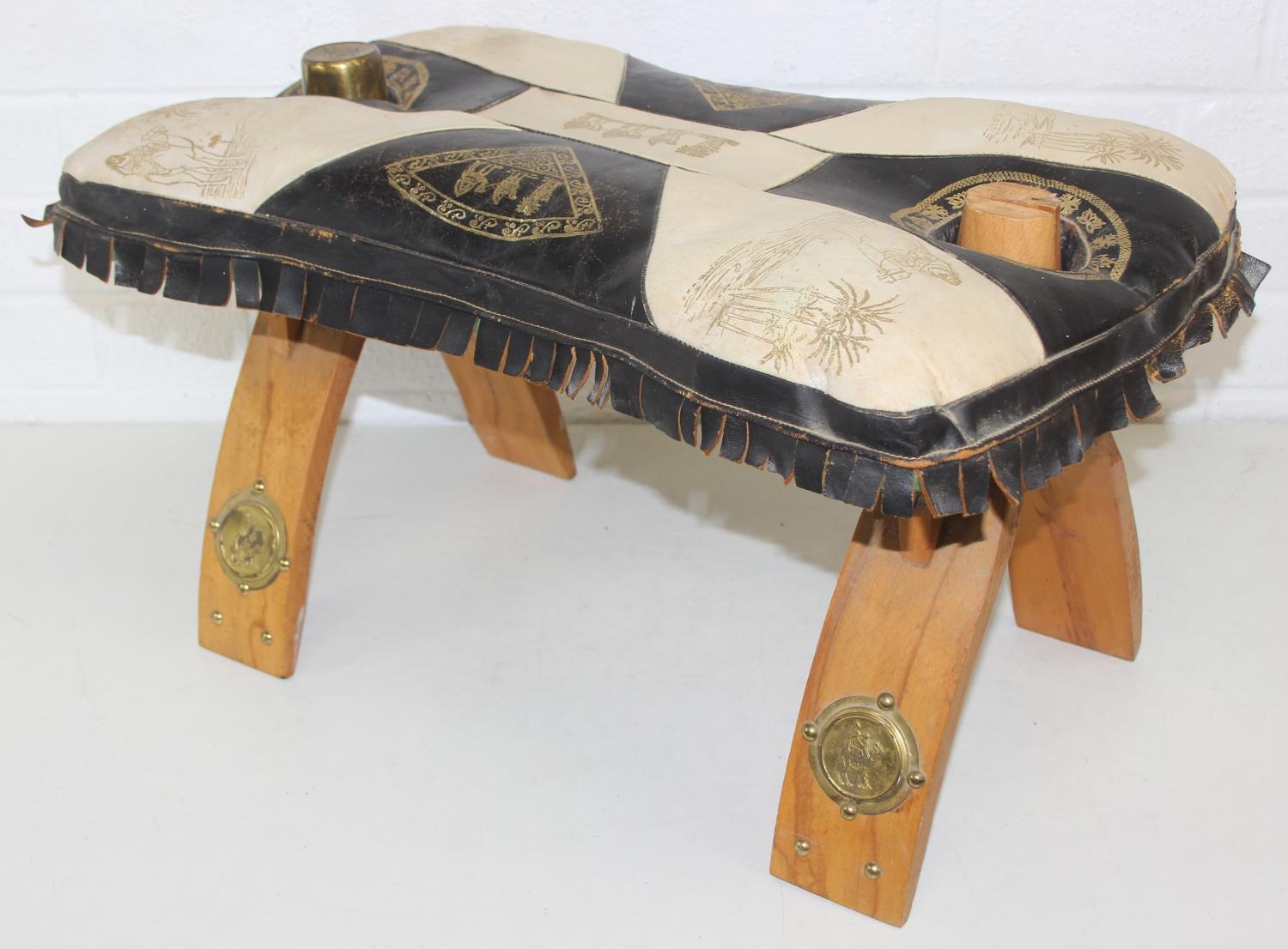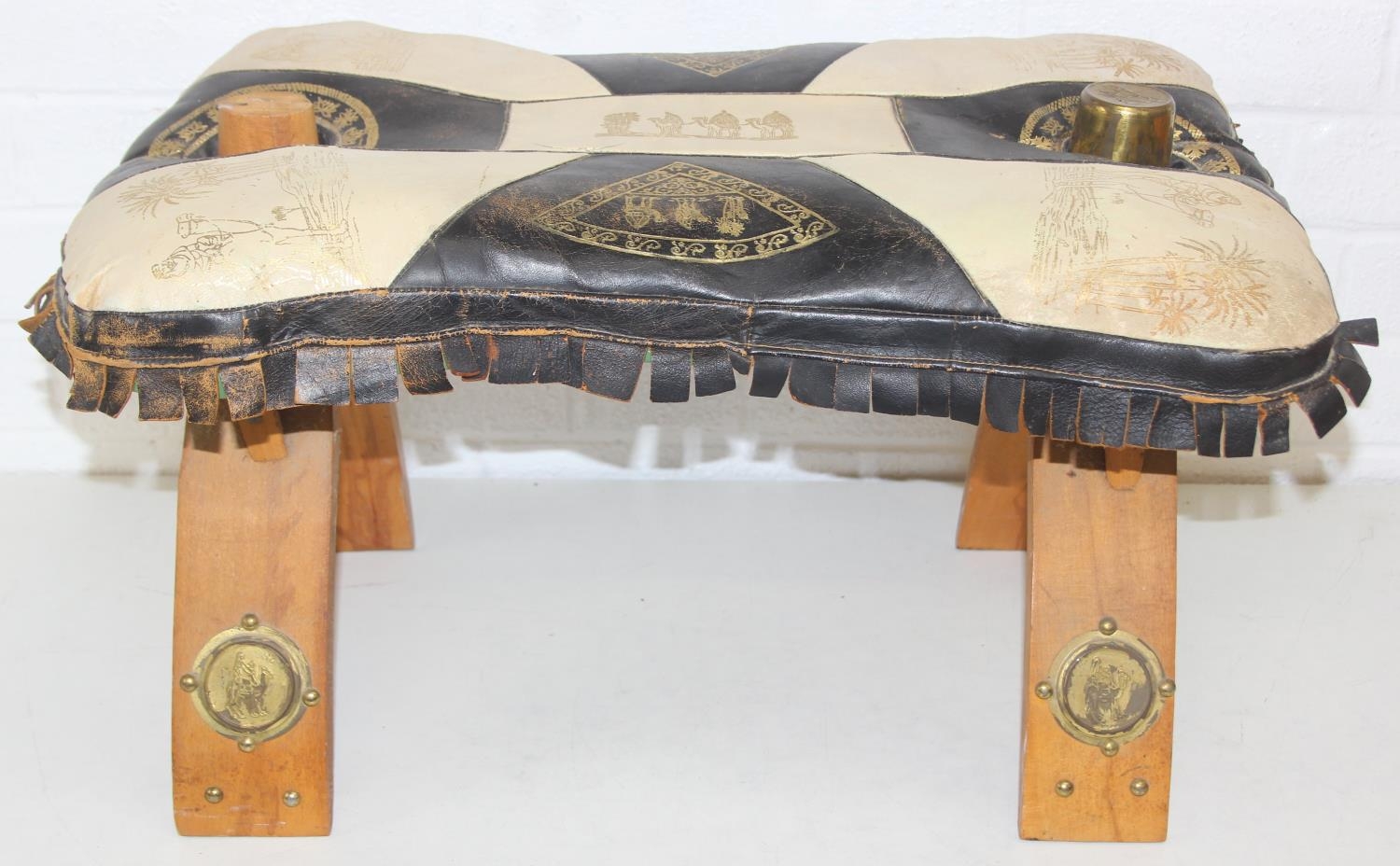 A vintage tan leather pouffe or footstool and a leather topped camel stool, the pouffe 56cm in diameter [2]