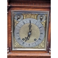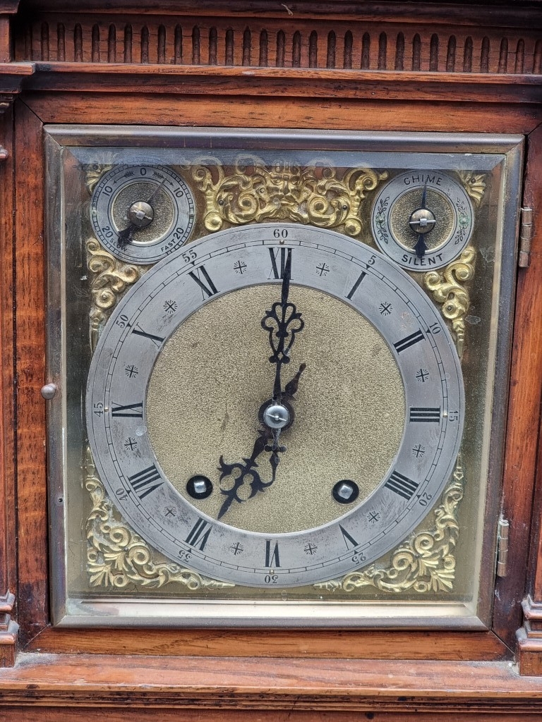 A late 19th century carved oak mantel clock, 44cm high, with pendulum.