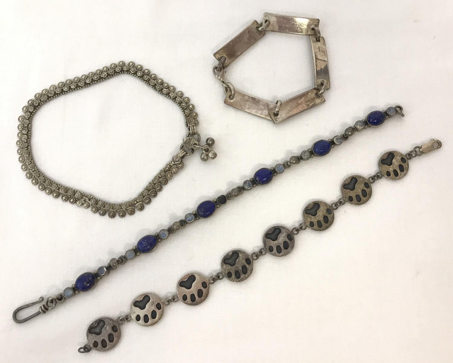 3 silver and white metal bracelets together with an Indian silver ankle chain with bell decoration. Bracelets comprise: lapis and moonstone set, oblong silver link and round link decorated with paw prints.