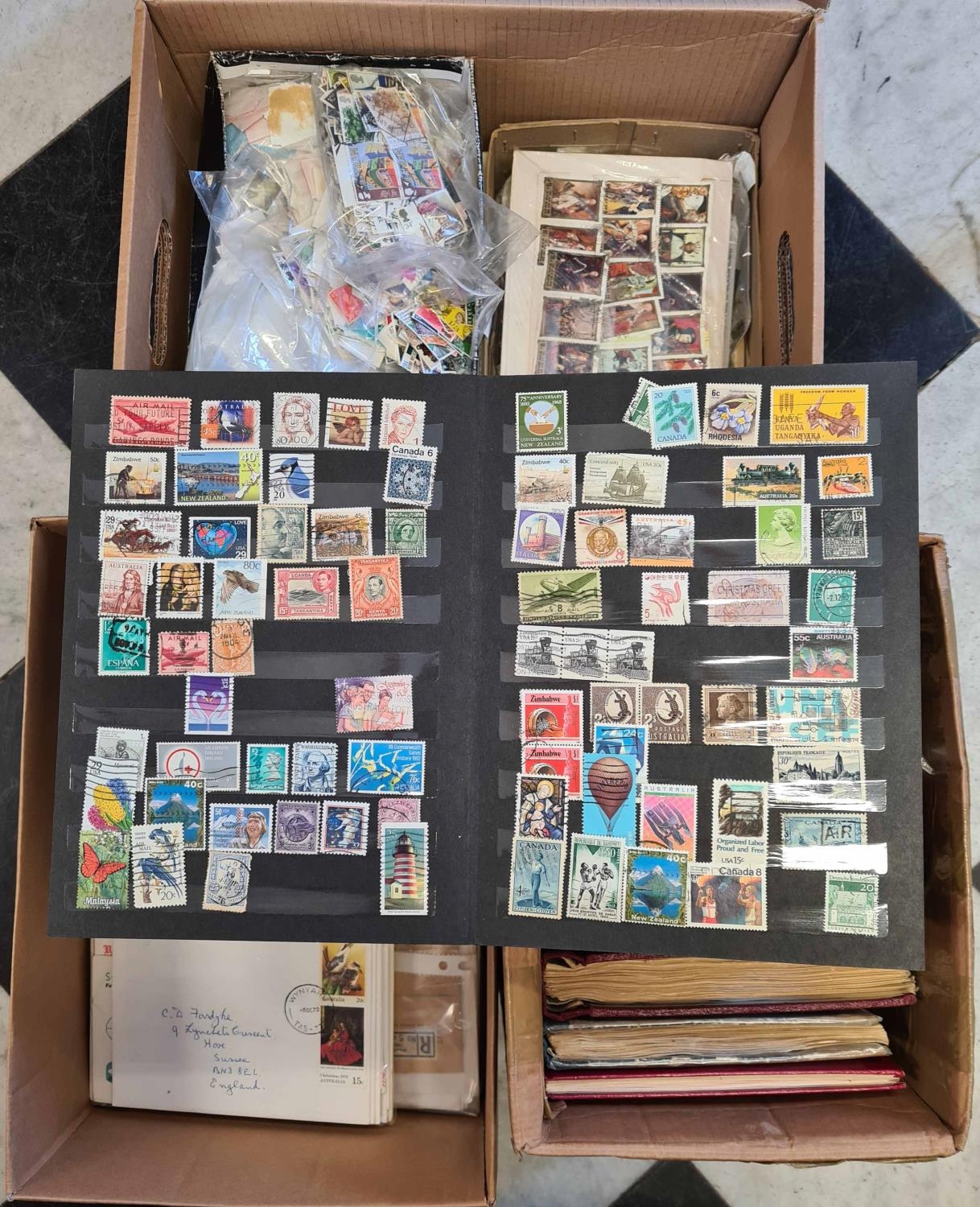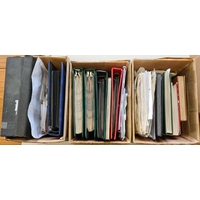 USED STAMPS & COVERS; Three cartons: 1 box containing 11 albums & stockbooks of used worldwide stamps from a range of periods & countries; 1 box containing worldwide covers & envelopes, mainly from 1970s-90s (some earlier); and 1 box containing worldwide kiloware in packets, on pages or loose stamps from a range of countries and periods. (Large qty)