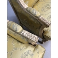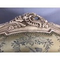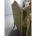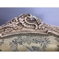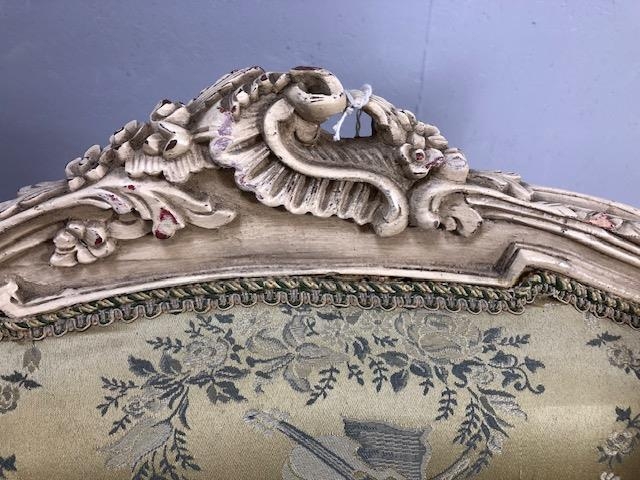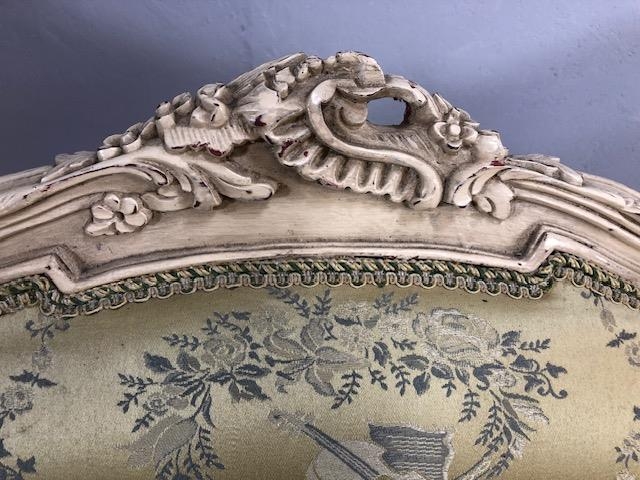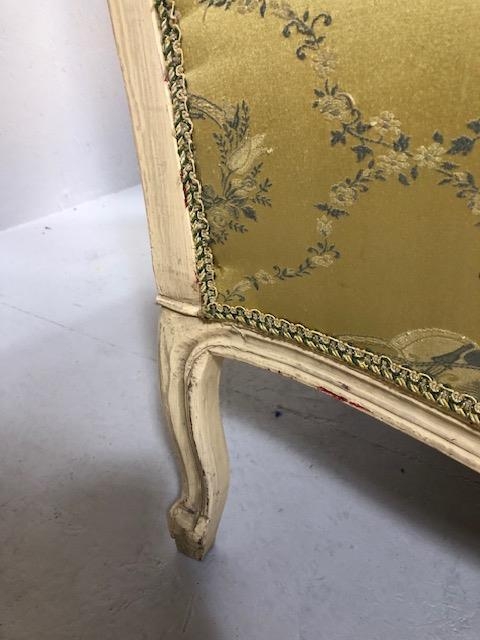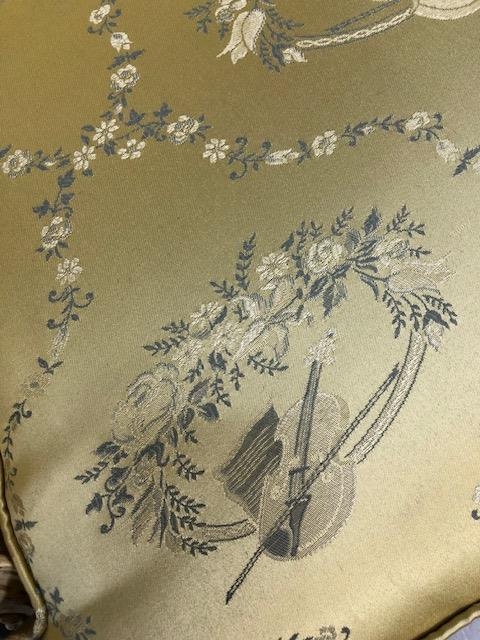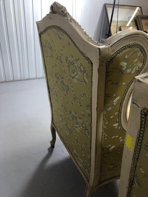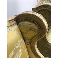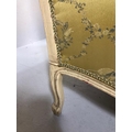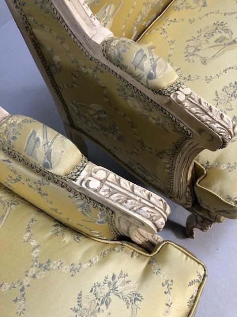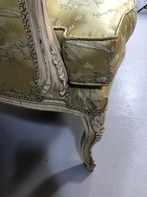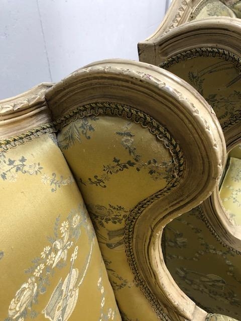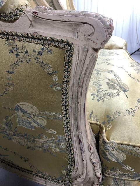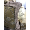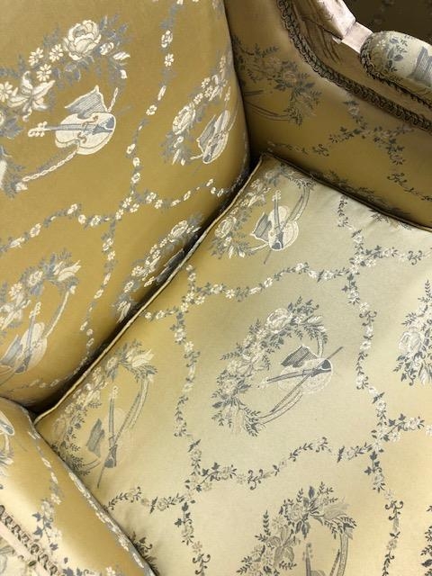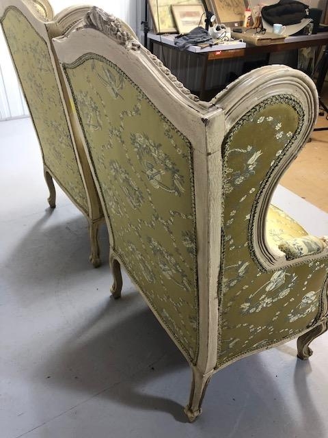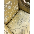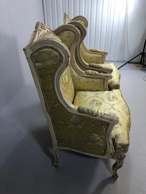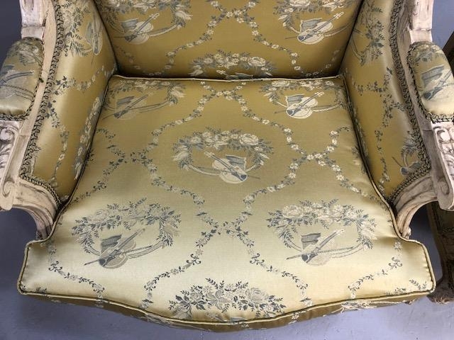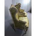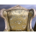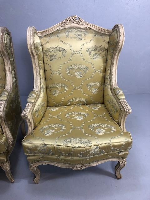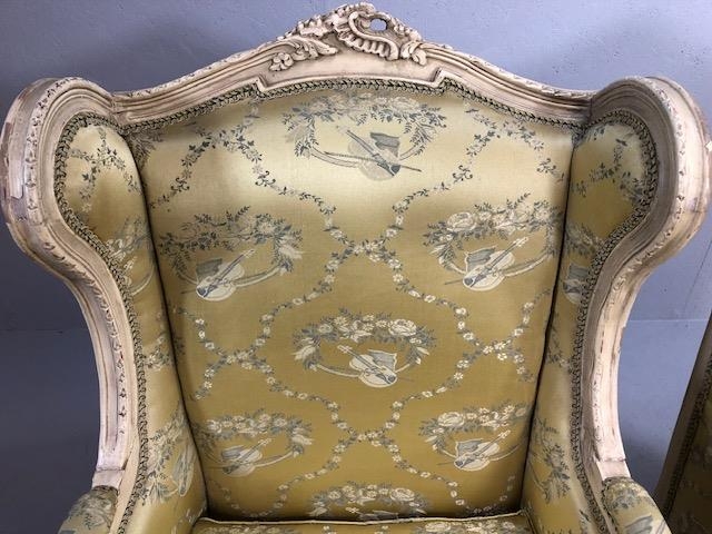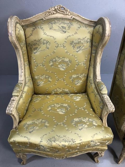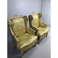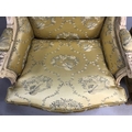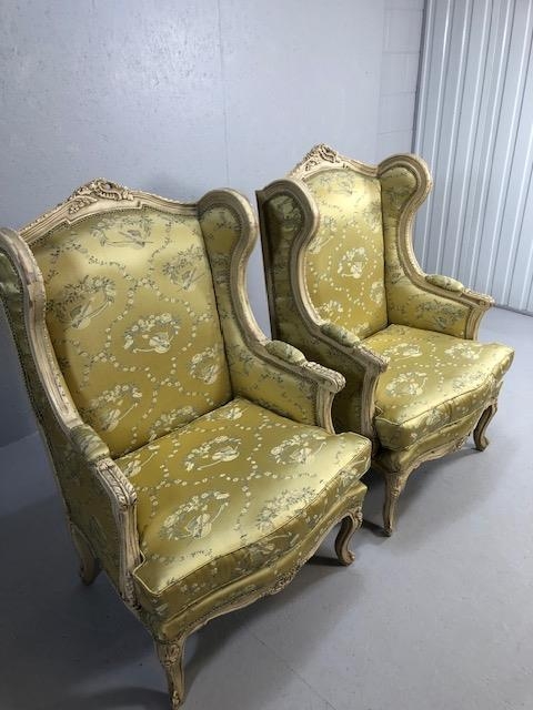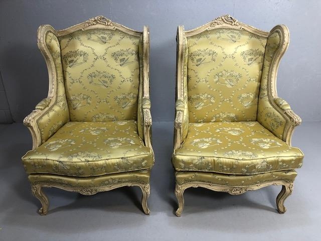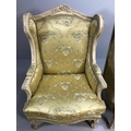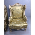 Antique furniture, pair of reproduction French Rococo style wing back arm chairs upholstered in pale gold fabric