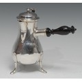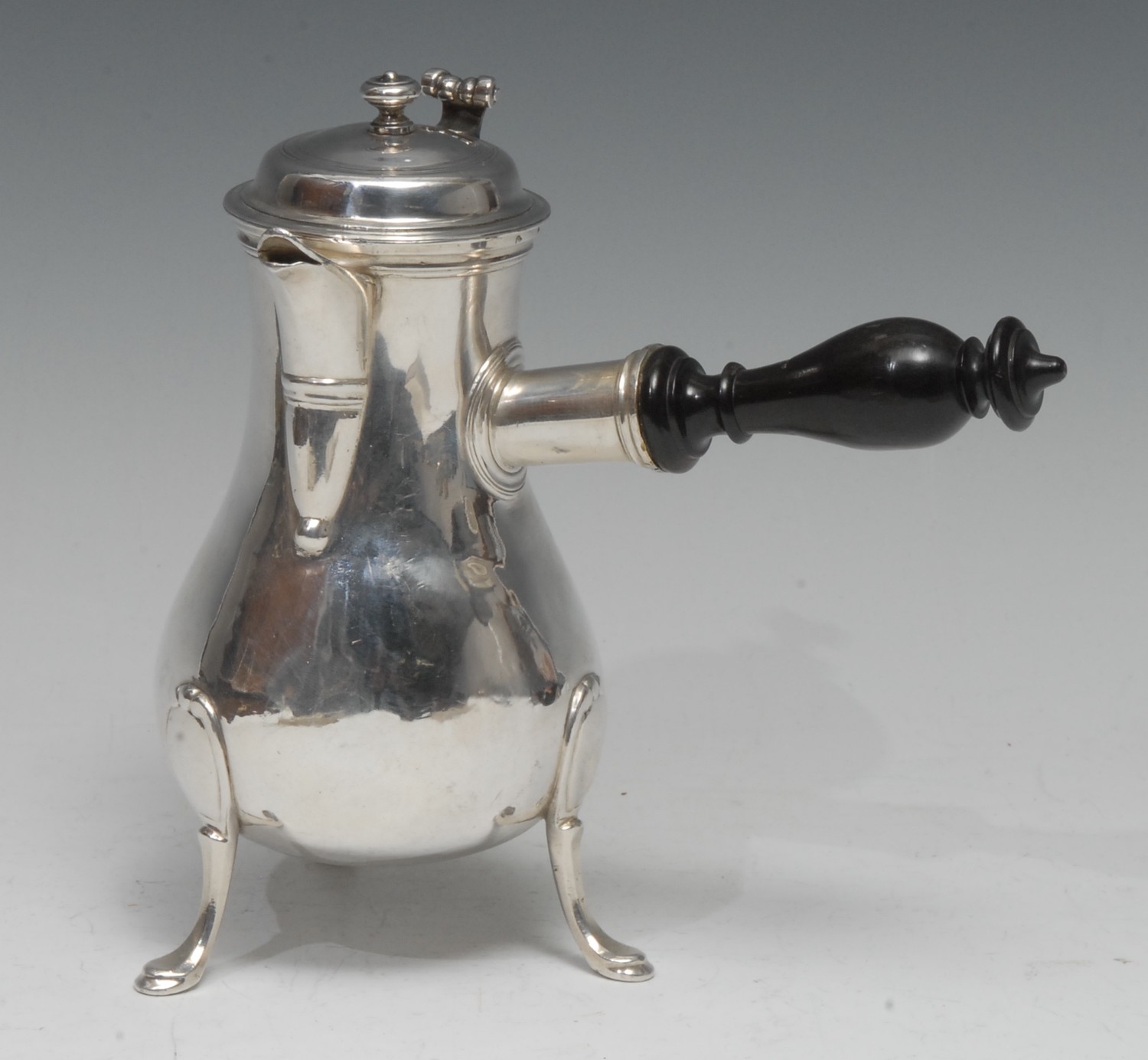 An 18th century French silver baluster side-handled cafe au lait pot, hinged domed cover with knop finial and scroll thumbpiece, turned ebonised handle, pad feet, 17.5cm high, maker's mark DB, c.1770, 10.25oz gross