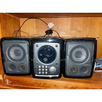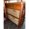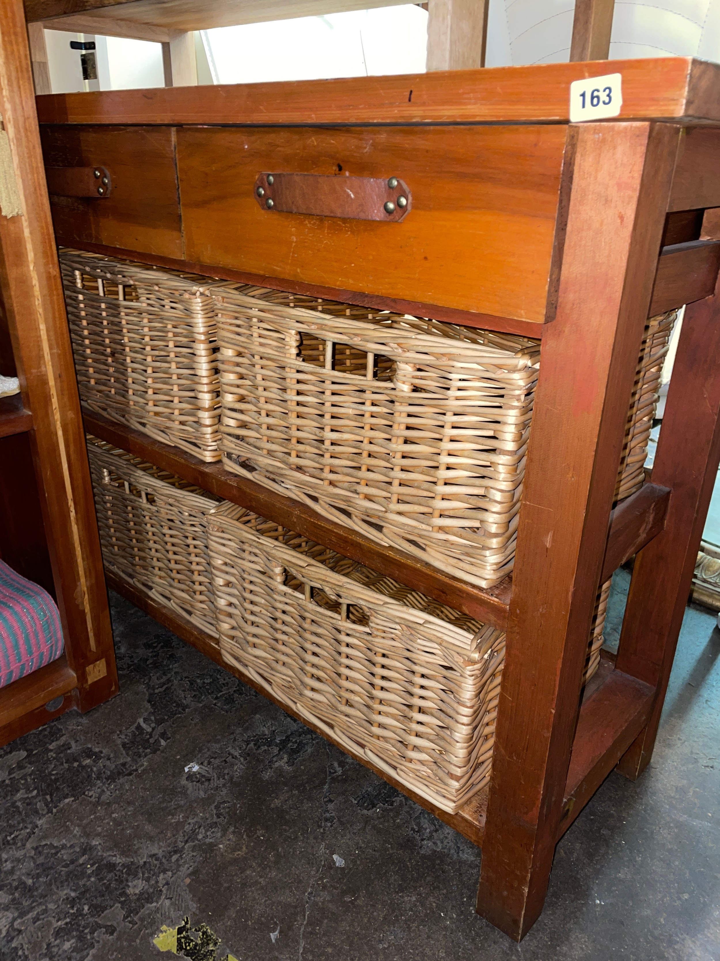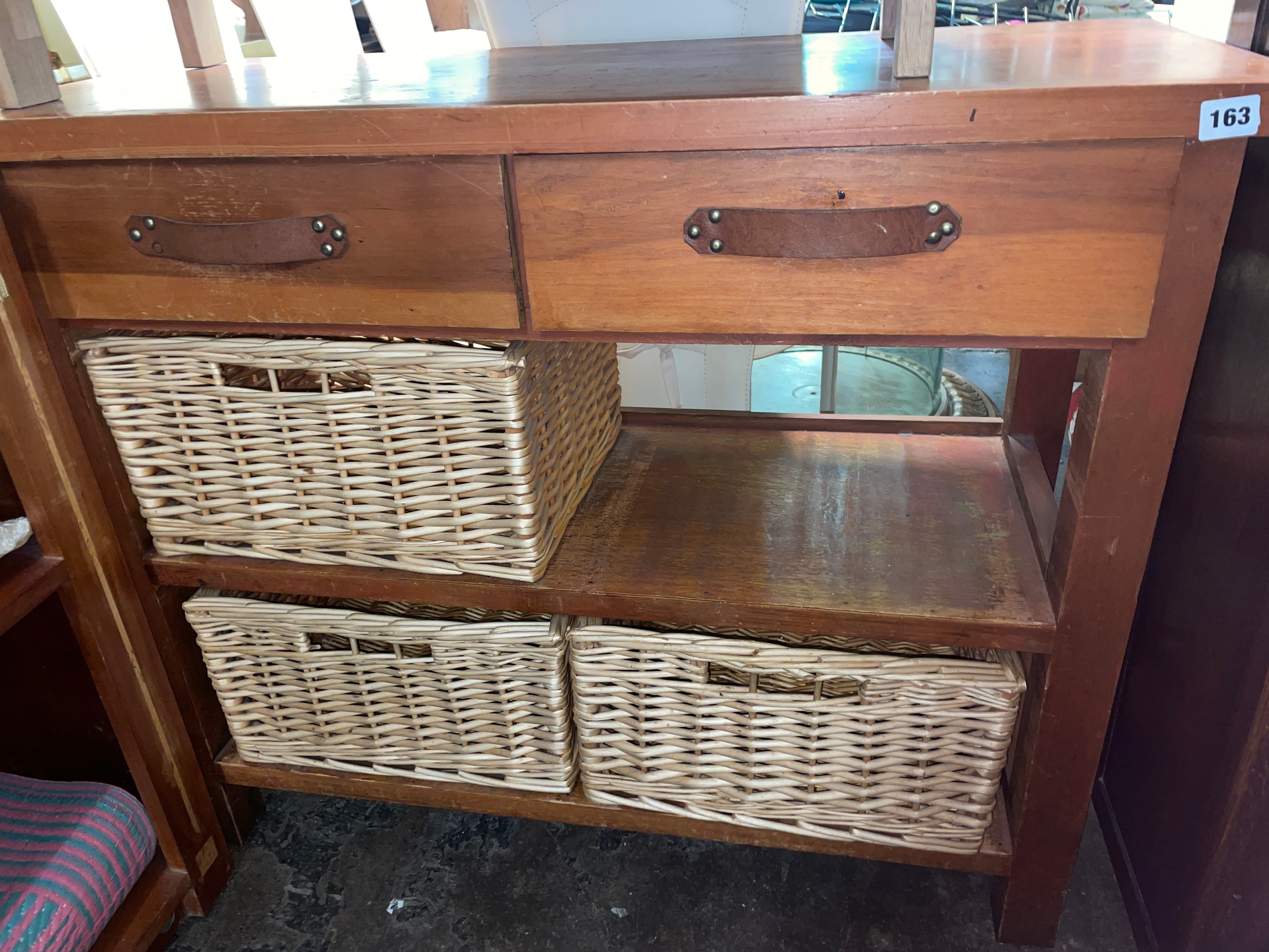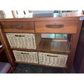 STAINED PINE TWO DRAWER KITCHEN SIDE TABLE WITH WICKER WORK BASKETS