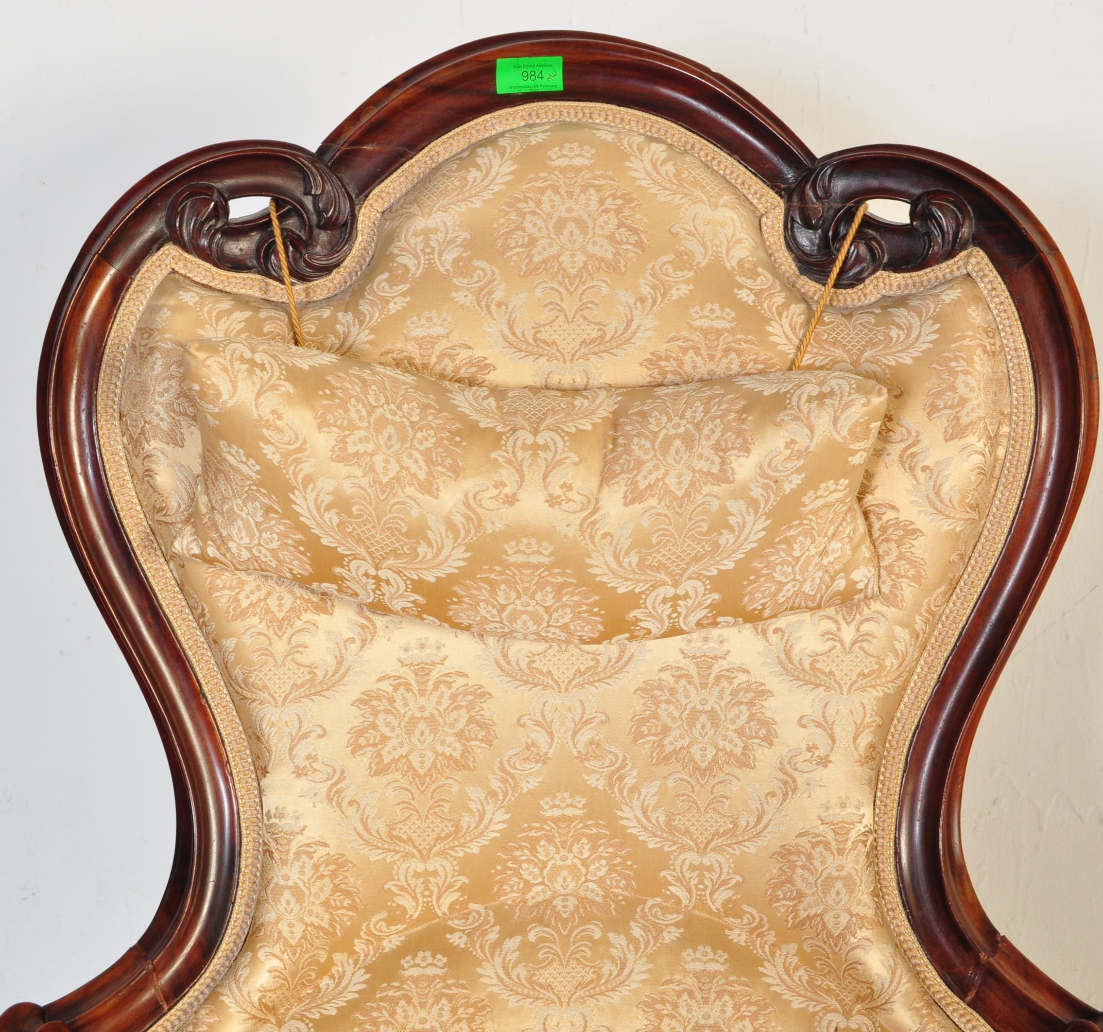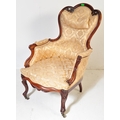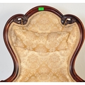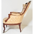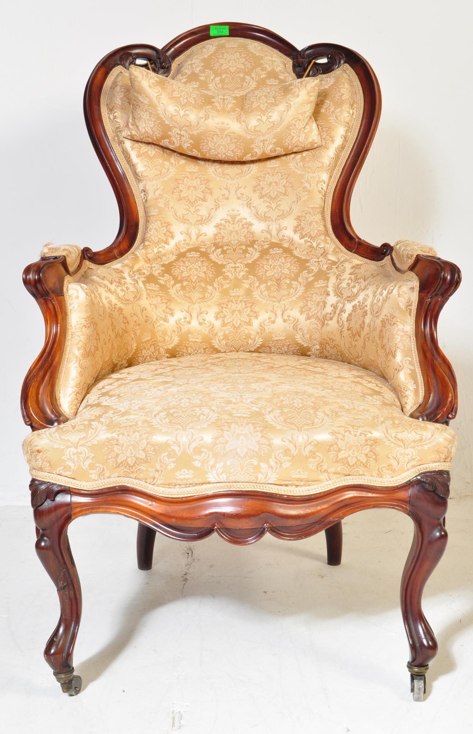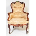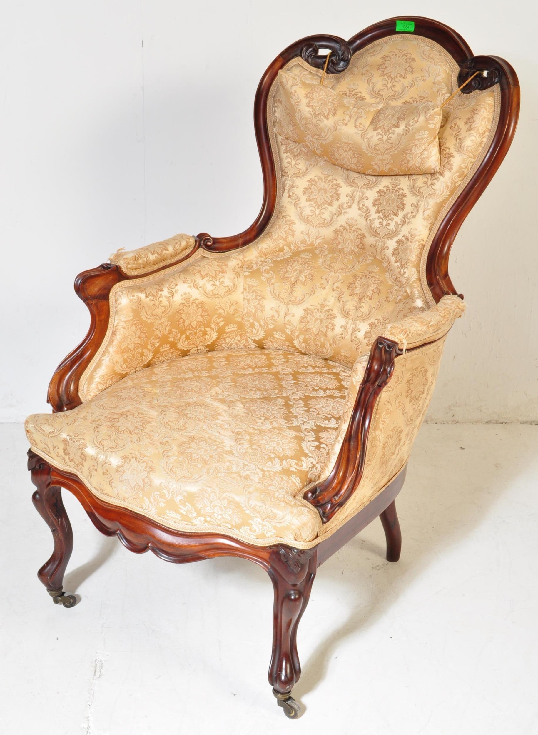 A 19th Century Victorian carved mahogany library / nursing chair. Having a shaped back rest with straight padded arms all supported on carved feet terminating in castors. Damask rocaille fabric upholstered with cushion padded seat. Measures approx. 106cm x 63cm x 95cm.