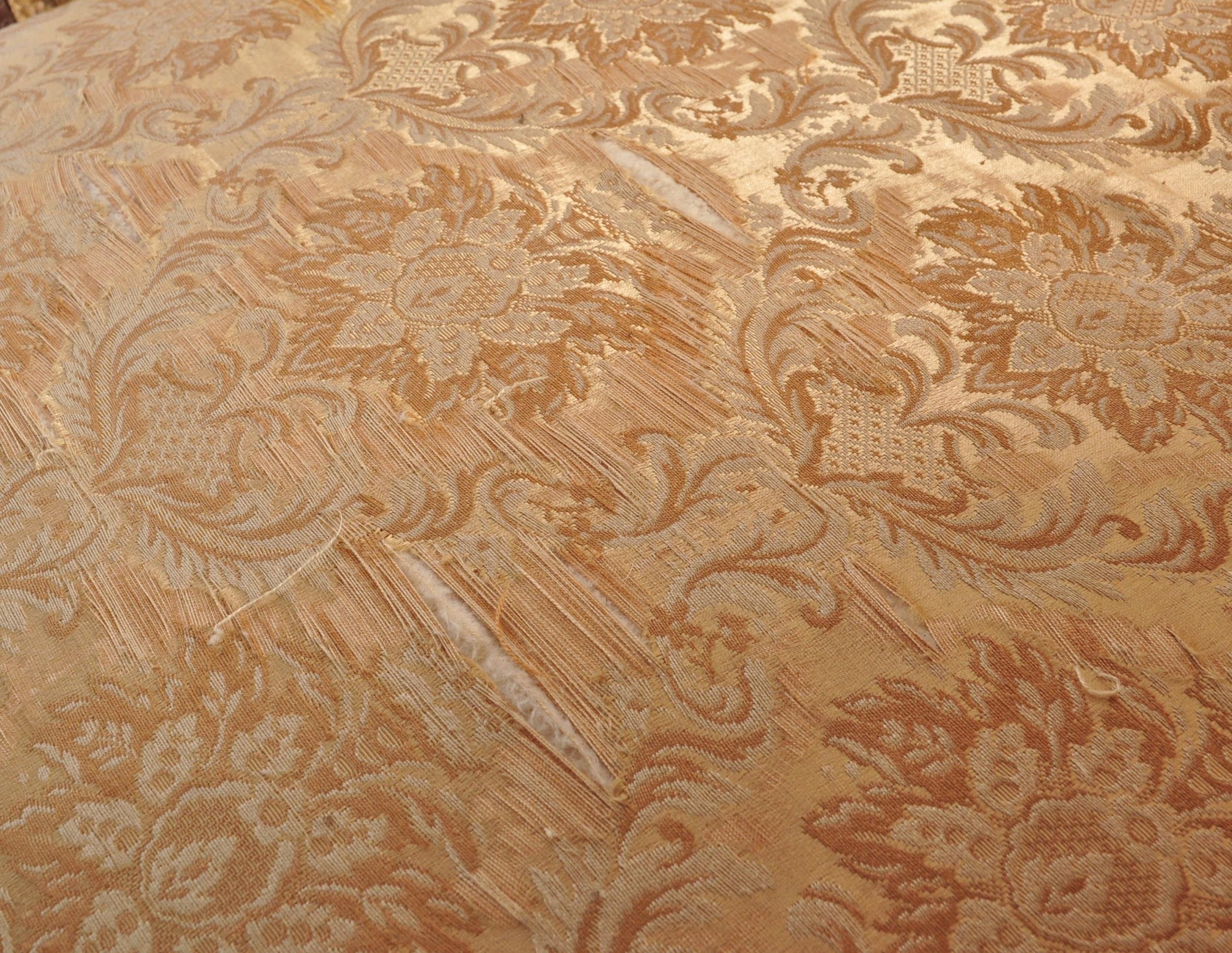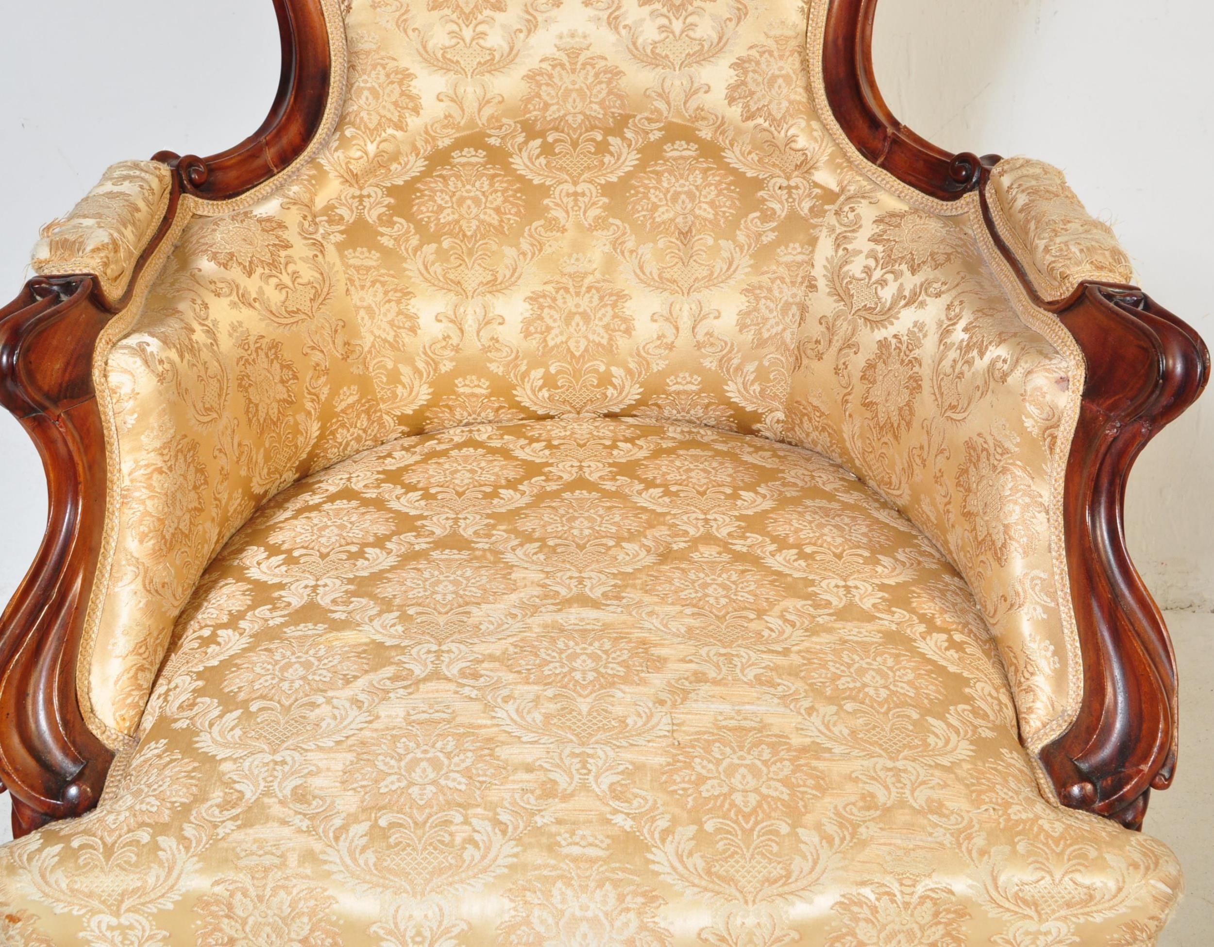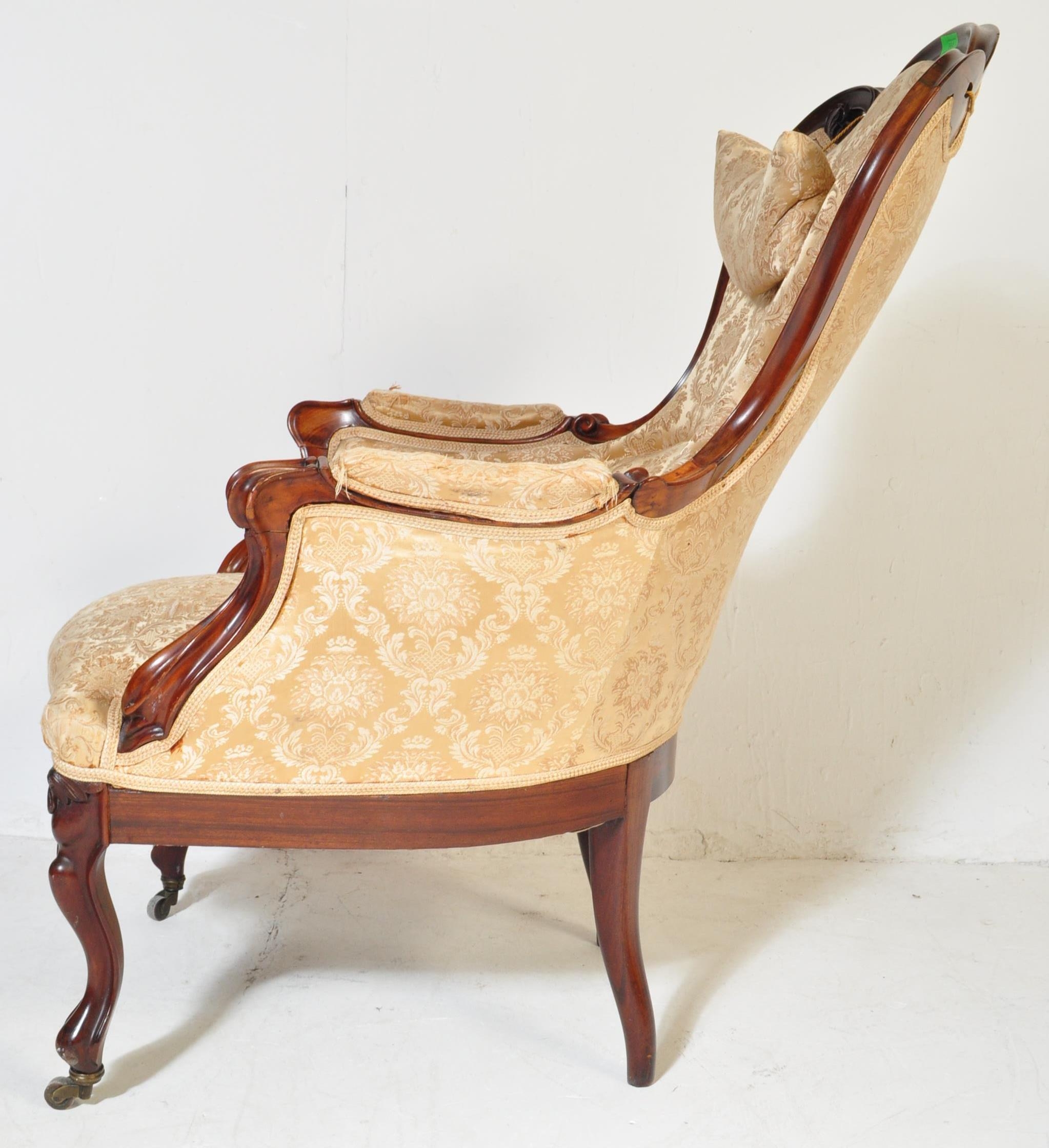 A 19th Century Victorian carved mahogany library / nursing chair. Having a shaped back rest with straight padded arms all supported on carved feet terminating in castors. Damask rocaille fabric upholstered with cushion padded seat. Measures approx. 106cm x 63cm x 95cm.