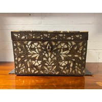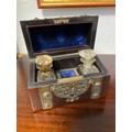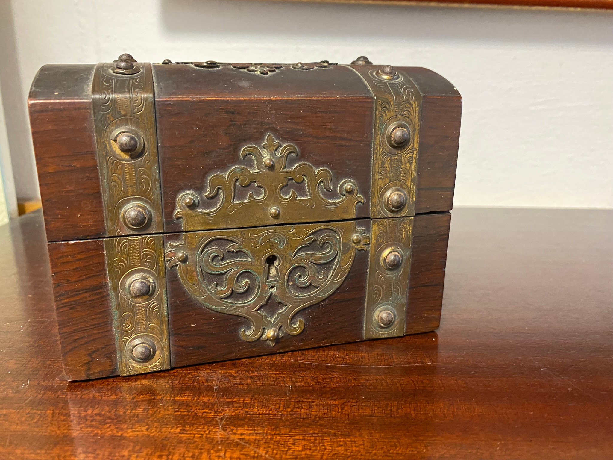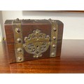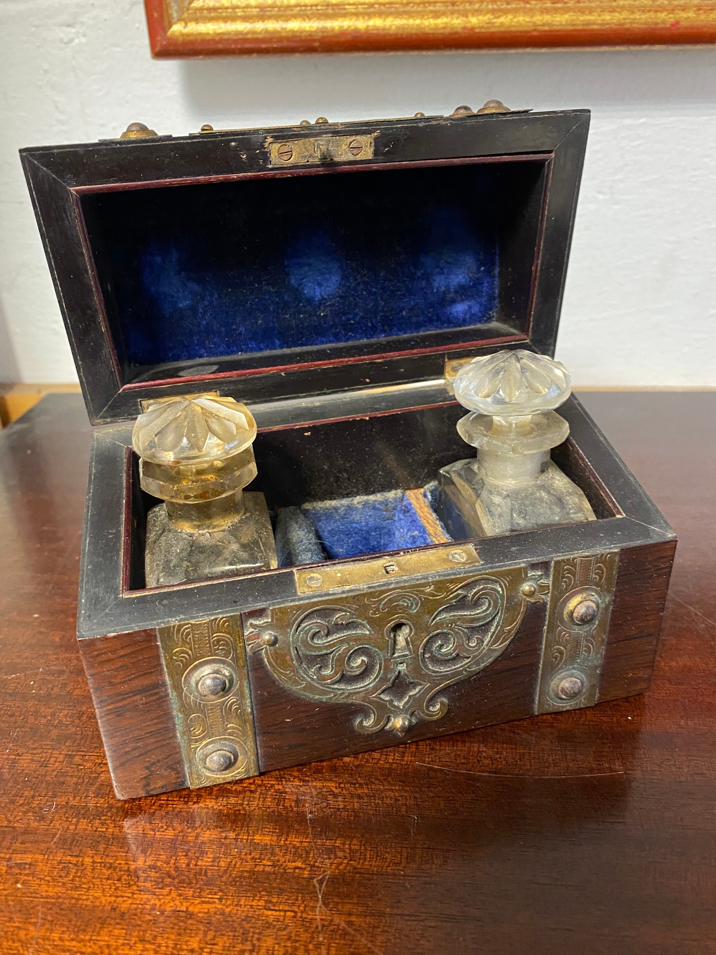 A Victorian Gothic style brass mounted dome topped box, with two glass bottles -
