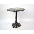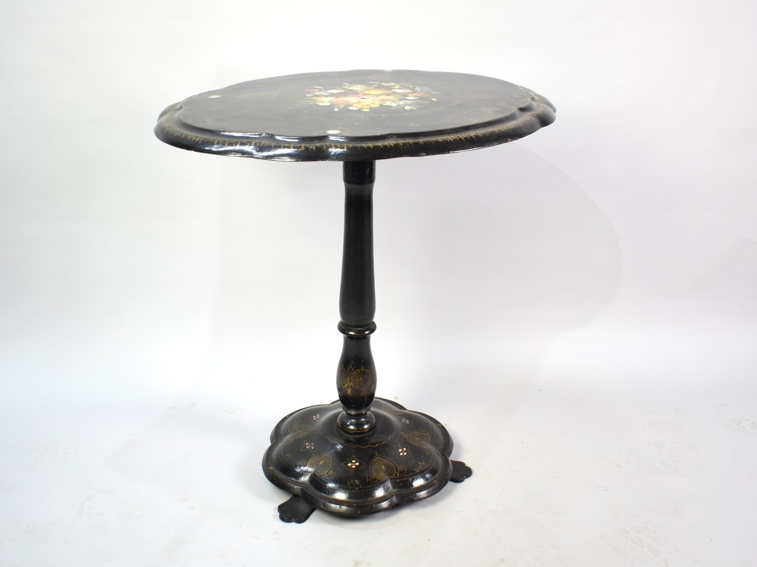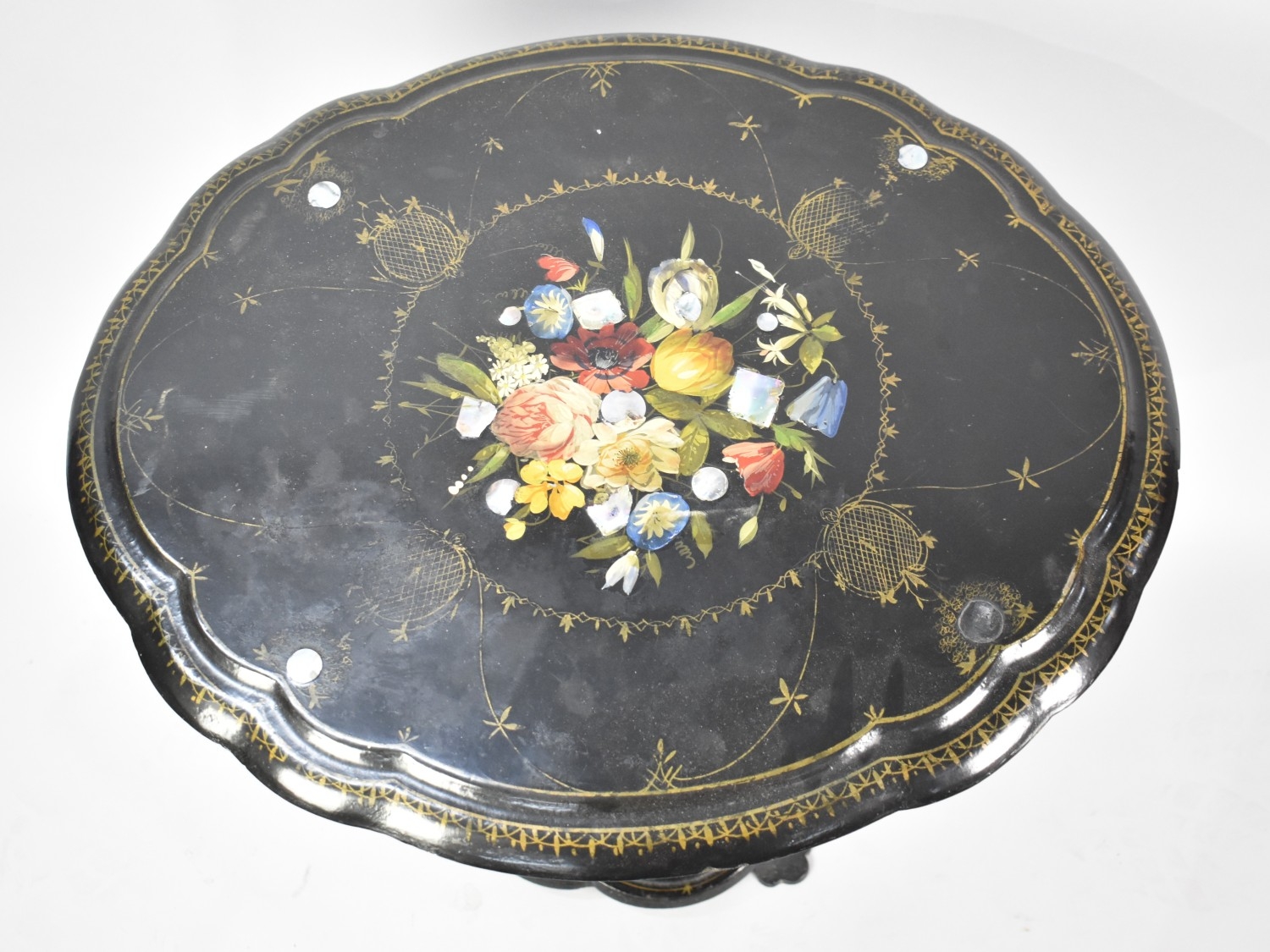 A Victorian Painted and Mother of Pearl Inlaid Papier Mache Oval Snap Top Table with Turned Support and Shaped Circular Base on Three Feet, 7cms Wide