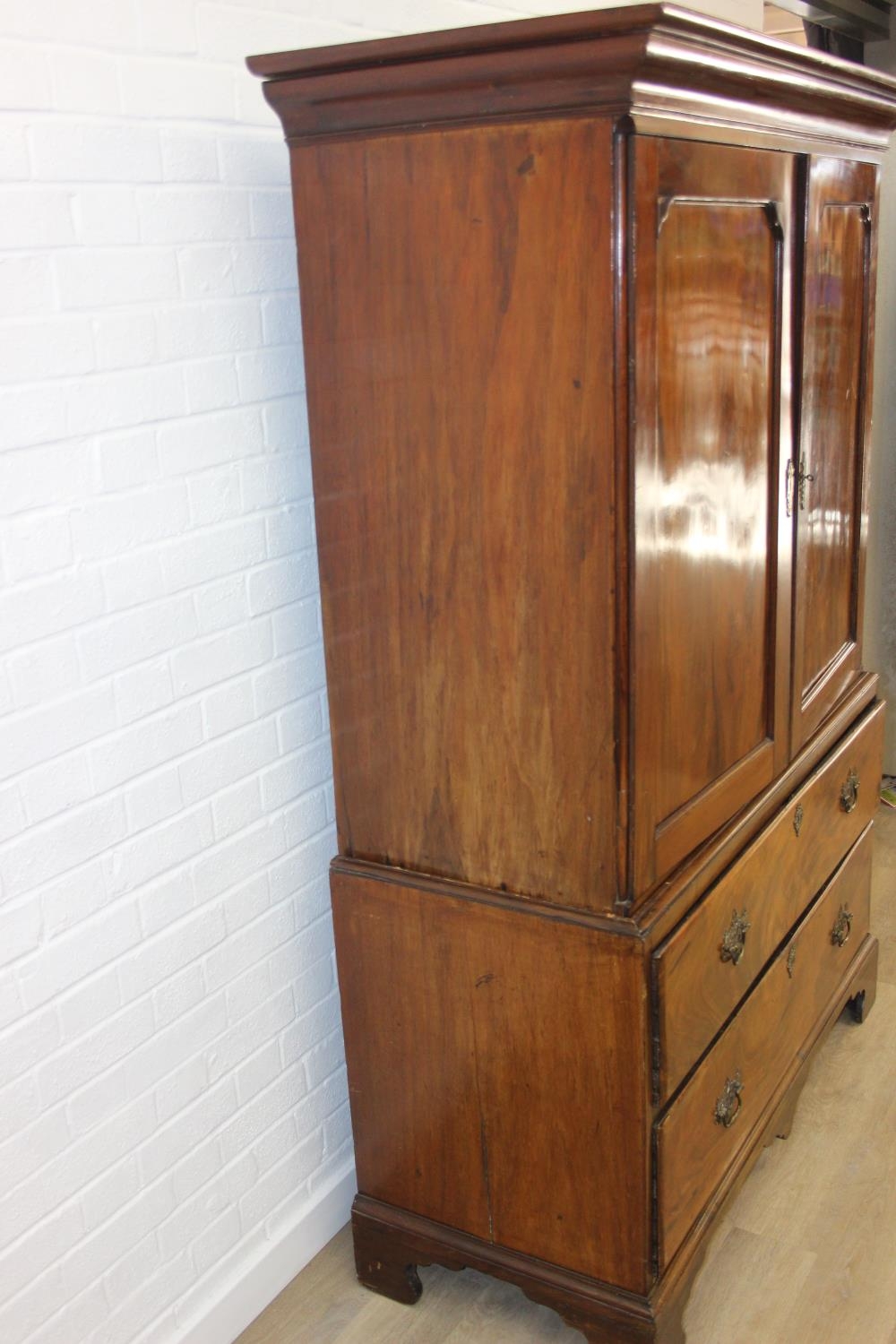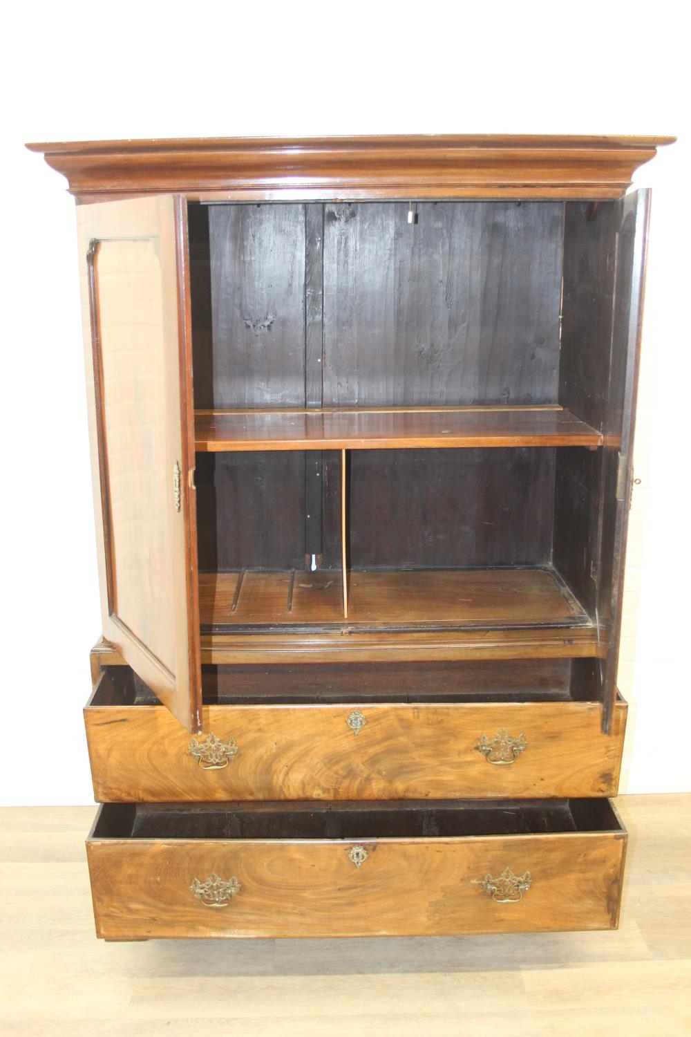 A 19th century mahogany linen press with two drawers to base and converted single shelf to interior top, 131cm x 56cm x 189cm