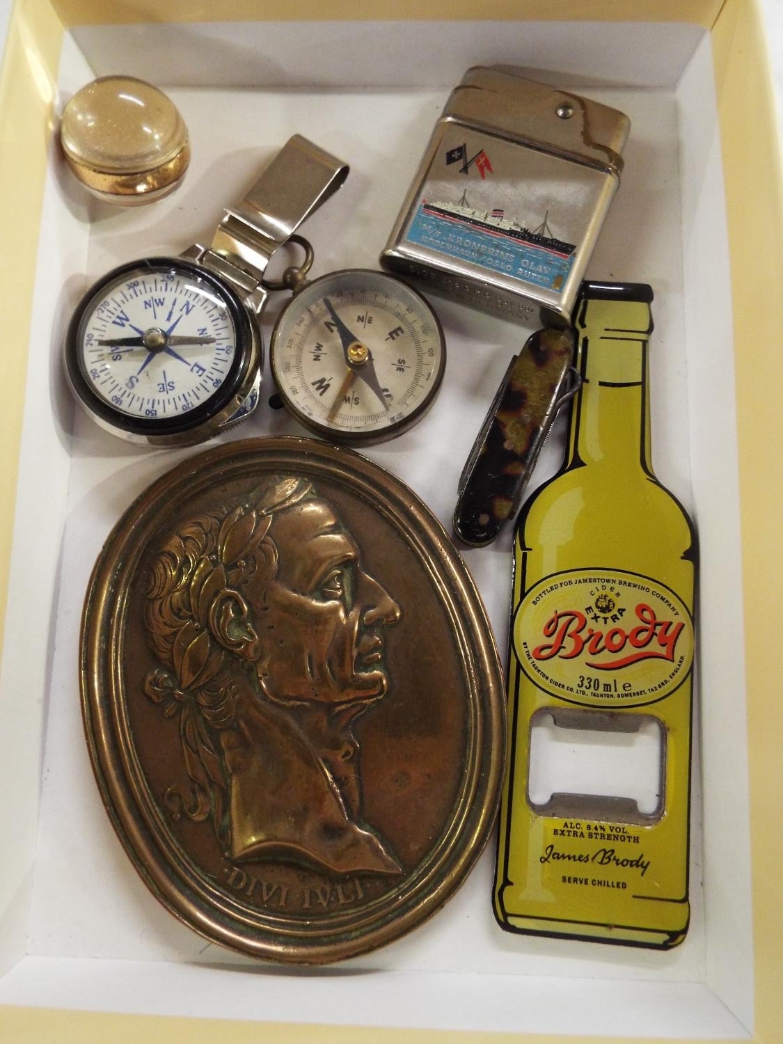 A mixed selection of items to include bottle opener, compasses, lighter, watches, penknife etc