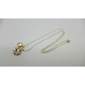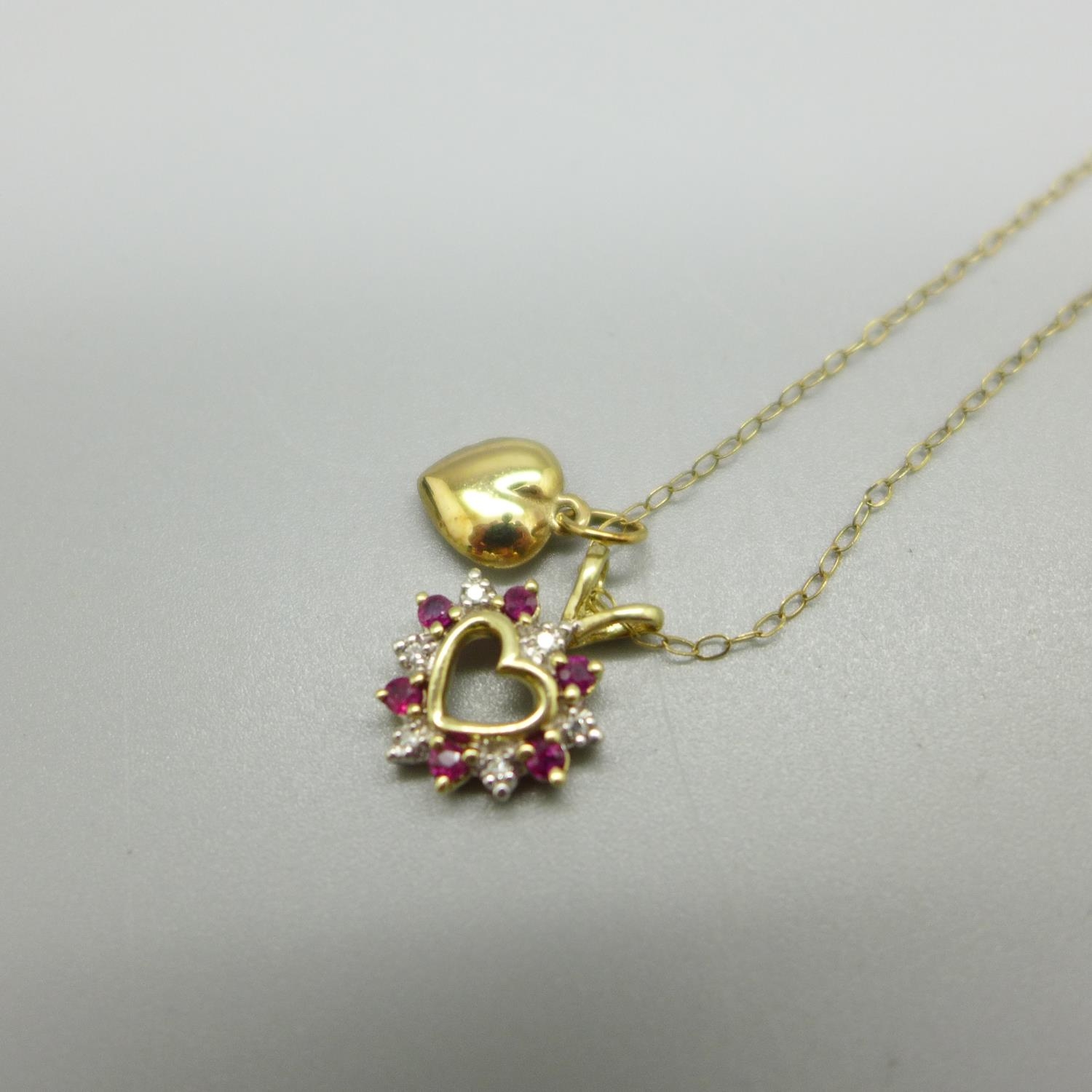 A 9ct gold, ruby and diamond pendant and chain, 1.7g