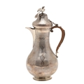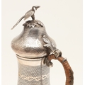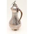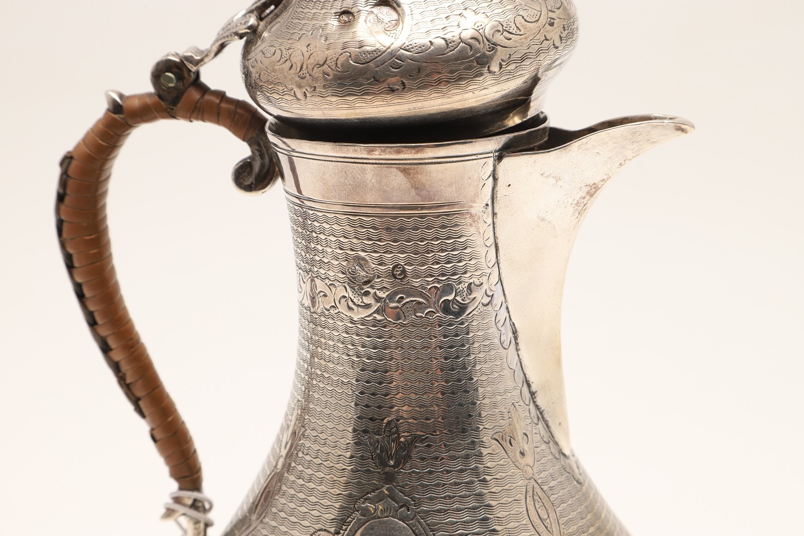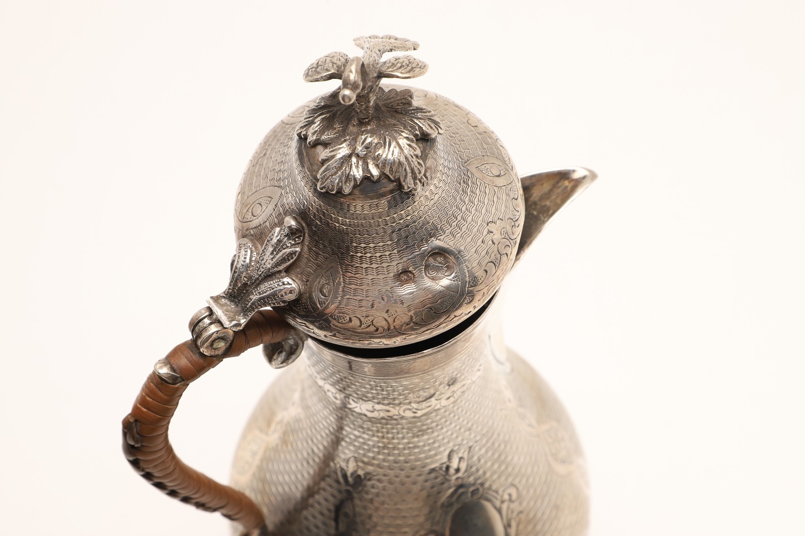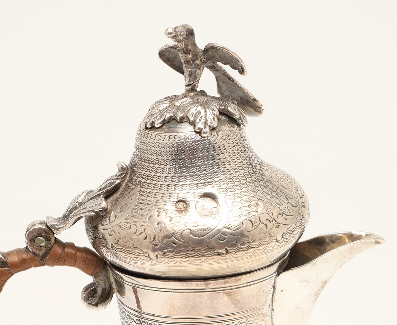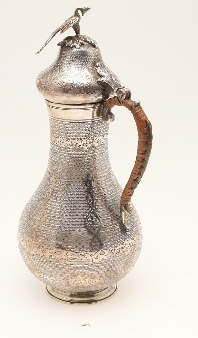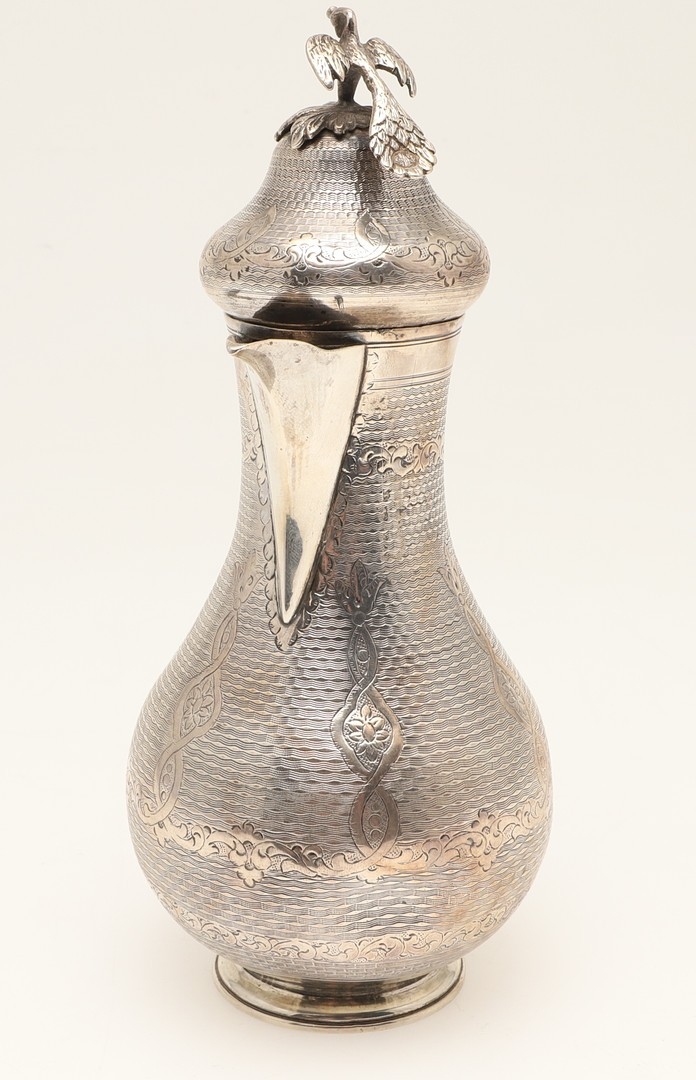 A TURKISH SILVER COFFEE POT. Of baluster form, engine turned and engraved decoration, the hinged top surmounted with a finial in the form of a bird. Hallmarks feature the tughra mark of the sultan and suggests early 20th century origin. Height 22cm, total weight 12.3ozt (weighed as 800 standard silver).