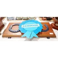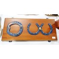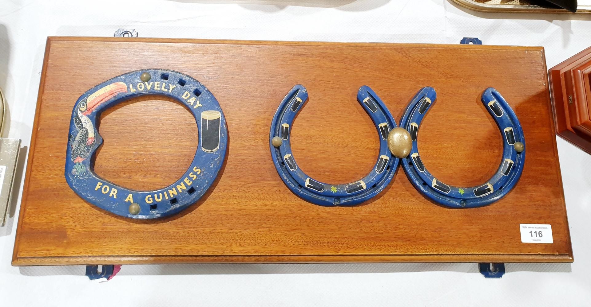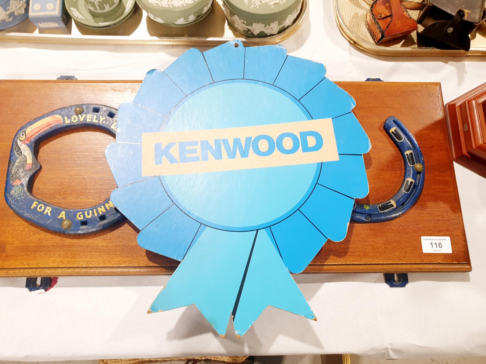 Three horseshoes with Guinness advertising painted on them mounted on a wall plaque, width 65.5cm together with a Kenwood advertising rosette. No shipping. Arrange collection or your own packer and shipper, please. Electricals are sold as scrap.