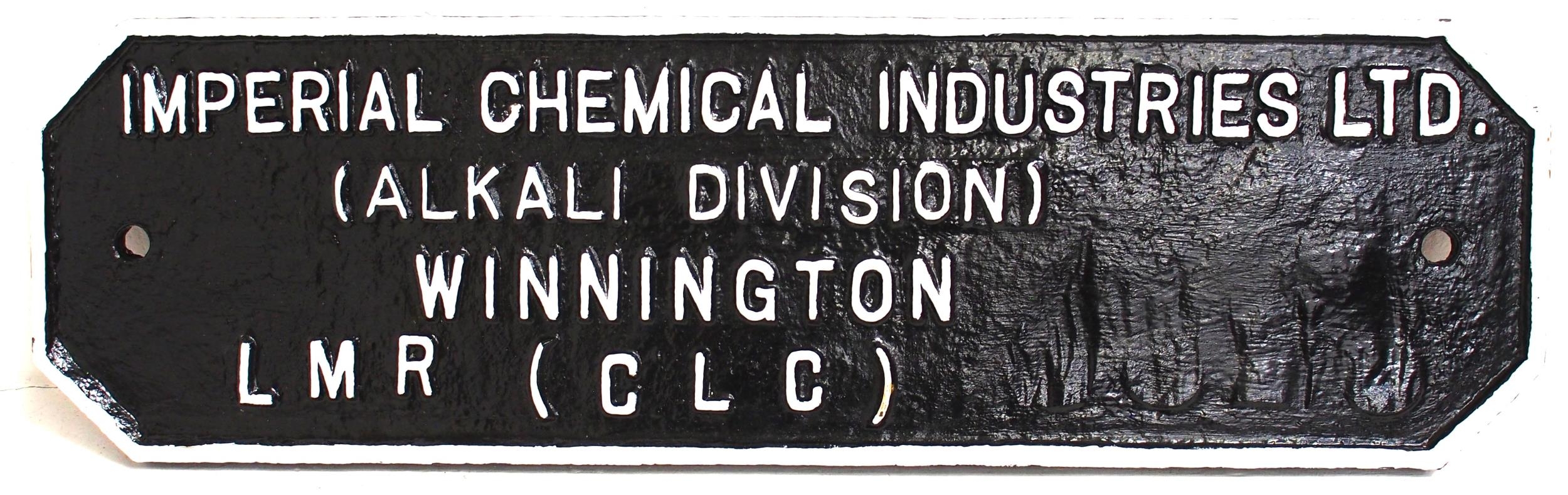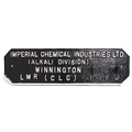 C/I wagonplate "IMPERIAL CHEMICAL INDUSTRIES LTD (ALKALI DIVISION) WINNINGTON LMR (CLC)" 29¼"x 8¾", repainted front original back. (C/D) (Dispatch by Mailboxes/Collect from Banbury Depot)