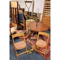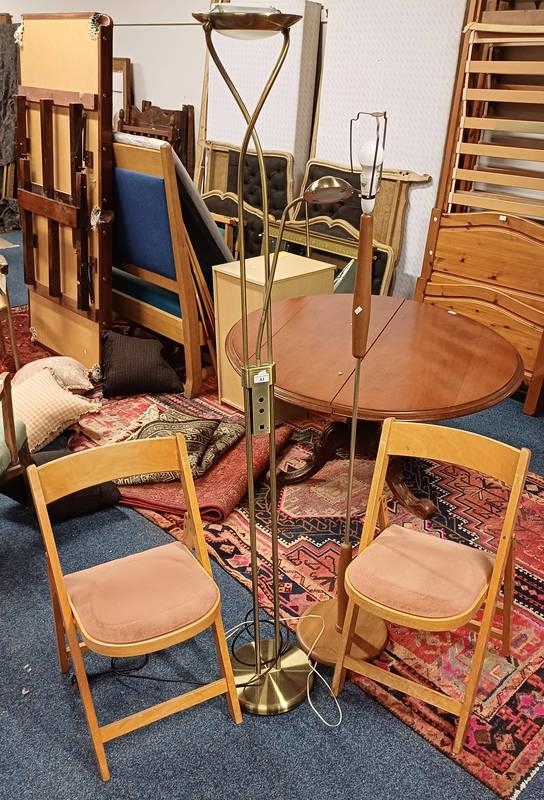 TEAK & METAL STANDARD LAMP ON CIRCULAR BASE, METAL UPLIGHTER & PAIR OF FOLDING CHAIRS