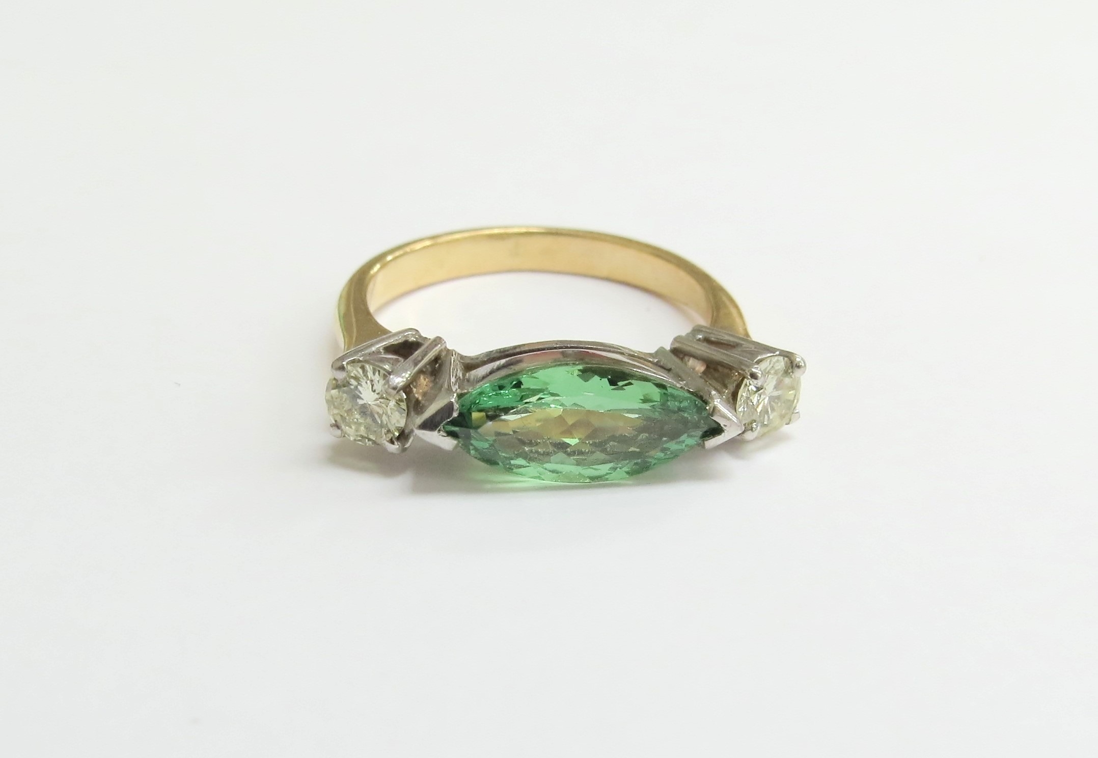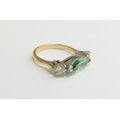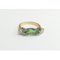 A gold ring set with an elliptical shaped green stone flanked by pale yellow diamonds, unmarked. Size M/N, 4.8g