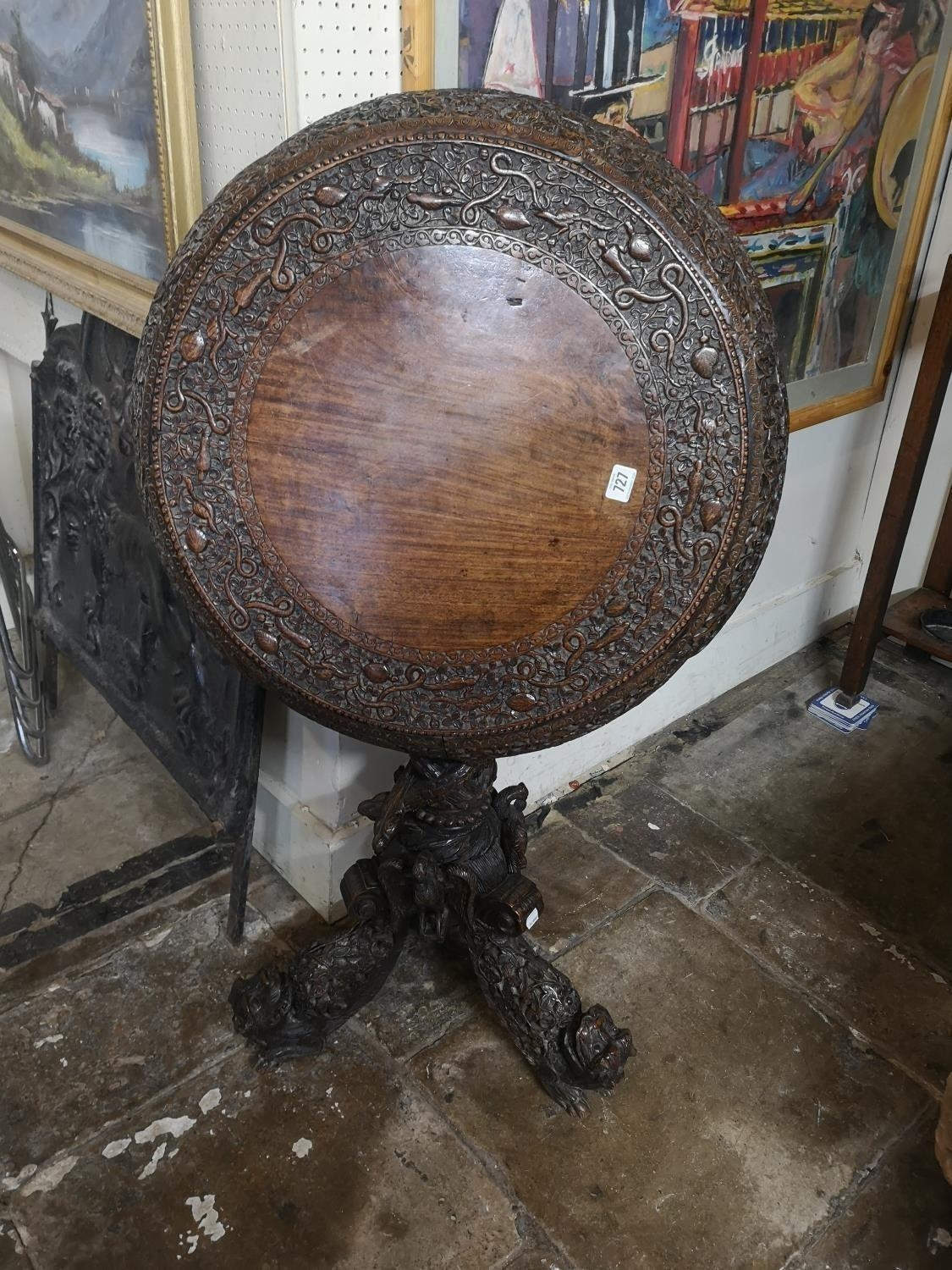 The circular top with heavily carved and pierced apron, raised on a intertwined turned column the splayed legs in the form of mythical beasts.