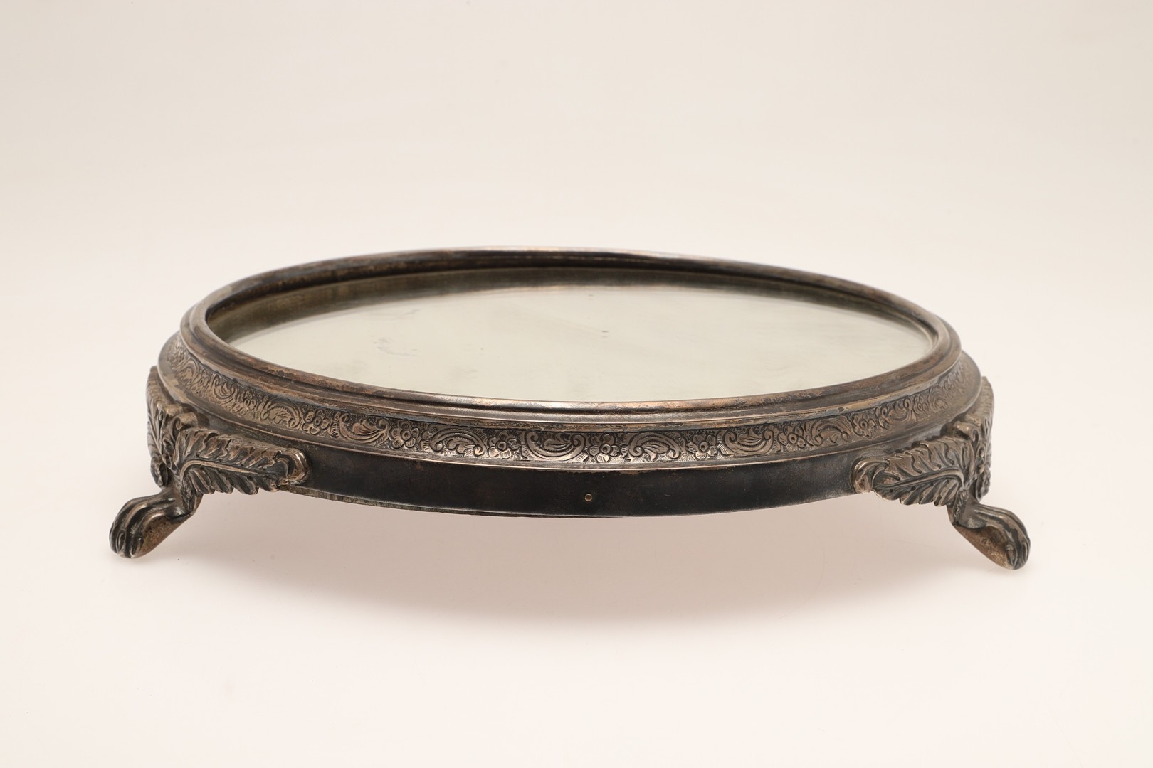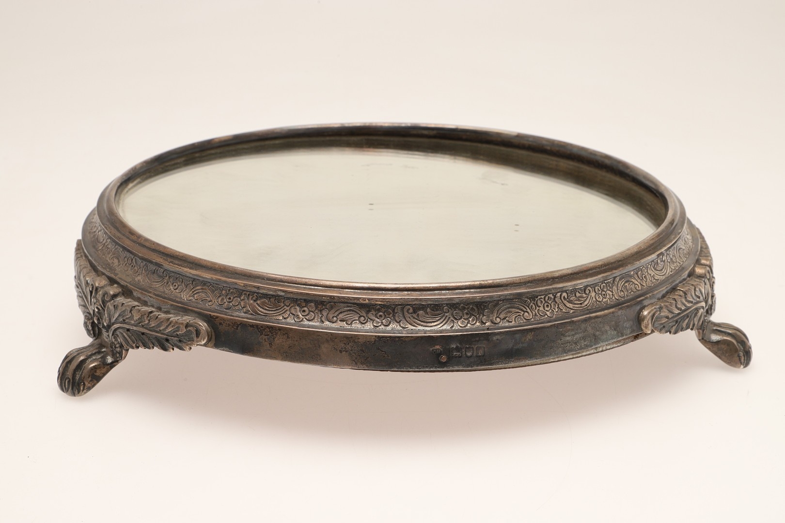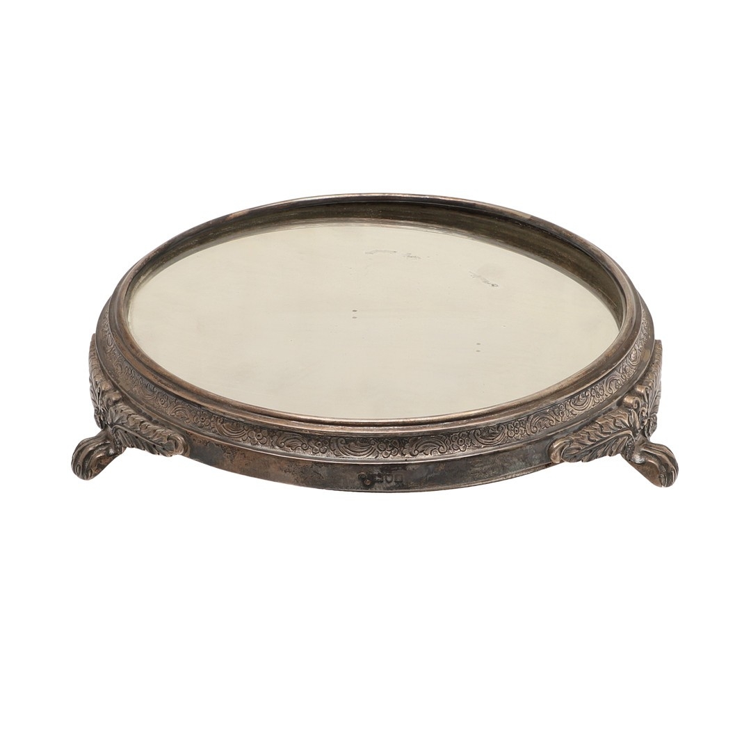 A LATE VICTORIAN / EARLY EDWARDIAN SILVER MIRRORED CAKE STAND. Of circular form, the silver frame with engraved foliate decoration and stood on three paw feet, inset with a circular mirror. Hallmarked Charles Boyton (III), London, 1901. Height 7cm x Diameter 31cm.