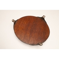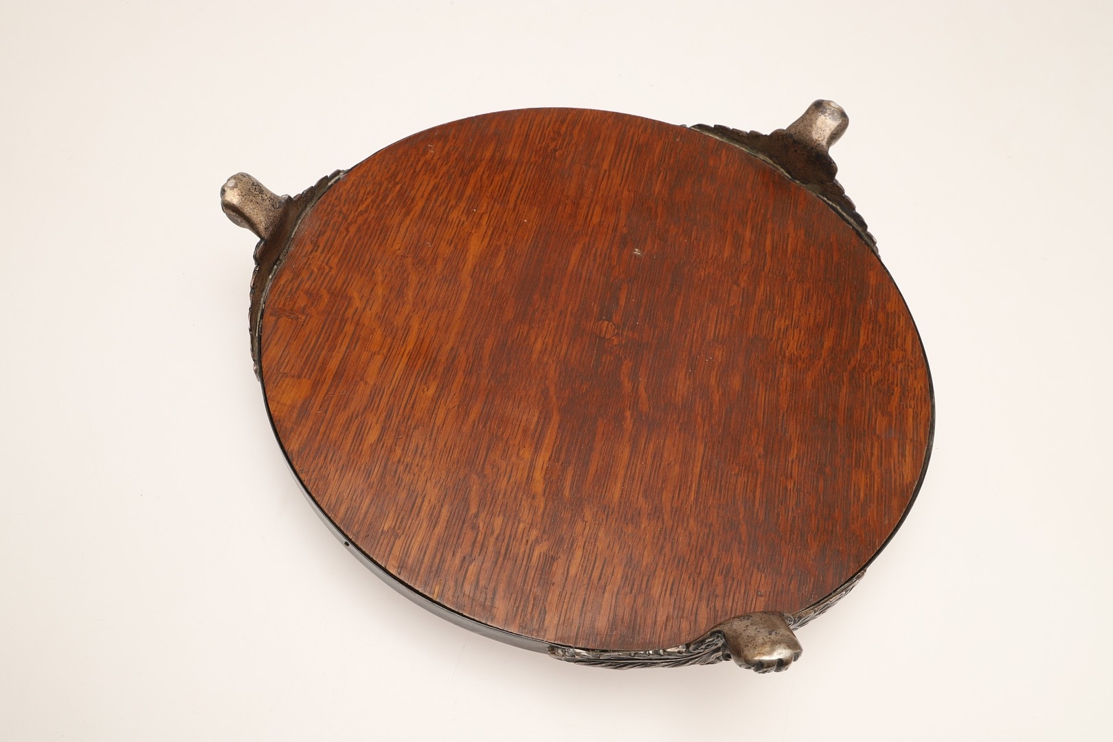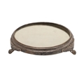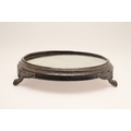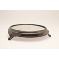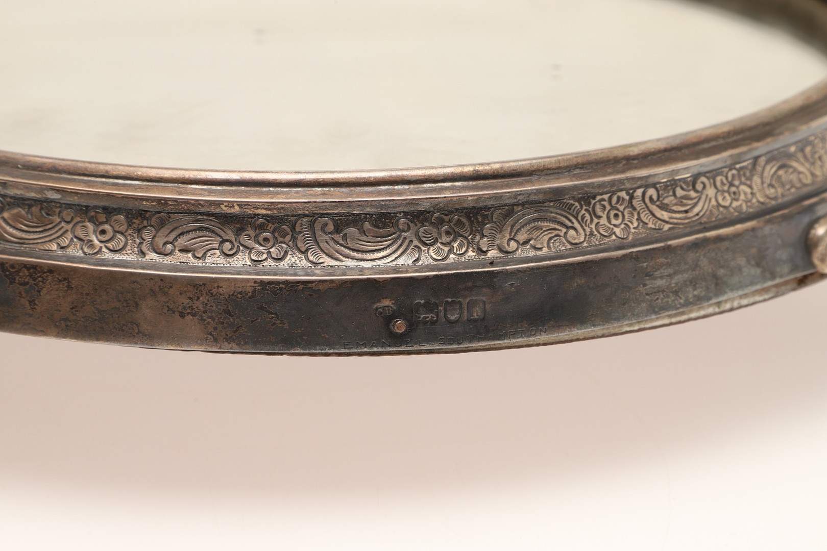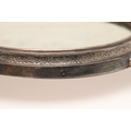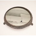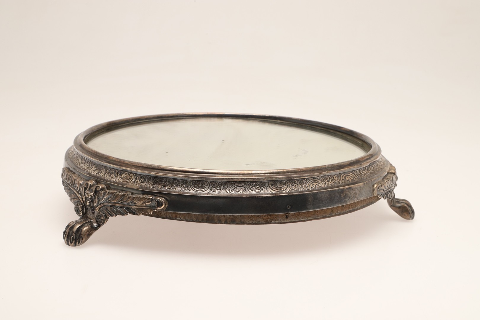 A LATE VICTORIAN / EARLY EDWARDIAN SILVER MIRRORED CAKE STAND. Of circular form, the silver frame with engraved foliate decoration and stood on three paw feet, inset with a circular mirror. Hallmarked Charles Boyton (III), London, 1901. Height 7cm x Diameter 31cm.