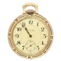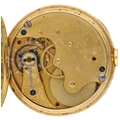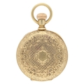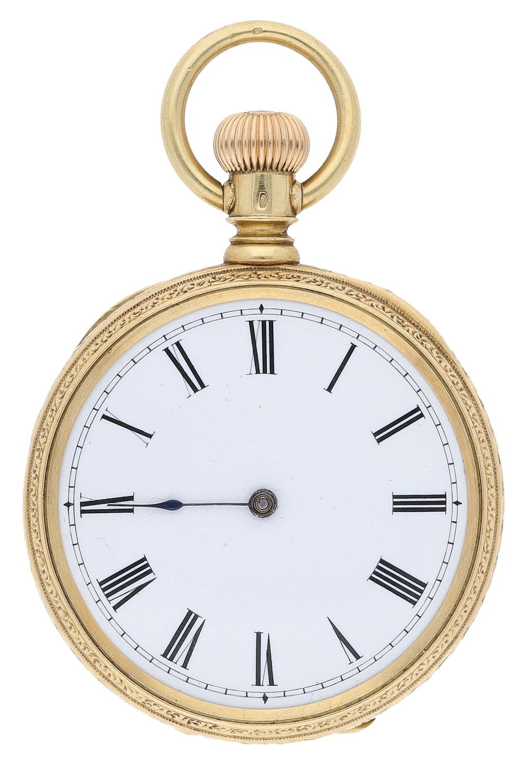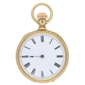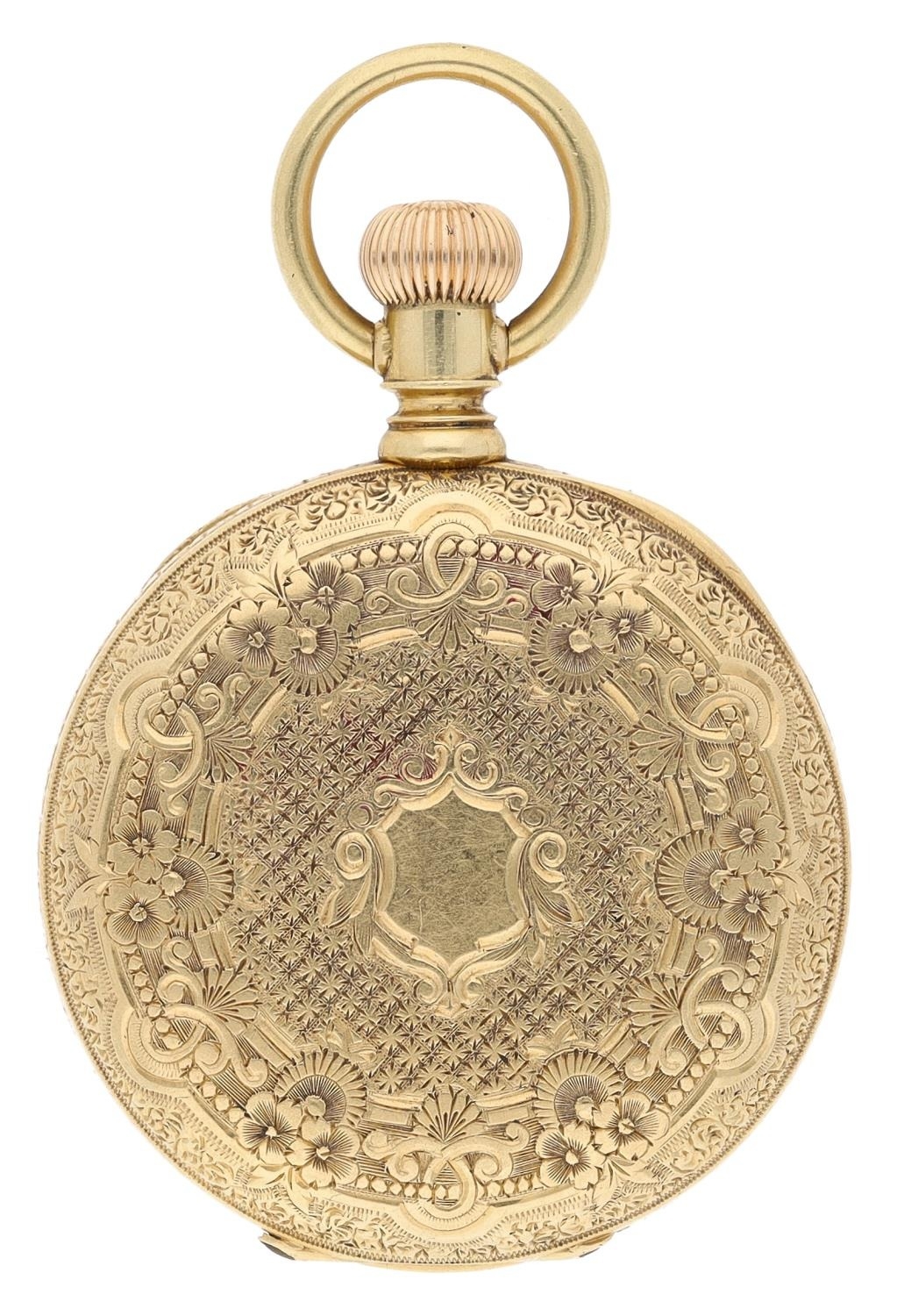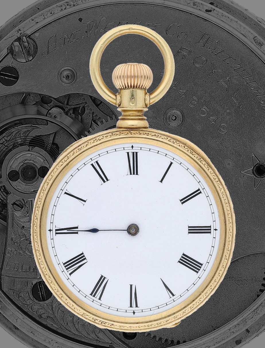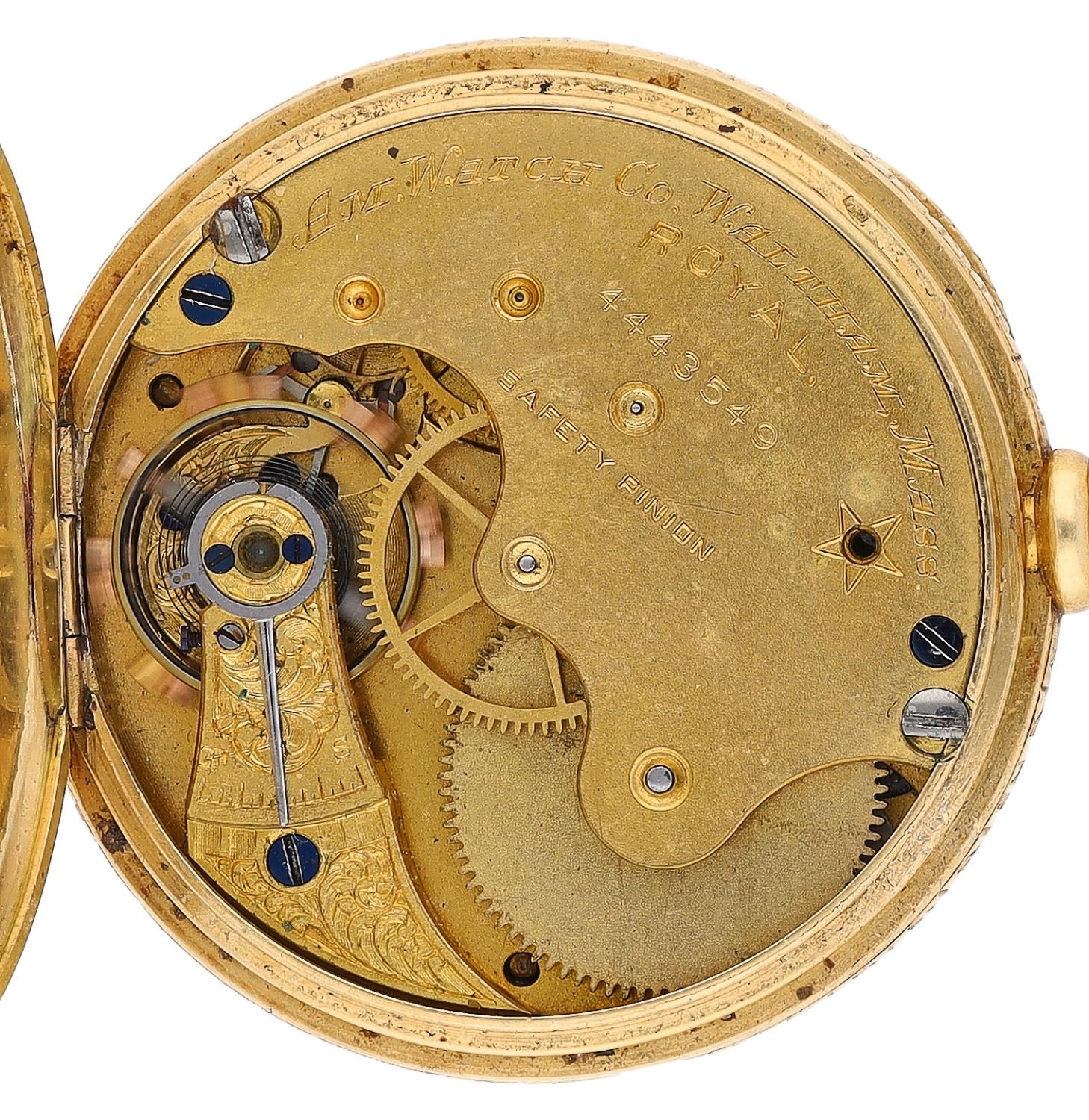 American Waltham 'Royal' 18ct lever pocket watch, serial no. 4443549, circa 1889, signed movement with safety pinion, compensated balance and regulator, hinged 18ct cuvette, the dial with Roman numerals and minute track, within an intricately engraved case, 55.1gm, 39mm (lacking glass an minute hand)