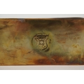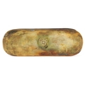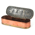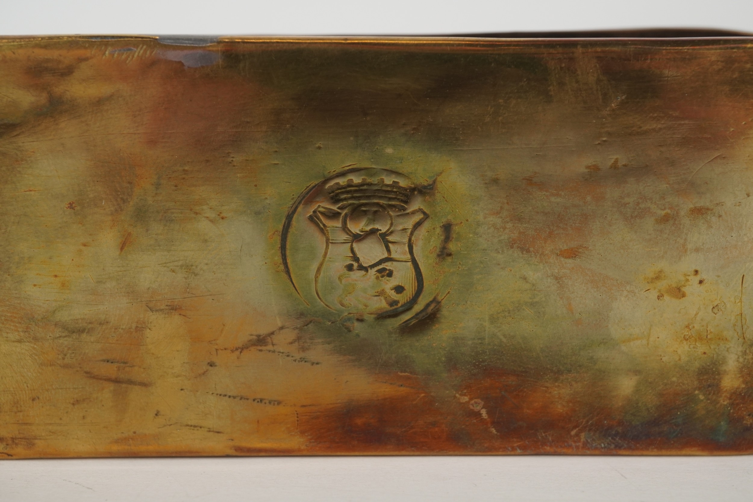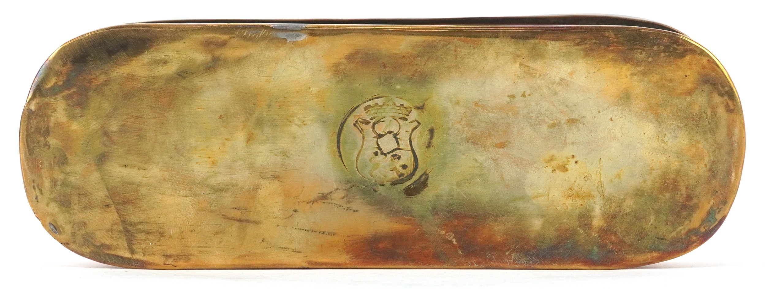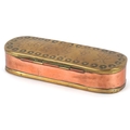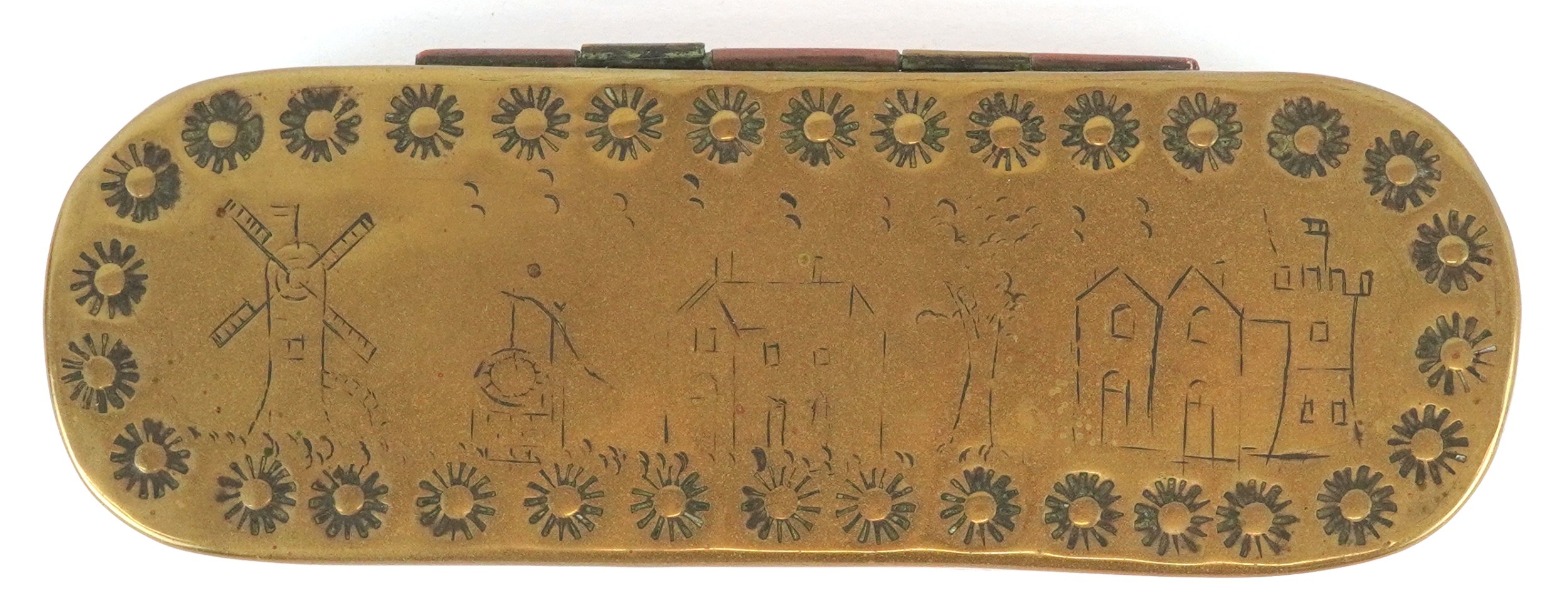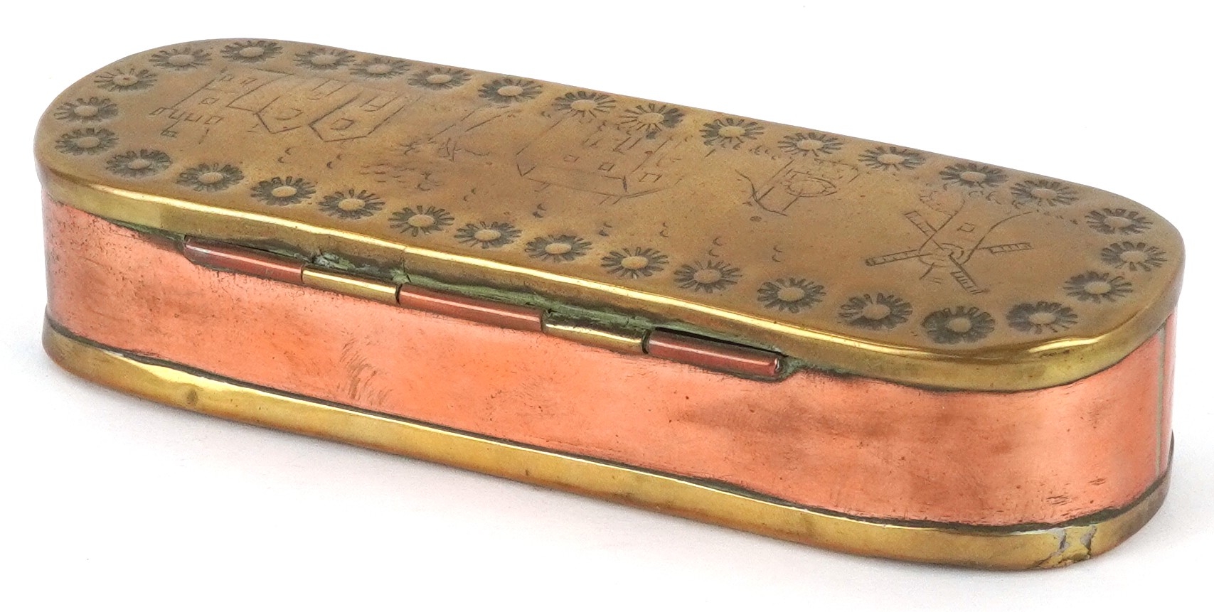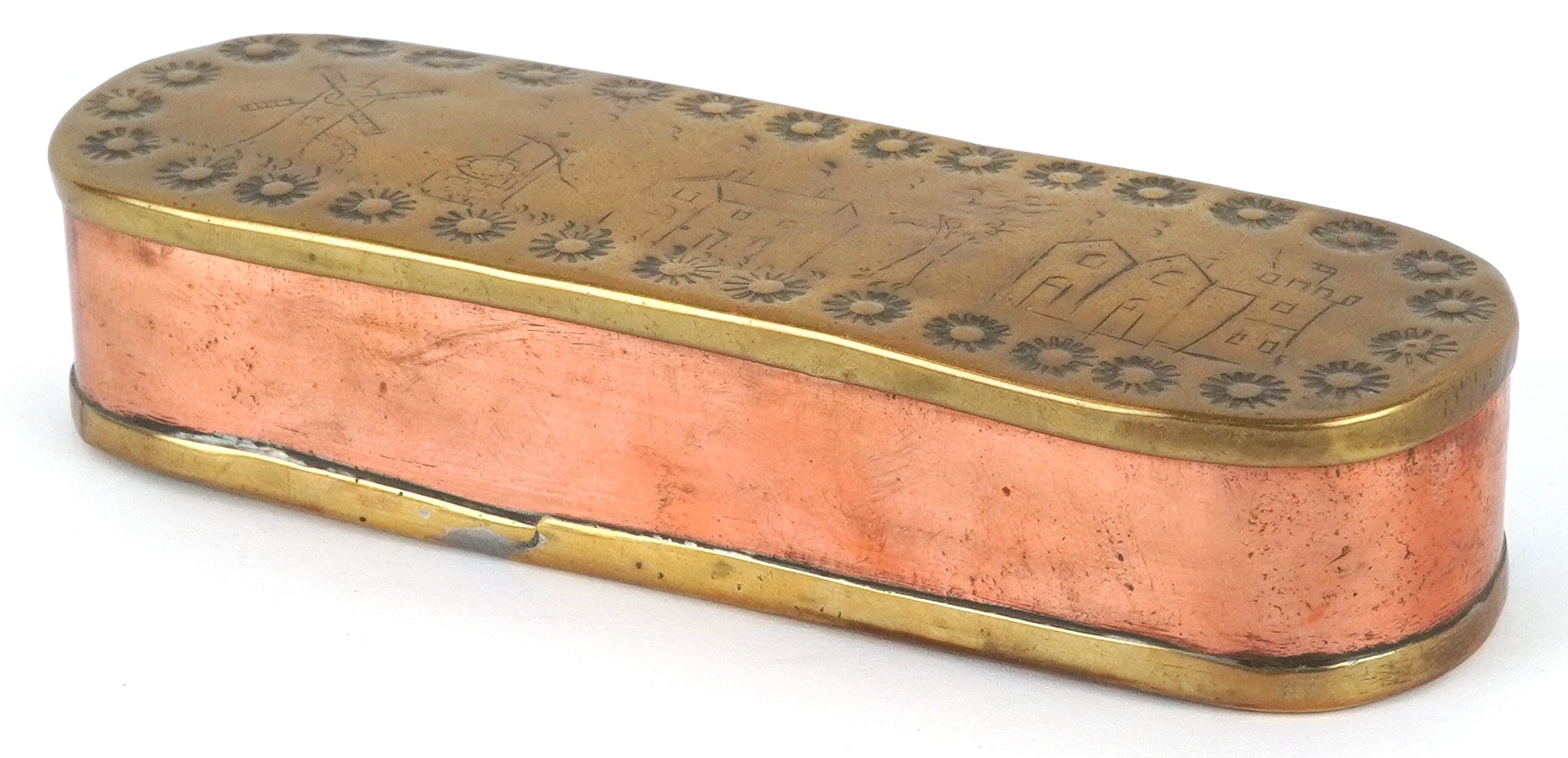 An 18th century Dutch brass and copper tobacco box, the top decorated with a windmill and buildings, the underside having an impressed coat of arms, 16cm wide.