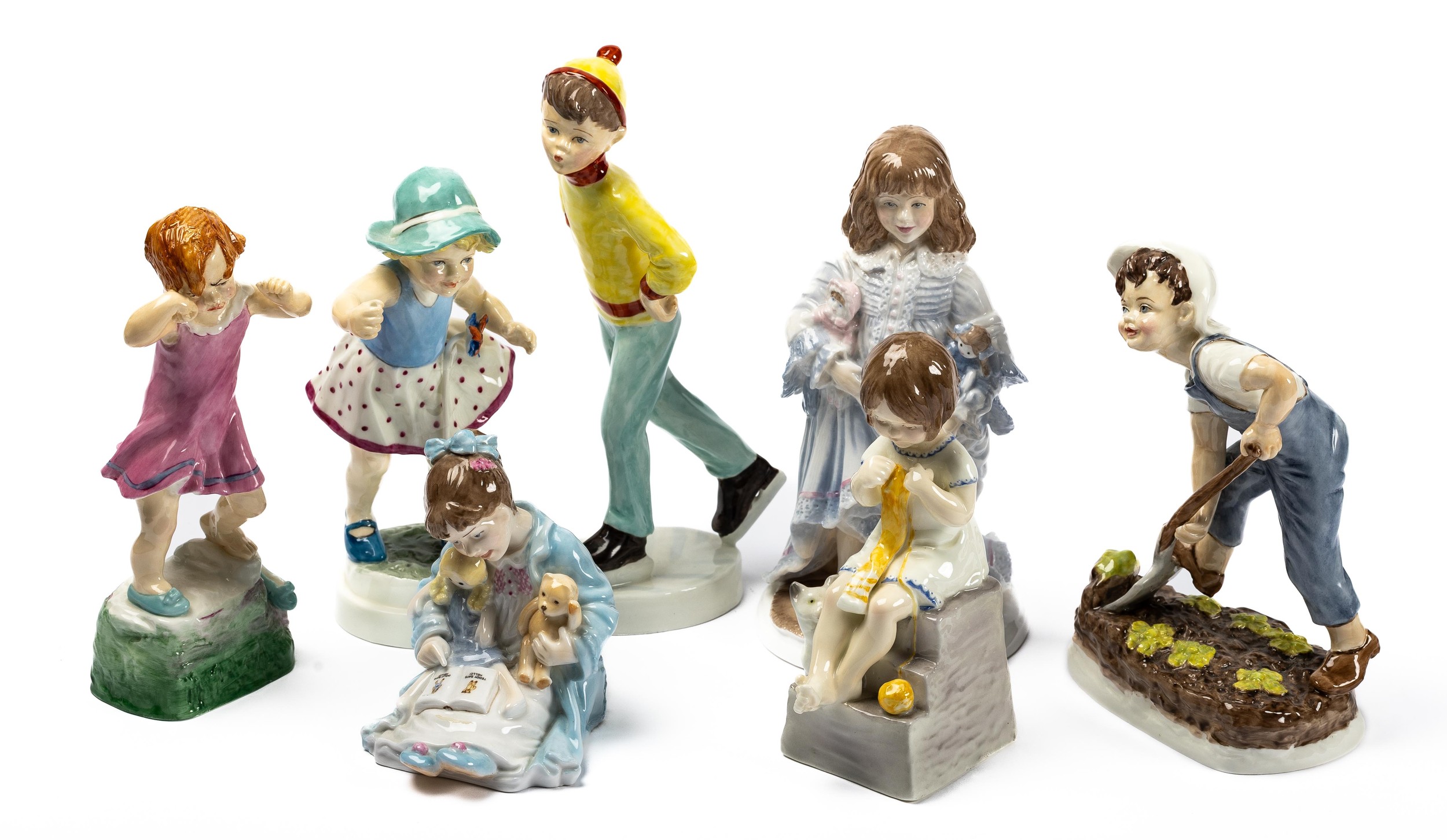 Royal Worcester, a range of seven Royal Worcester figurines. Includes; Tuesday’s child is full of grace (3534), Wednesday’s child knows little woe (3259), Saturday’s child works hard for a living (3524) plus other, Sabbath Day (3518). Plus, Katie’s Day Storytime and Lullaby. Seven total. (7)