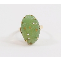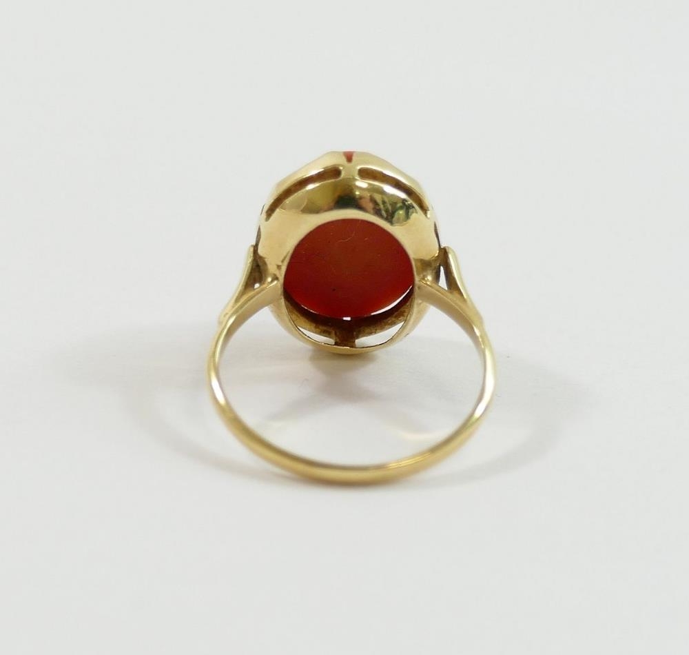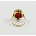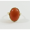 An oval coral cabochon in unmarked yellow metal ring mount, finger size K, 3.7g gross