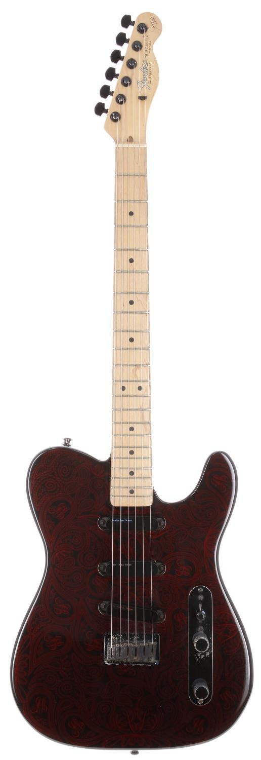 1993 Fender James Burton Signature Telecaster electric guitar, made in USA; Body: red/black paisley finish, light surface scratches to back; Neck: maple; Fretboard: maple, light wear to treble side; Frets: light wear; Electrics: working; Hardware: generally good, some tarnishing spots to bridge and control plate; Case: original hard case with tags; Weight: 3.54kg; Overall condition: good for age