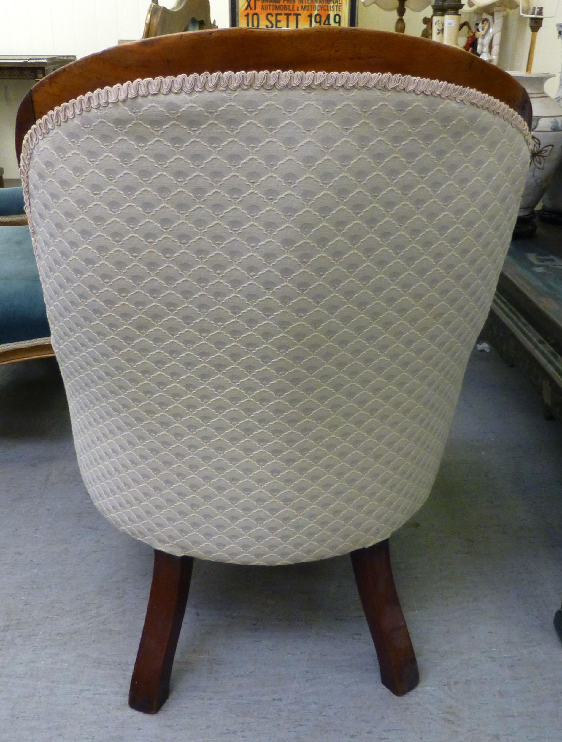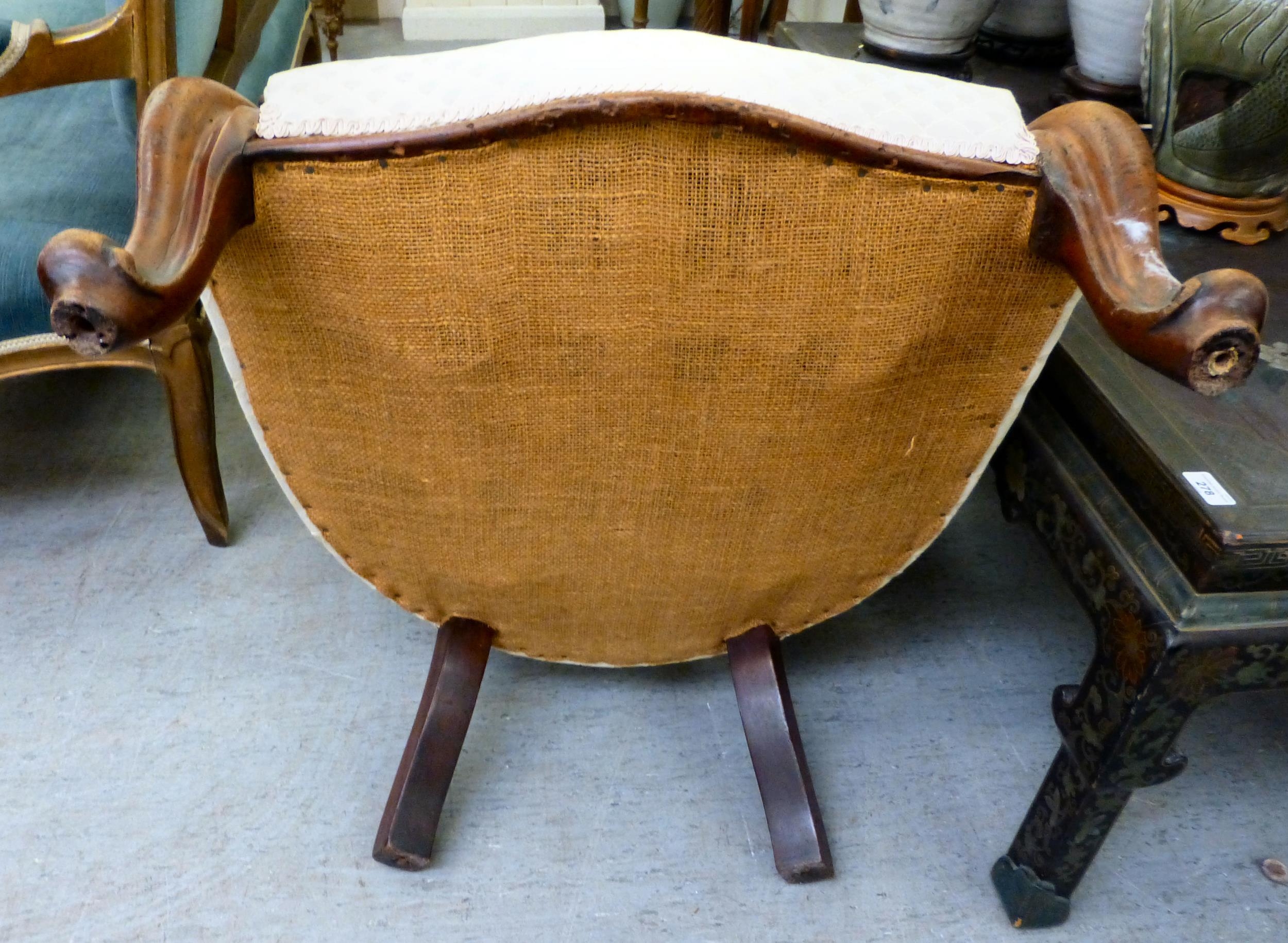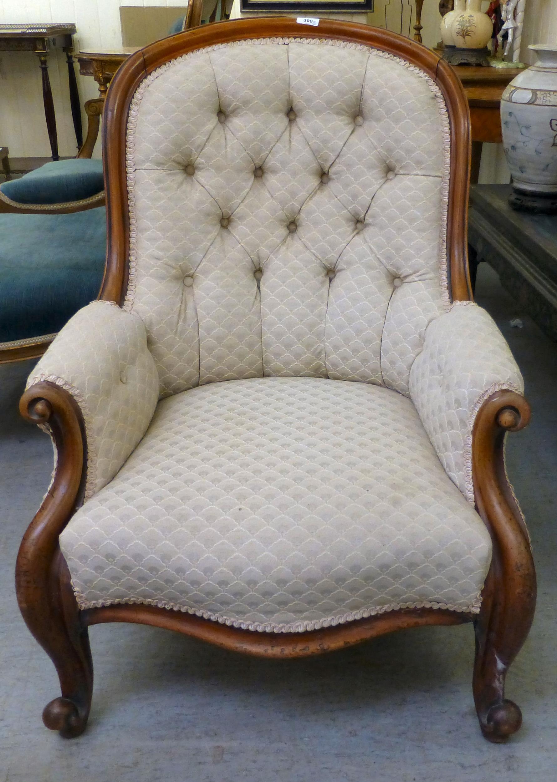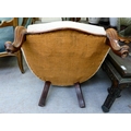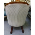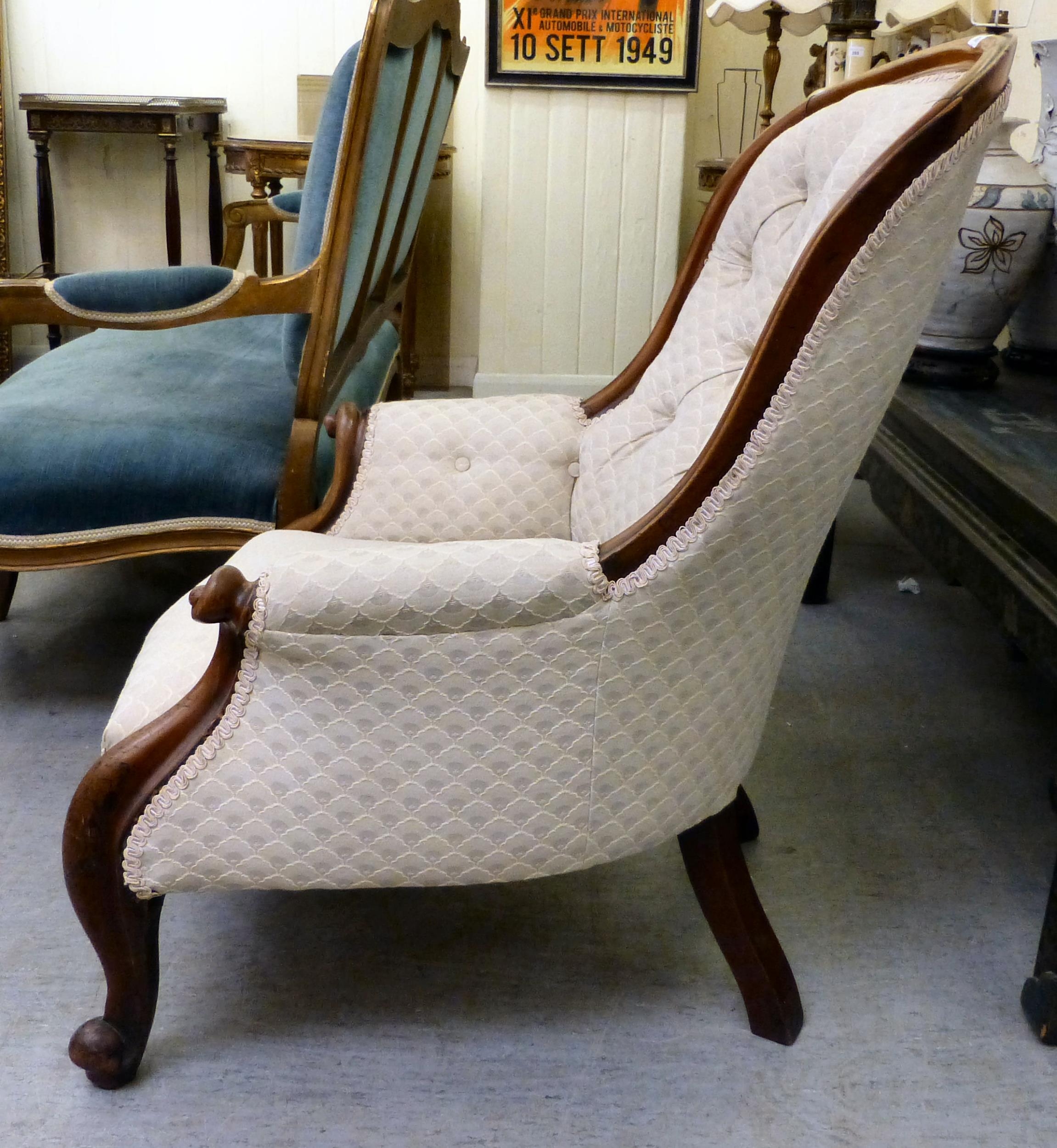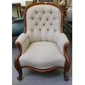 A late 19thC mahogany framed salon chair with a cream fabric upholstered back and seat, raised on cabriole legs