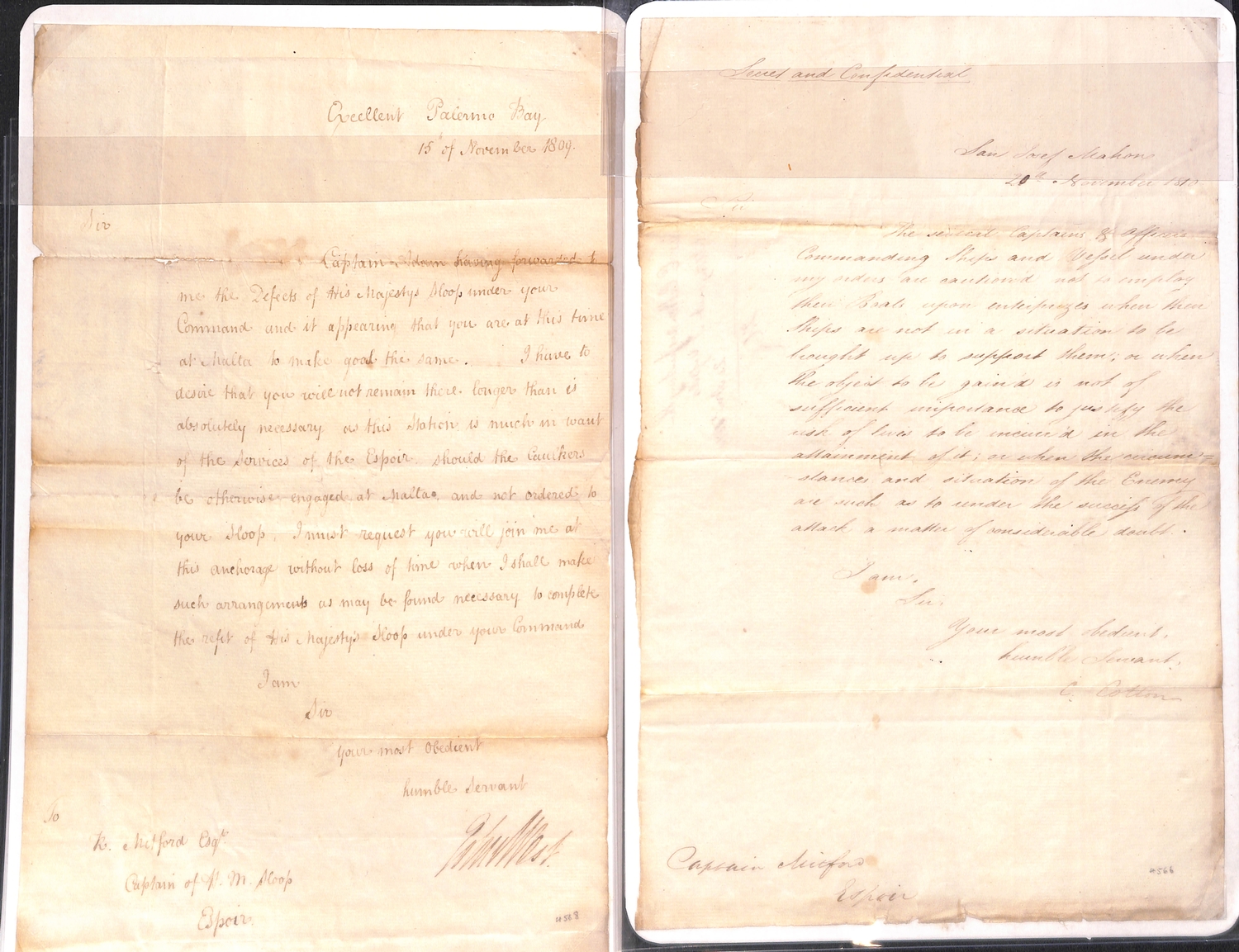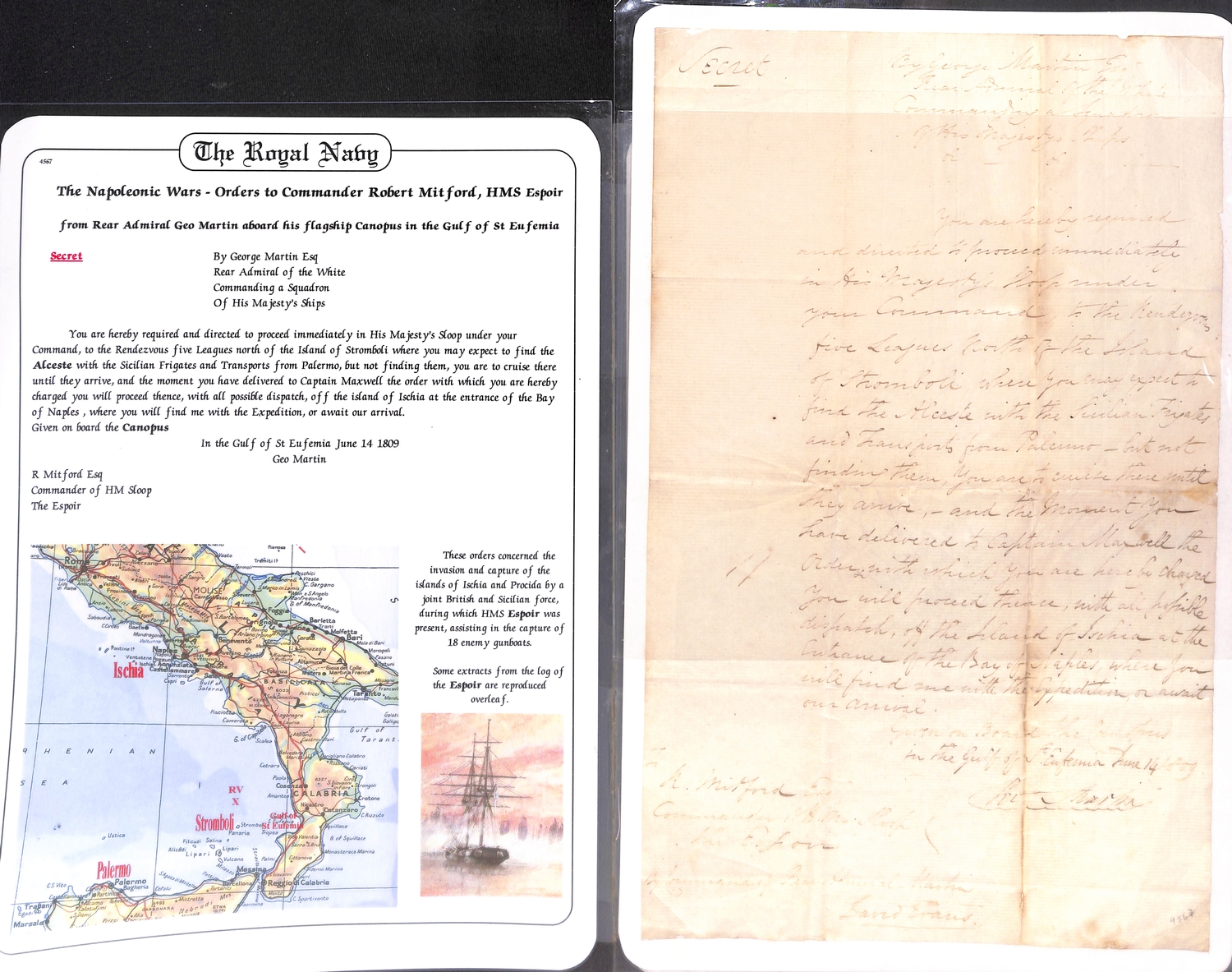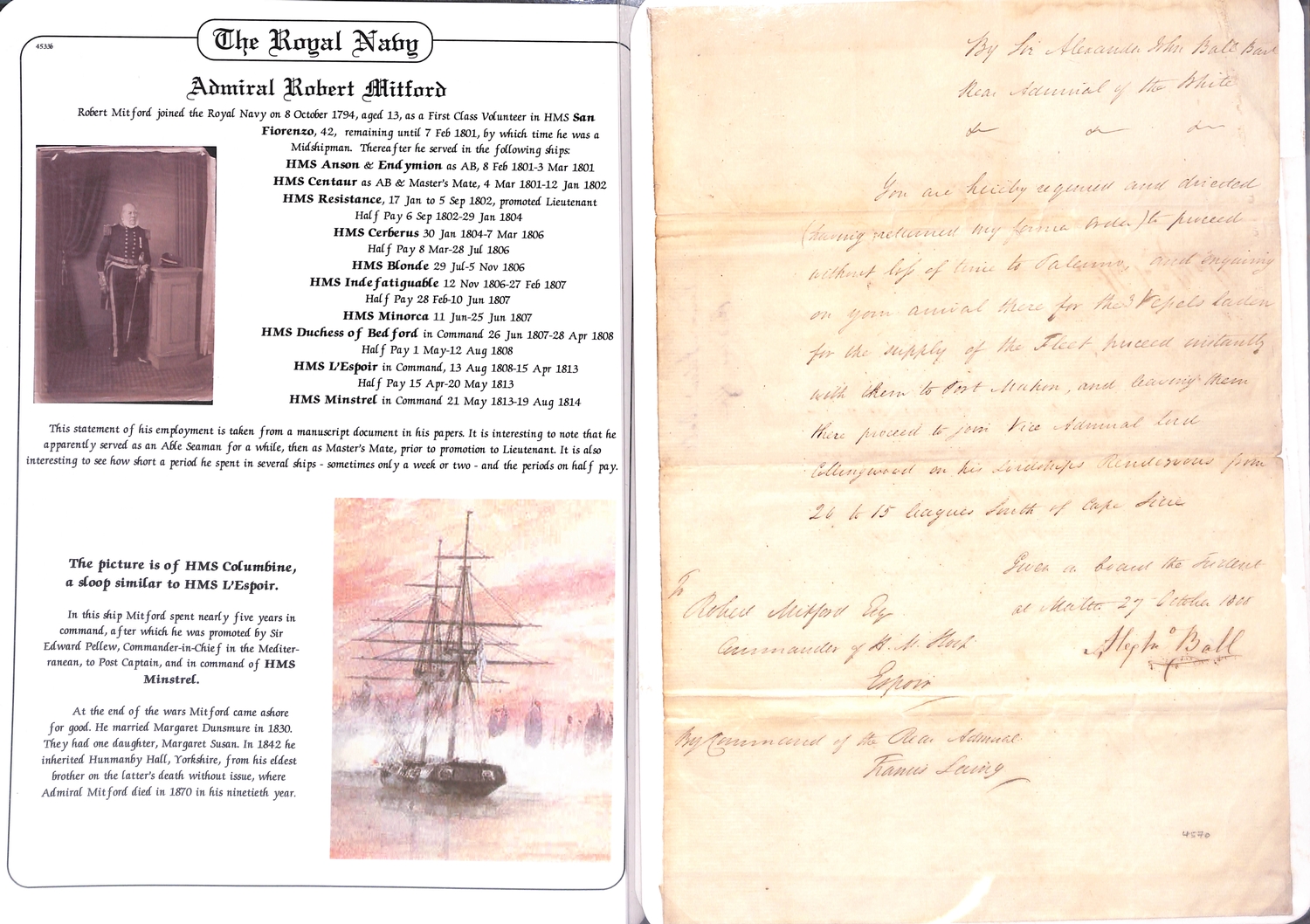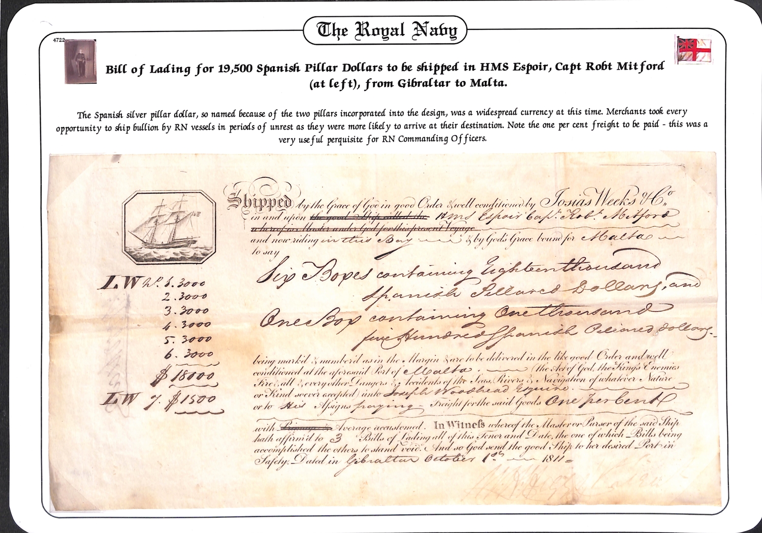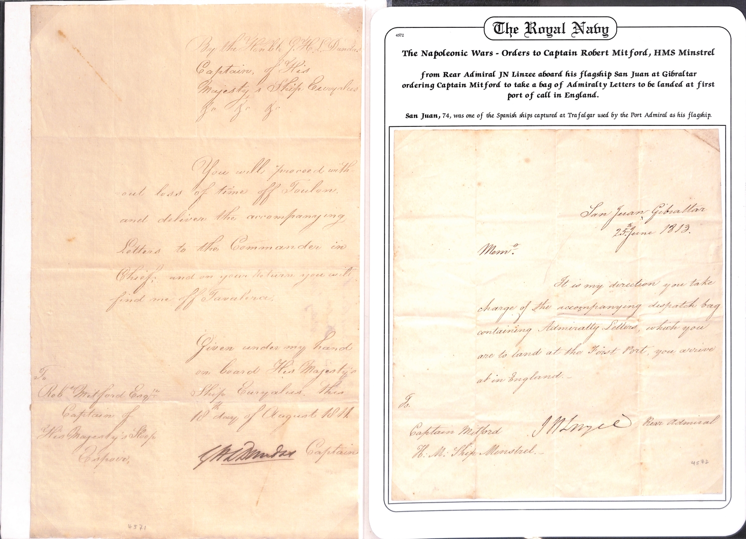 1808-13 Orders all to Robert Mitford, commanding H.M Sloop "Espoir"; comprising 1808 (Oct. 27) order from Admiral Sir Alexander Ball "on the Trident at Malta" ordering Mitford to proceed to Palermo, escort three supply vessels to Port Mahon then rendezvous with Admiral Collingwood; 1809 (June 14) order from Admiral Sir George Martin "on the Canopus in the Gulf of St. Eufemia" ordering Mitford to rendezvous with the "Alceste" and Sicilian frigates and transports near Stromboli, deliver an order to Capt. Maxwell then proceed to Ischia; 1809 (Nov. 15) order from Capt. John West on the "Excellent Palermo Bay" requesting Mitford get his ship repaired at Malta as quickly as possible but if caulkers are otherwise engaged proceed to Palermo Bay; 1810 (Nov 20) order from Admiral Sir Charles Cotton on "San Josef, Mahon" warning against enterprises where ships cannot offer support or where the object to be gained does not justify the risk of lives to be incurred; 1811 (Aug 18) order from Capt. G.H Dundas on H.M.S "Euryalus" to proceed with letters to Toulon then return off Talavera; 1813 (June 25) order from Admiral J.N Linzee on "San Juan Gibraltar" to Mitford on H.M.S "Minstrel" conveying a bag of Admiralty letters to Mitford to be landed at the first port in England; also an 1811 bill of lading for seven boxes containing 19,500 Spanish Pillar Dollars shipped from Gibraltar to Malta in the "Espoir". An interesting lot with some notable signatures. (7).