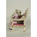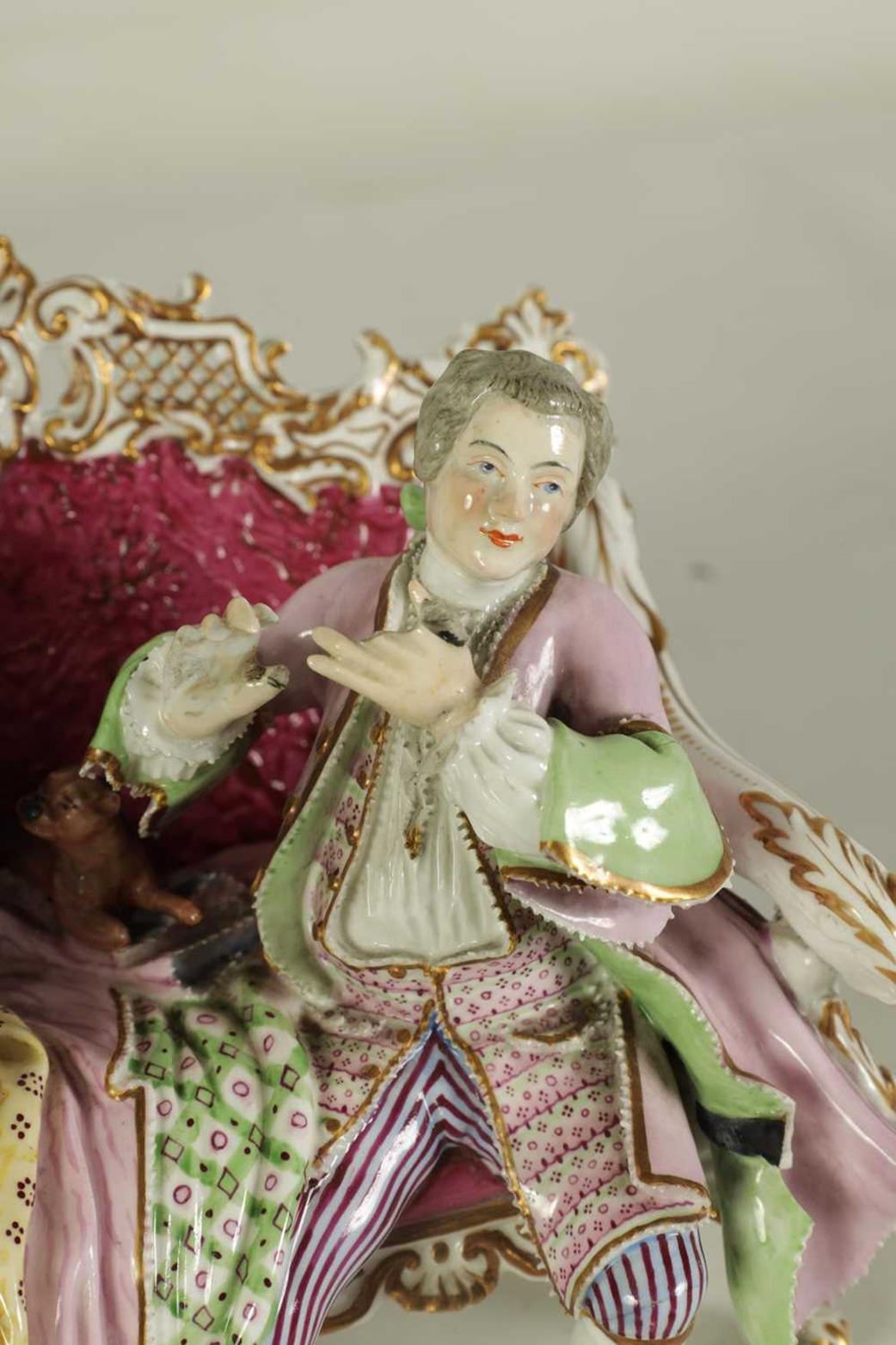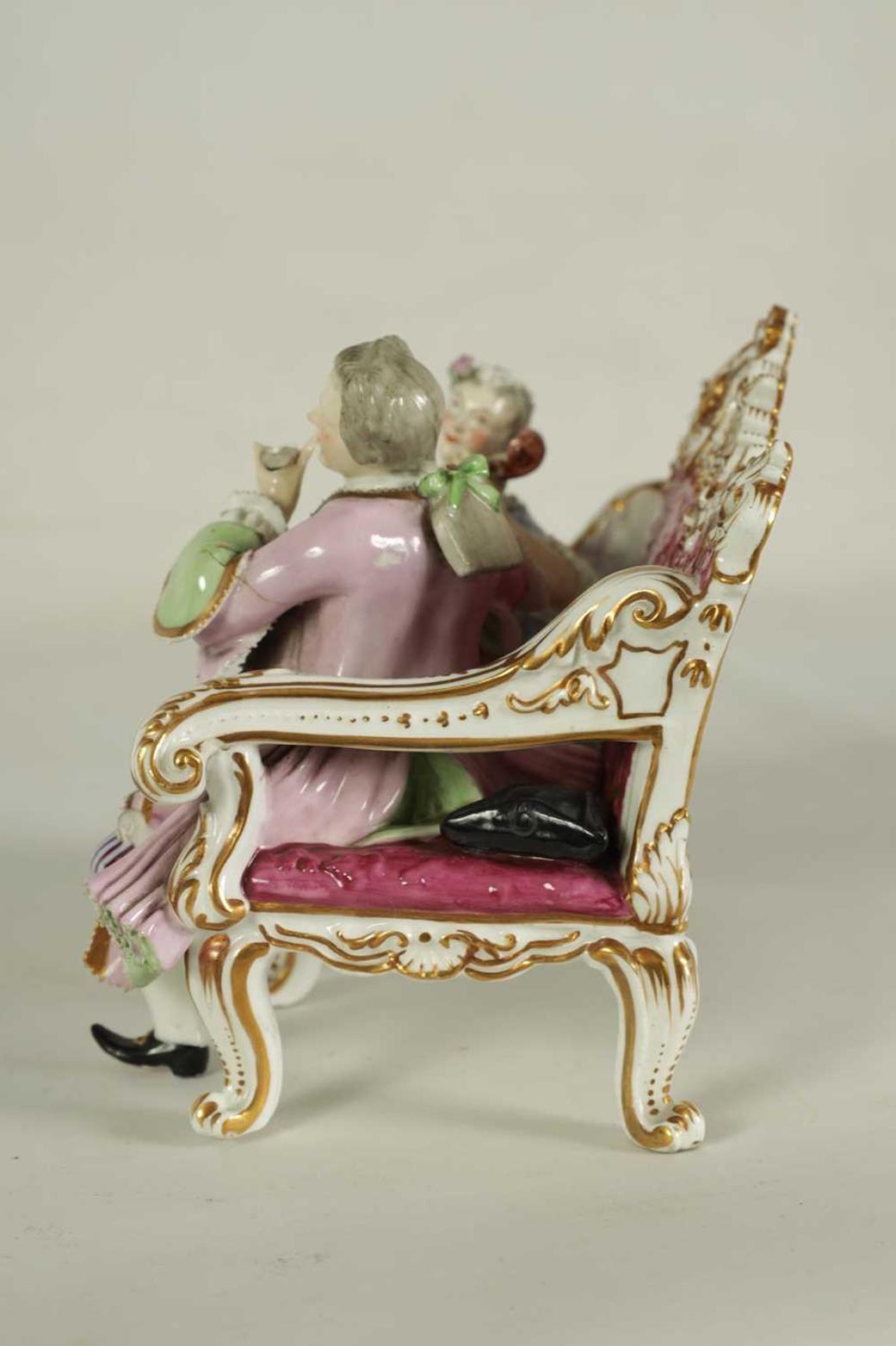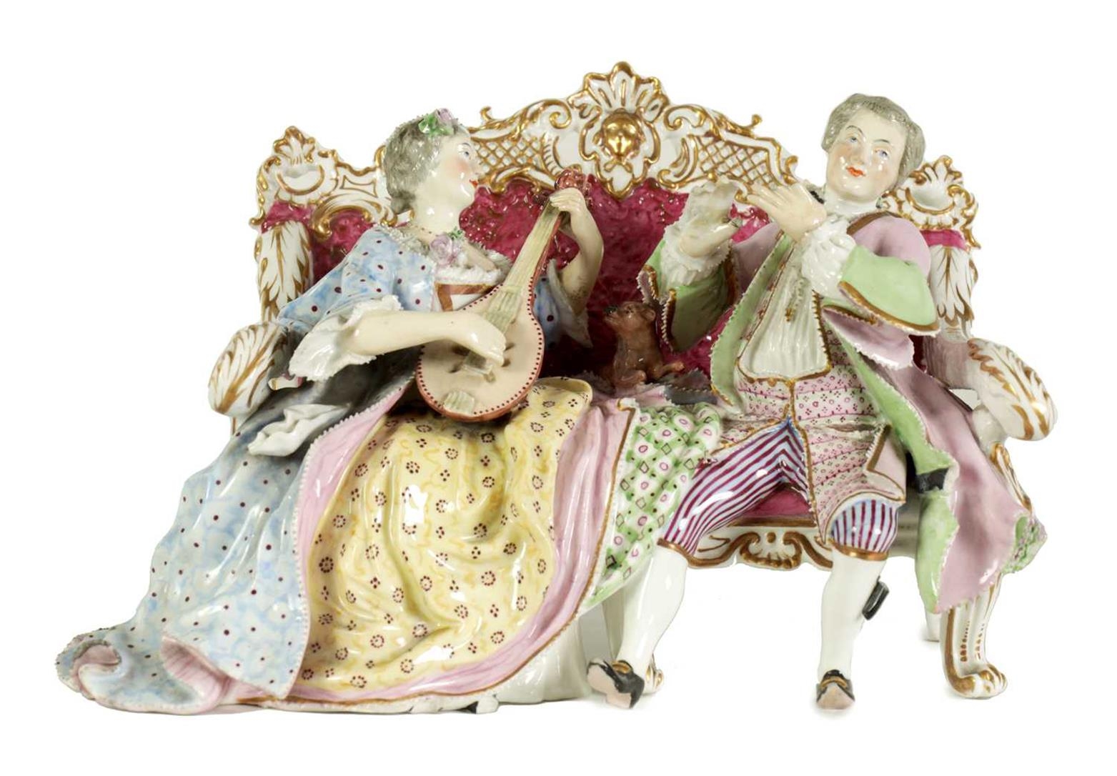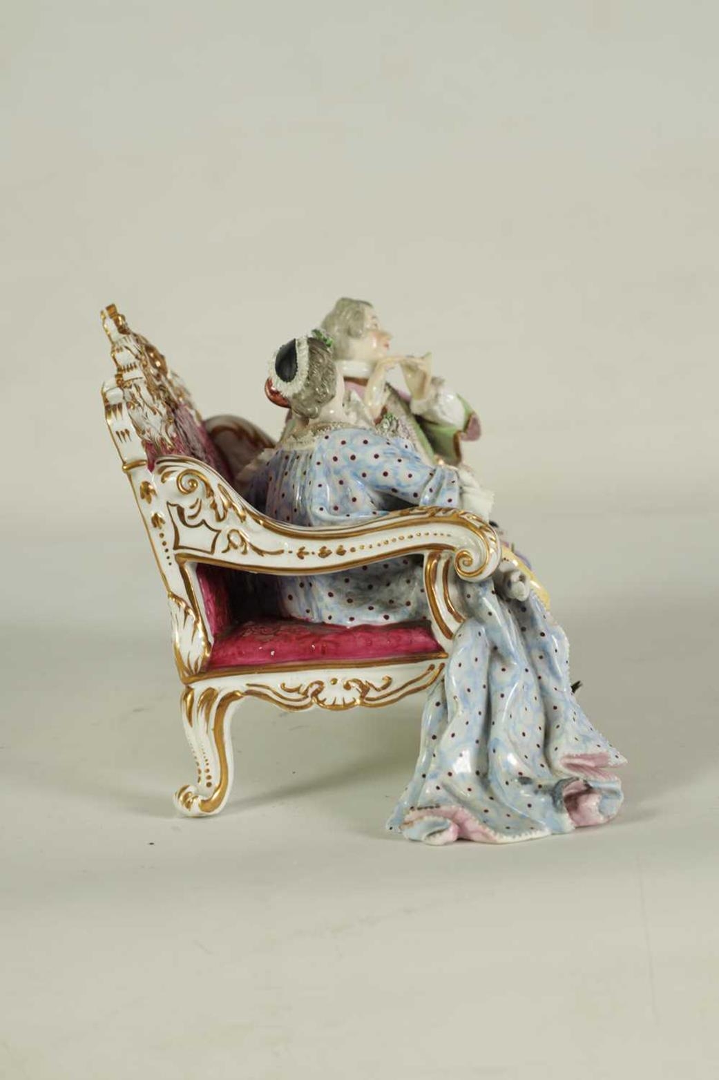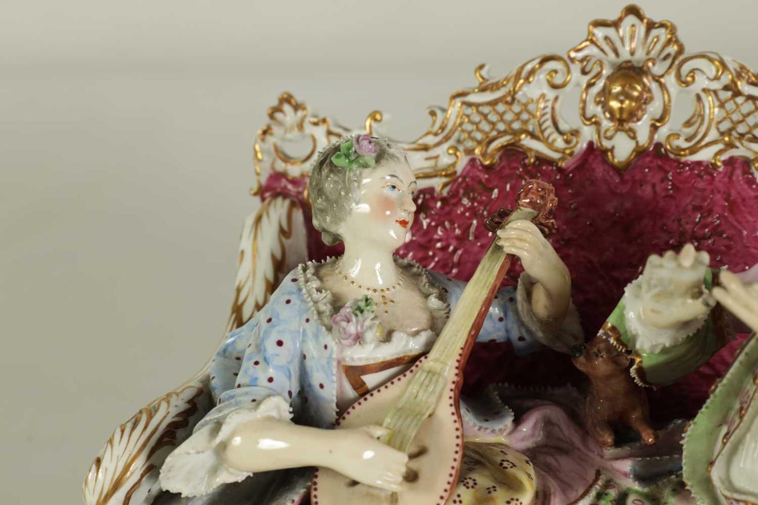 A LARGE LATE 19TH CENTURY MEISSEN-STYLE DRESDEN FIGURE GROUP OF MUSICIANS depicting a lady and gentleman seated on a French Rococo style settee dressed in elaborate coloured costume - indistinct mark beneath (20cm wide 13.5cm high )
