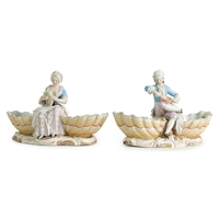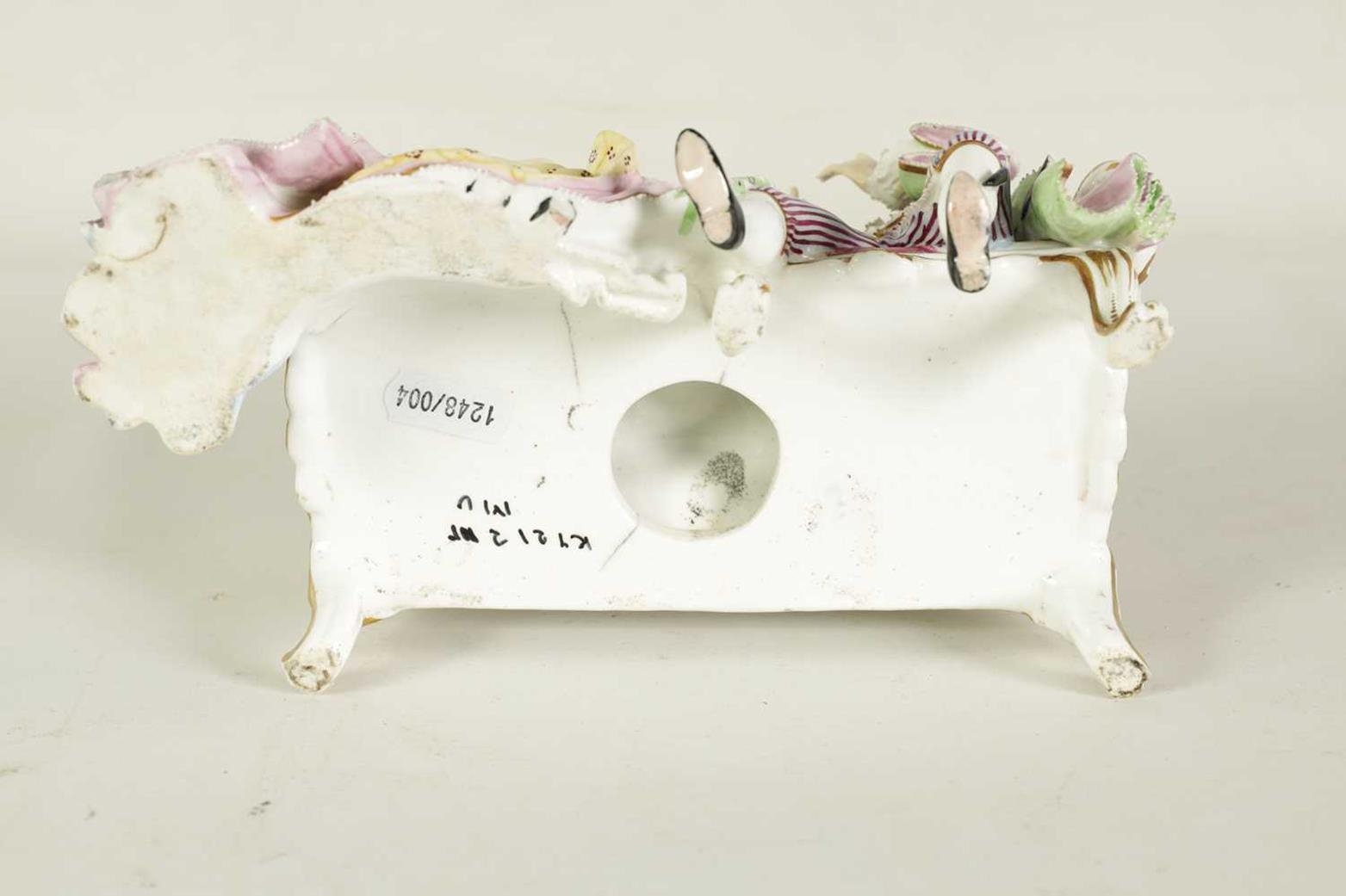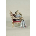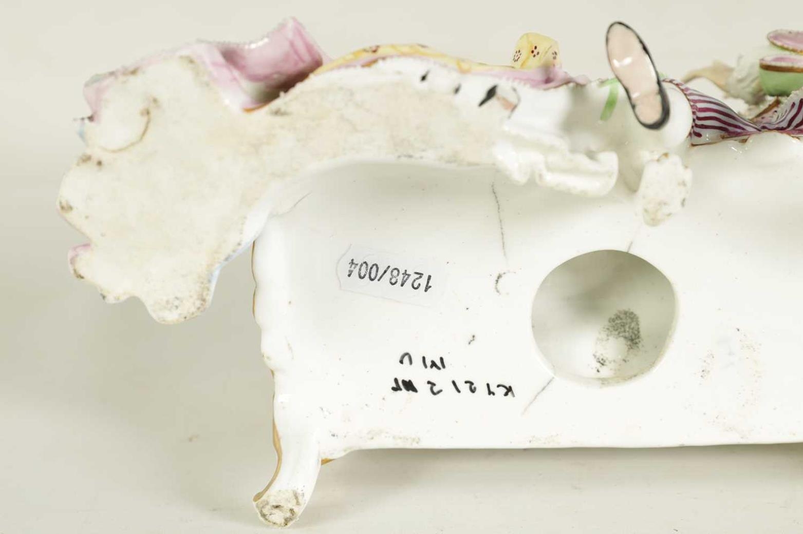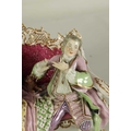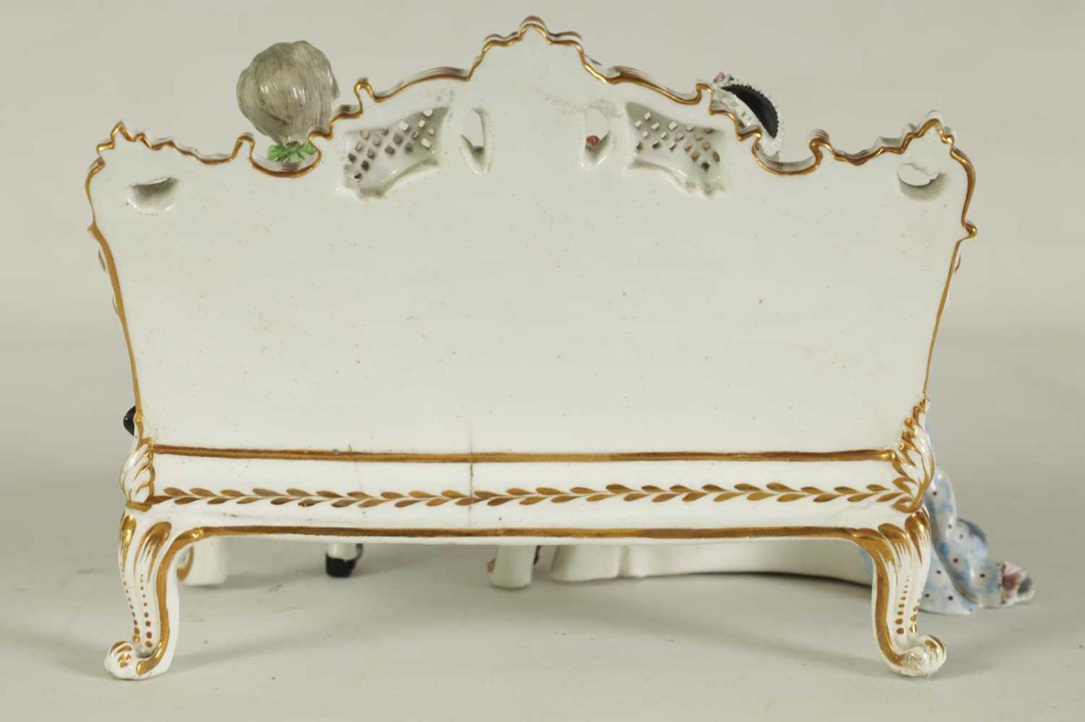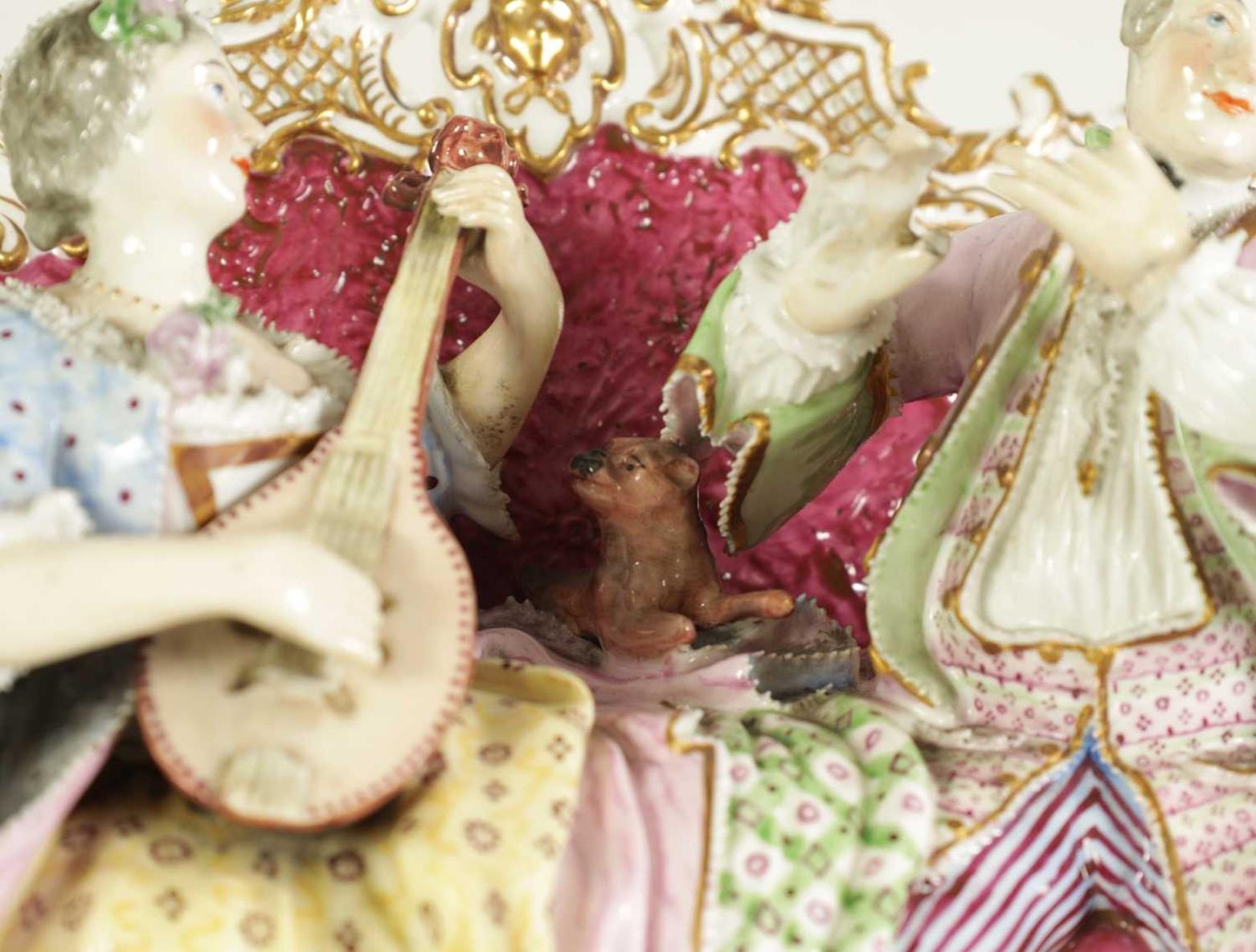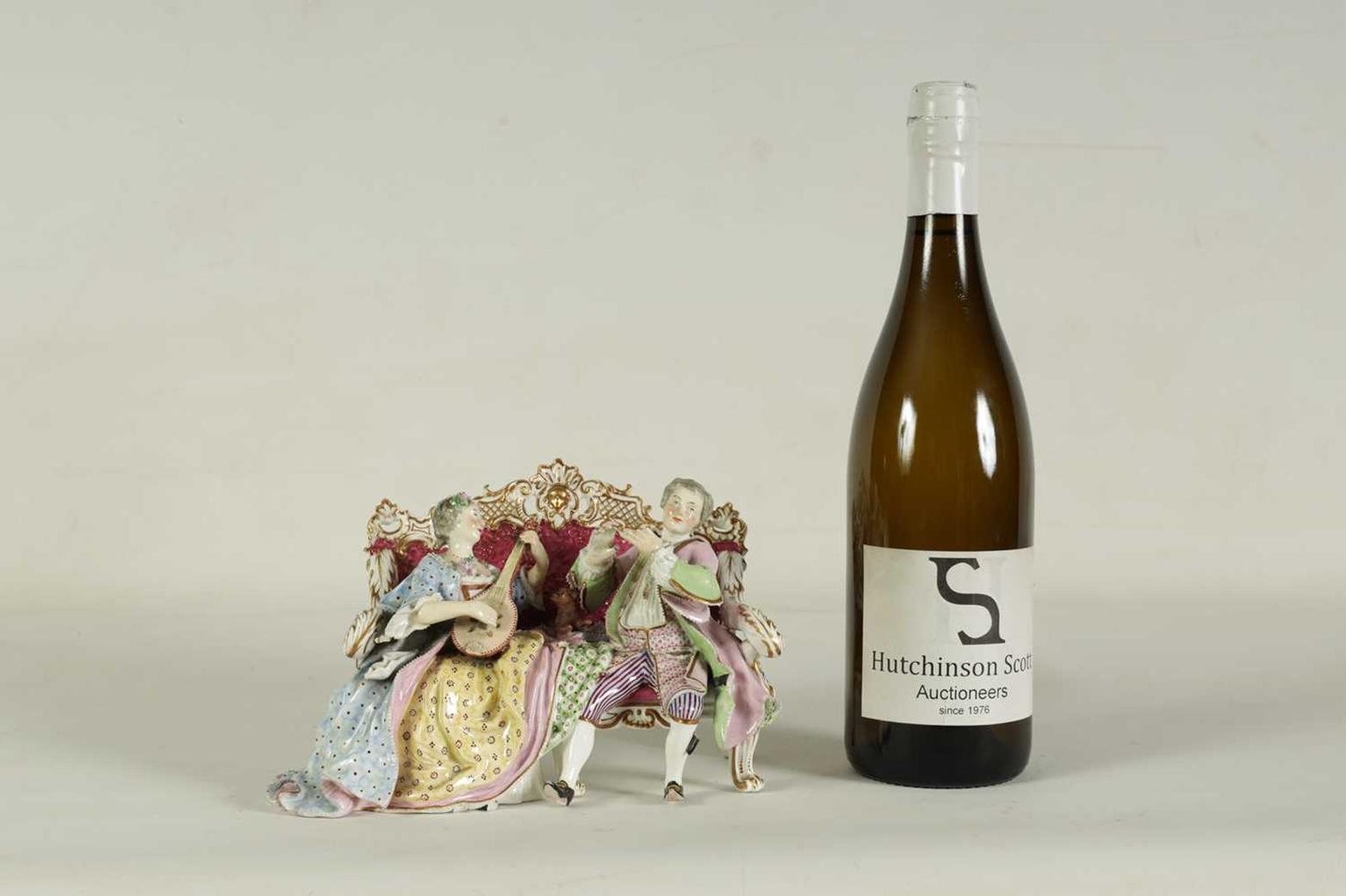 A LARGE LATE 19TH CENTURY MEISSEN-STYLE DRESDEN FIGURE GROUP OF MUSICIANS depicting a lady and gentleman seated on a French Rococo style settee dressed in elaborate coloured costume - indistinct mark beneath (20cm wide 13.5cm high )
