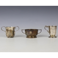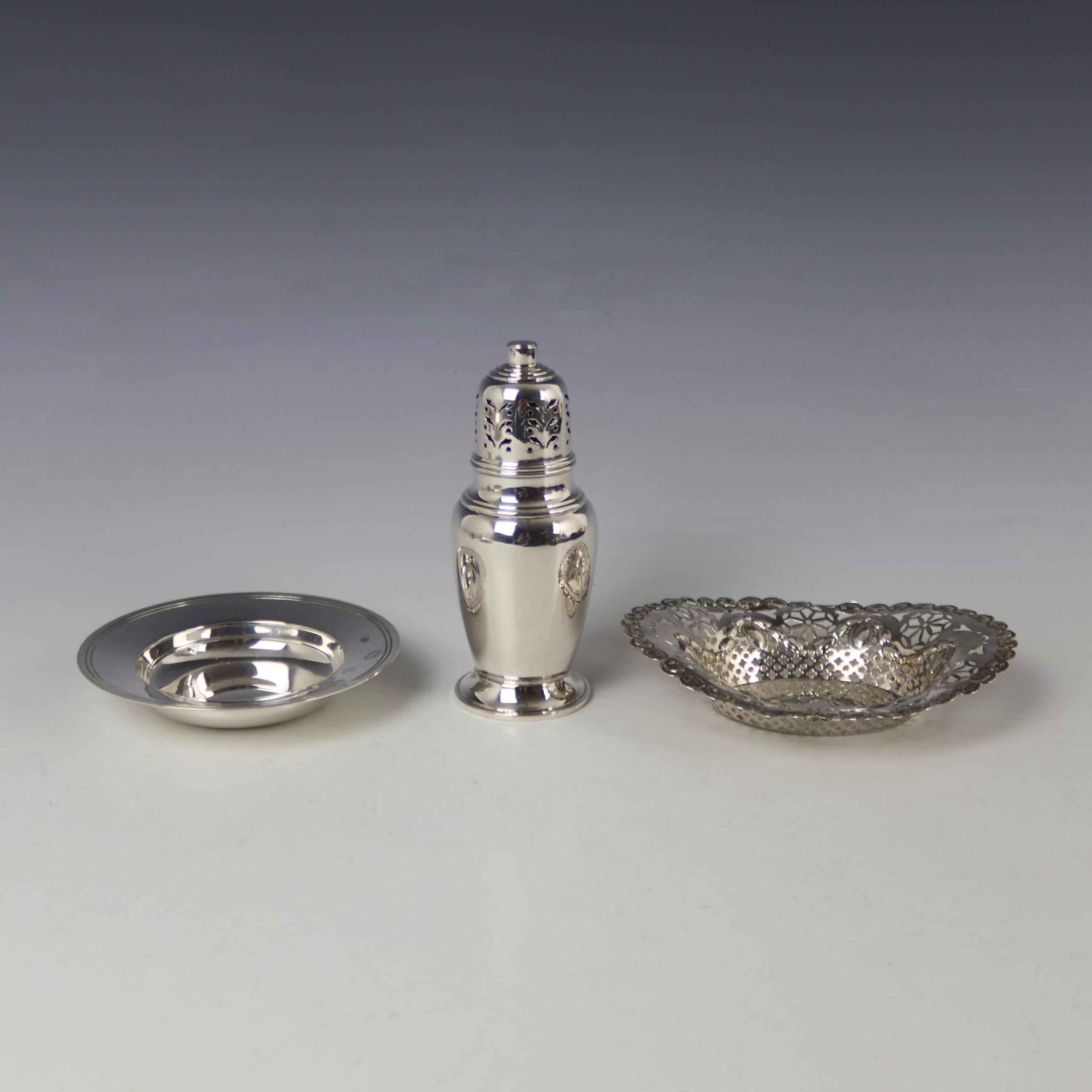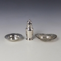 A Victorian silver bonbon dish, James Dixon & Sons Ltd, Sheffield 1897, of oval openwork form, 15cm wide, with a George VI silver sugar caster, William Greenwood & Sons, Birmingham 1937, 14cm high, and a further silver dish, gross weight 8ozt (3)