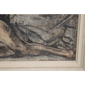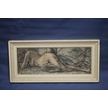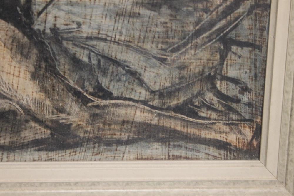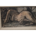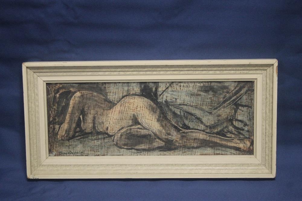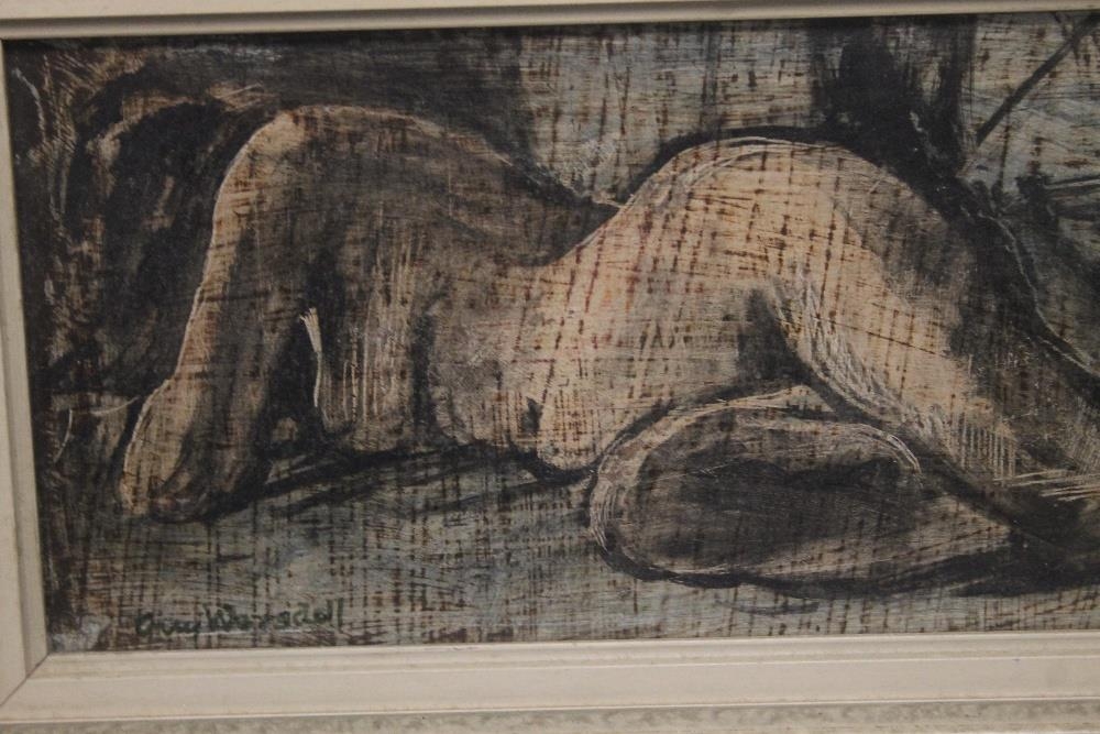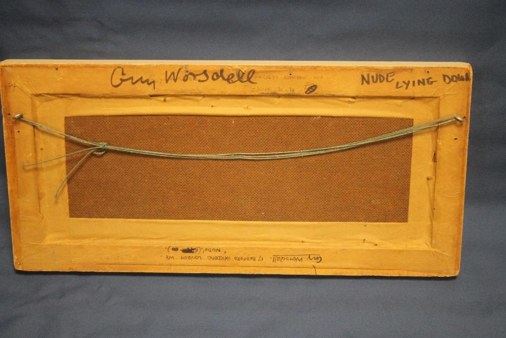 GUY WORSDELL OIL ON BOARD TITLED "NUDE LYING DOWN" SIGNED LOWER LEFT . INSCRIBED TO BACK OF FRAME