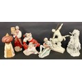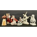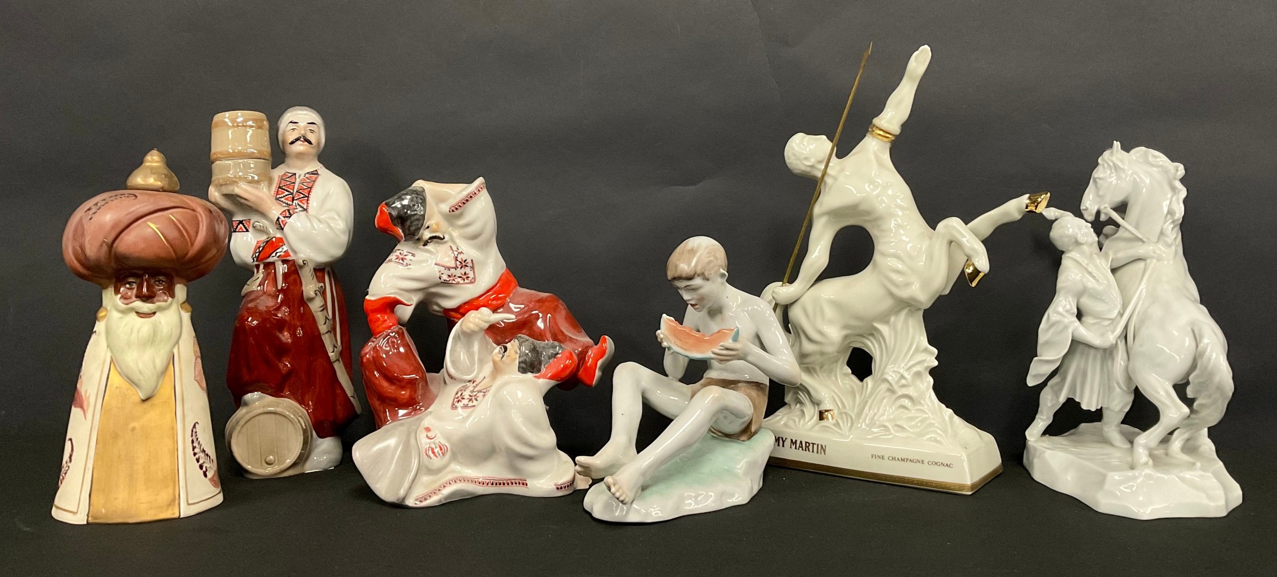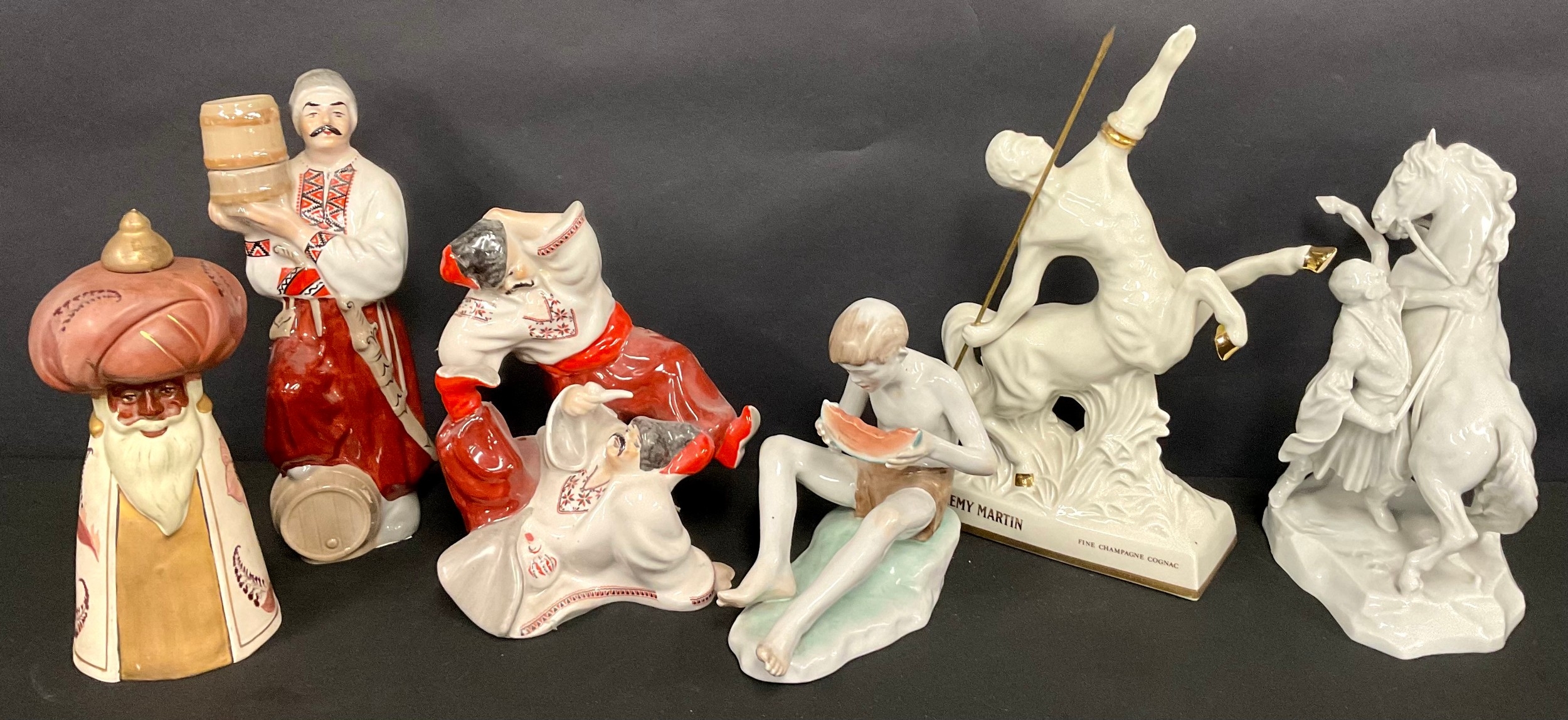 A Herend porcelain model, of a Cossack with rearing horse, in white, 25cm high,a/f; a Zsolnay model, of a boy with melon, painted in muted tones, 17cm high; a Limoges Remy Martin decanter, as a Centaur; a Ukranian porcelain figure group, as Ukranian dancers; a similar decanter; a Danish Mads Stage Danimerco candlestick, as a Wide Man (6)