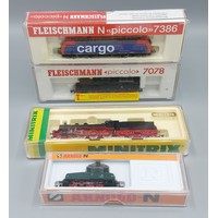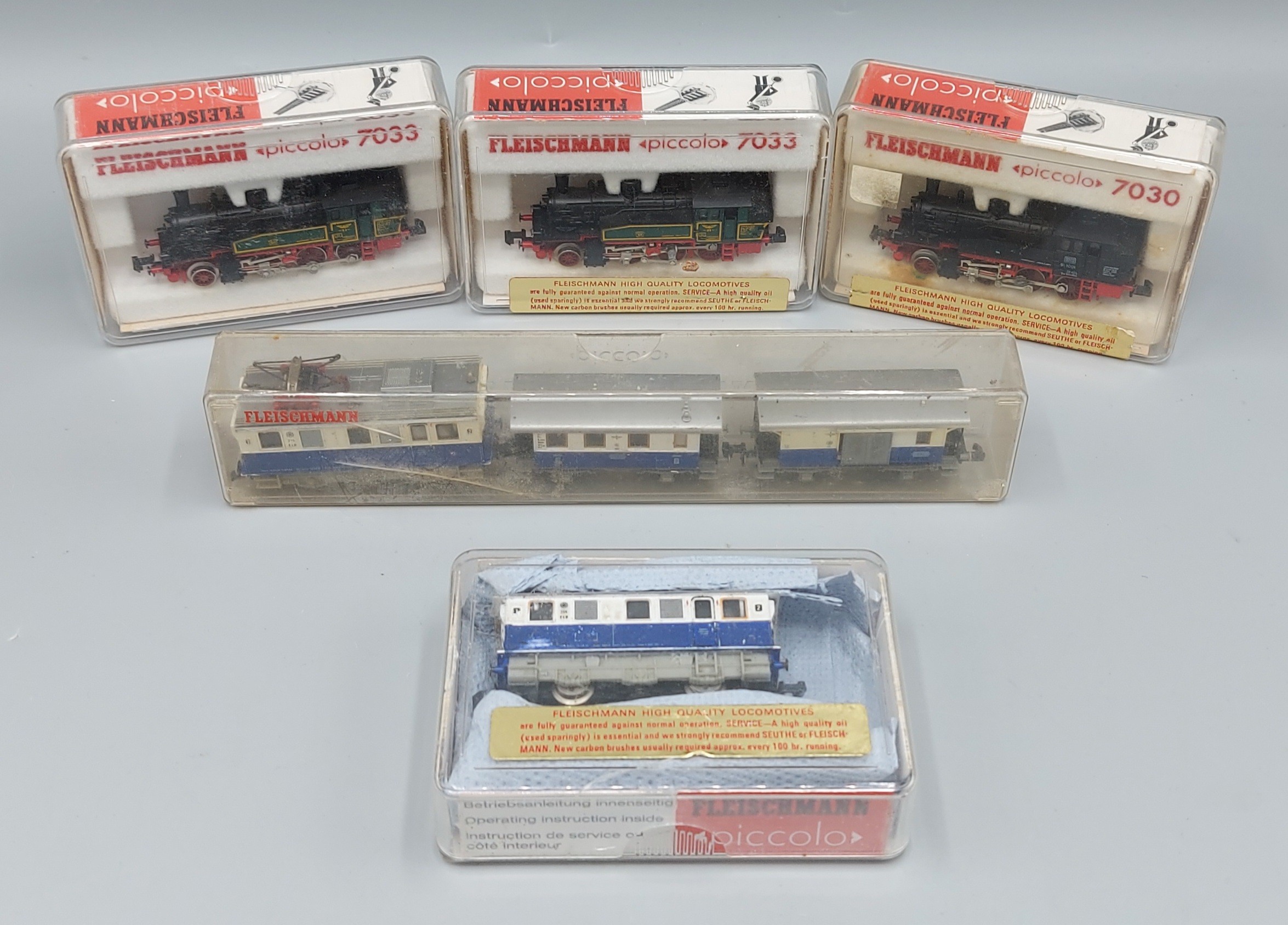 A Fleischmann locomotive number 7969 together with another 7030, another 7033, another 7033 and another Fleischmann locomotive with rolling stock