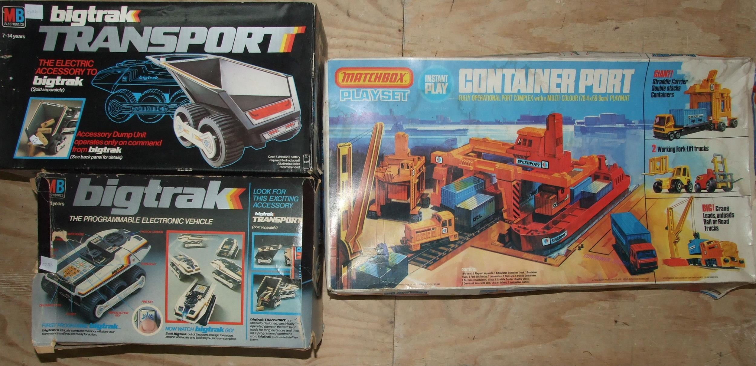 Big Trak Programmable Electronic Vehicle and Big Trak Transport, both boxed and a Matchbox Container Port set, boxed, (a/f, contents not checked), (3).
