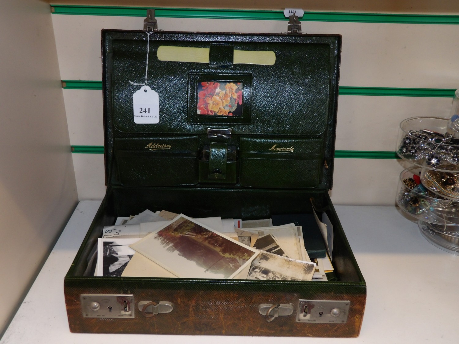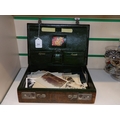 A vintage leather stationery box containing a diverse assortment of vintage photographs and ephemera