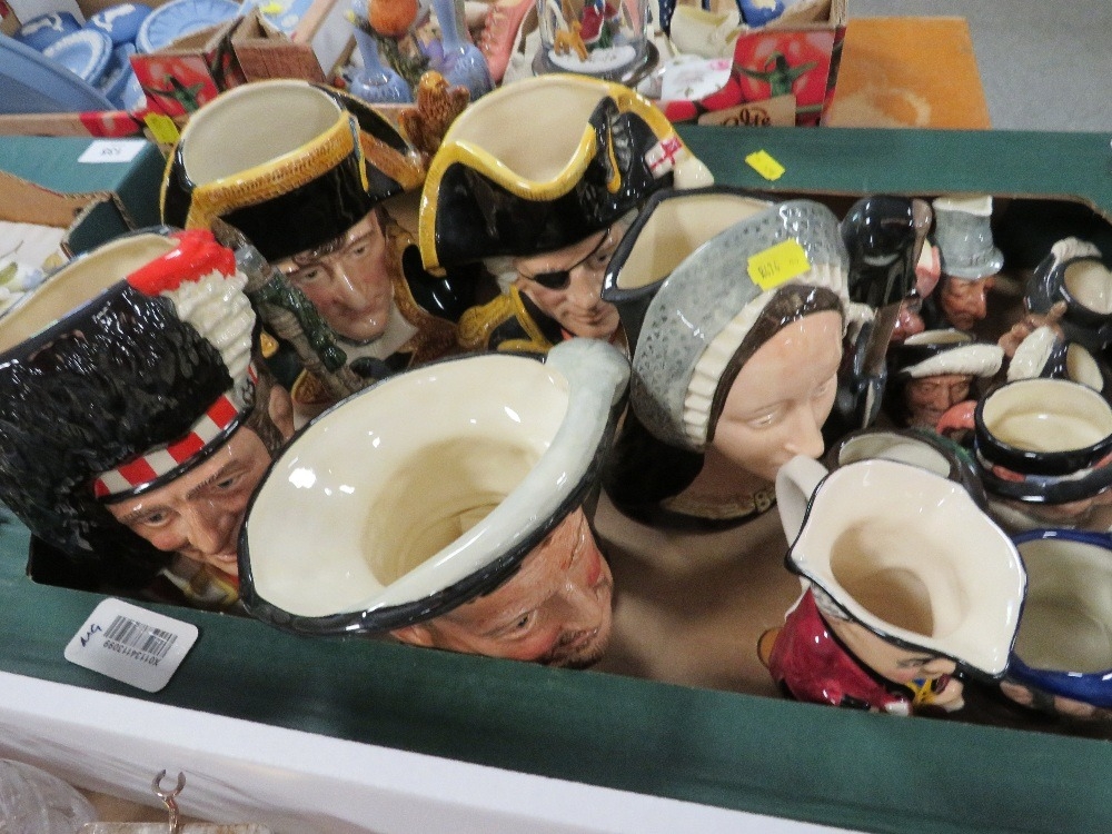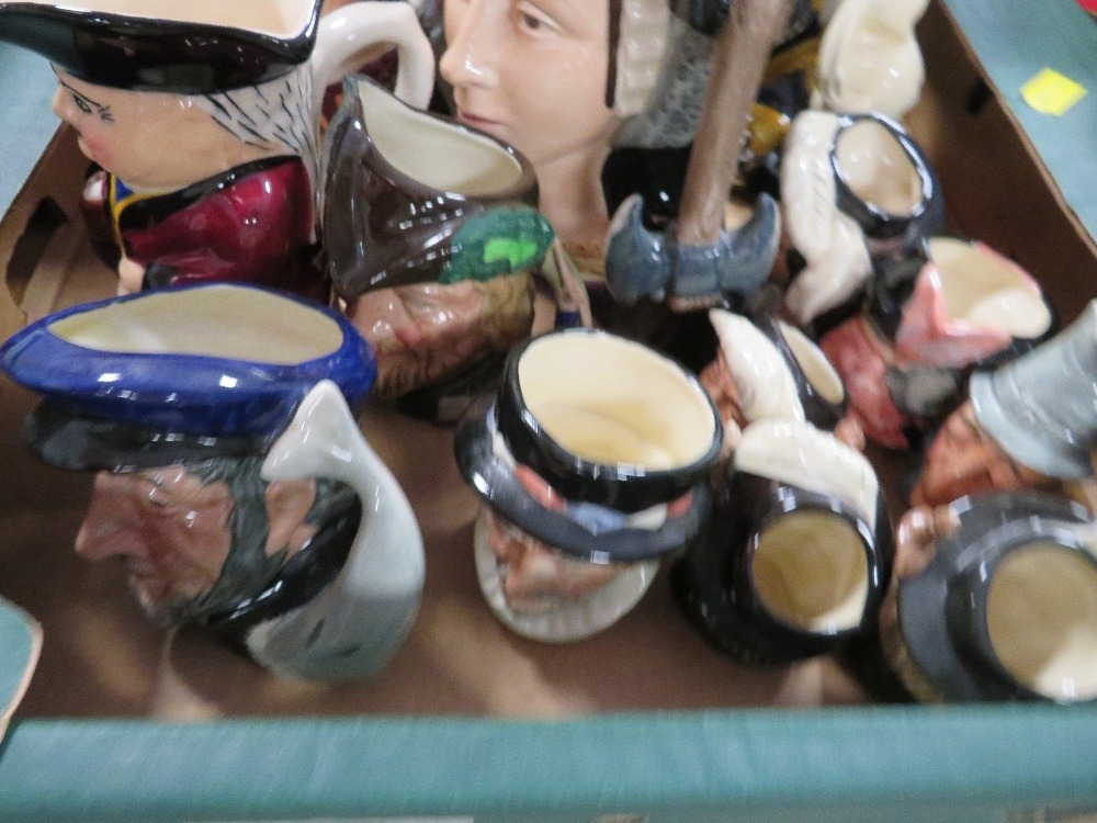A tray of assorted character jugs to include Royal Doulton The Piper
